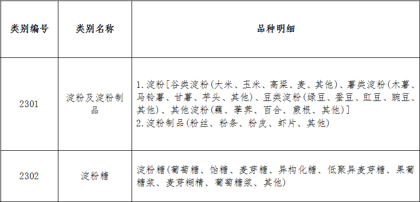 淀粉及淀粉制品類別編號(hào)及類別名稱:2301淀粉及淀粉制品;2302淀粉糖