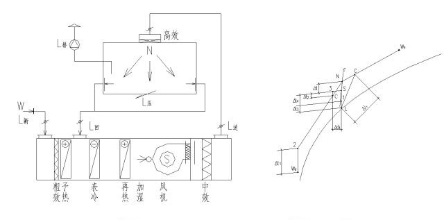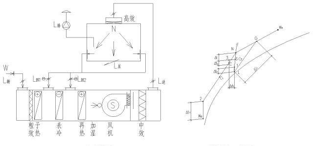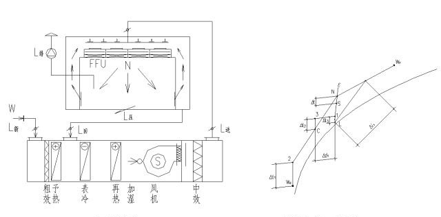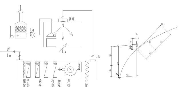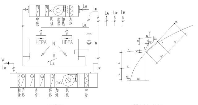 為了節能、消除空氣熱濕處理過程中的冷熱相互抵消,在潔凈室凈化送風量大于消除余熱、余濕的空調送風量時,最好采用一、二次回風方案,將二次混合點設計在系統送風點上,該方是最節能、最經濟的送風方案。其原理圖和焓濕圖如下: