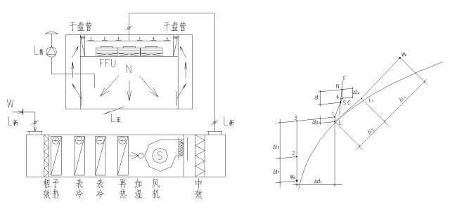 一次回風的送風方案多用在潔凈室內的發熱量或產濕量很大,消除室內余熱或余濕的送風量大于或等于凈化送風量的低潔凈度等級的非單向流潔凈室中。此方案的原理圖和焓濕圖如下: