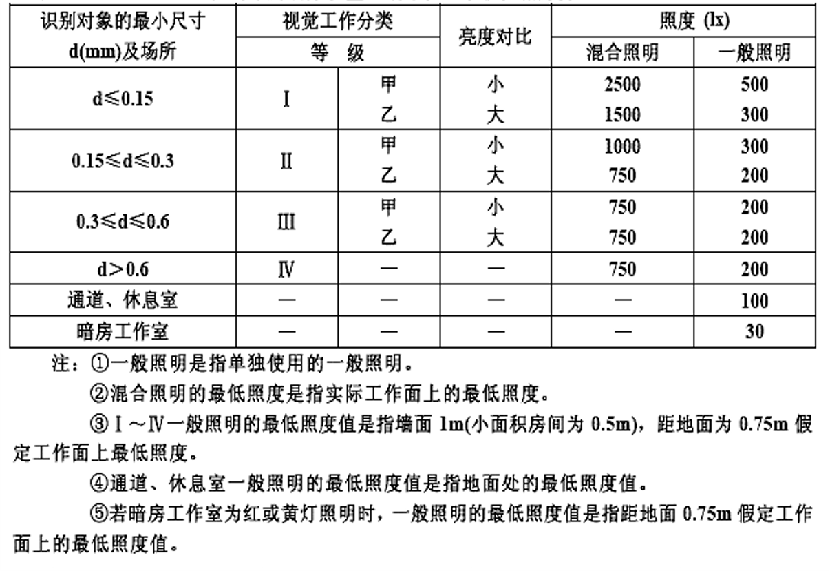 4、無采光窗潔凈區混合照明中的一般照明,其照度值應按各視覺等級相應混合照度值的10%~15%確定,并不低于200lx。
