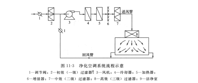 上圖所示的流程采用了一級初效、二級中效和三級高效過濾器,可用于任何潔凈等級的潔凈室。凈化空調系統的初效和中效過濾器一般集中布置在空調機房,而三級高效過濾器常布置在凈化空調系統的末端,如潔凈室的頂棚上,以防送入潔凈室的潔凈空氣再次受到污染。若潔凈室的潔凈等級低于D級,則凈化空調系統中可不設高效過濾器。若潔凈室內存在易燃易爆氣體或粉塵,則凈化空調系統不能采用回風,以防易燃易爆物質的積聚。
