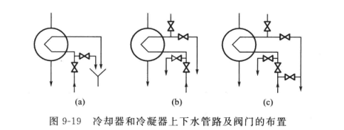 冷卻器和冷凝器的上下水管路及閥門的常見(jiàn)布置方式如圖9-19所示。圖9-19(a)用于開放式回水系統(tǒng),其排水漏斗應(yīng)布置在操作閥門時(shí)可觀察到的位置。圖9-19(b)和圖9-19(c)均用于密閉式回水系統(tǒng),后者的上、下水管間設(shè)有連通管,當(dāng)冬天設(shè)備停止運(yùn)行時(shí),水能繼續(xù)循環(huán)而不致凍結(jié)。