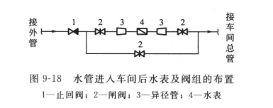 水管進(jìn)入車間后,應(yīng)先裝一個(gè)止回閥,然后再裝水表,以防停水或壓力不足時(shí)設(shè)備內(nèi)的水倒流至全廠的管網(wǎng)中,如圖9-18所示。