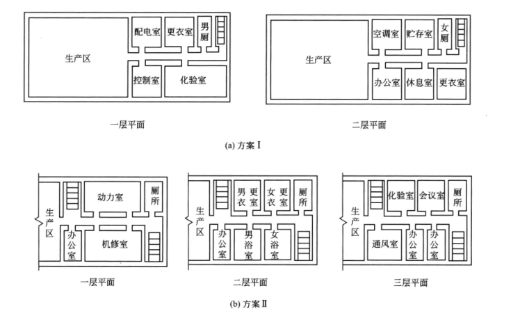 一般地,生產(chǎn)規(guī)模較小的車(chē)間,可將非生產(chǎn)區(qū)布置在車(chē)間的一個(gè)區(qū)域內(nèi),即采用集中式布置形式。由于生產(chǎn)區(qū)用房的高度一般較高,而非生產(chǎn)區(qū)用房的高度往往較低,如3m、3.3m和3.6m等,因此,生產(chǎn)區(qū)常采用單層,而非生產(chǎn)區(qū)則可采用多層。