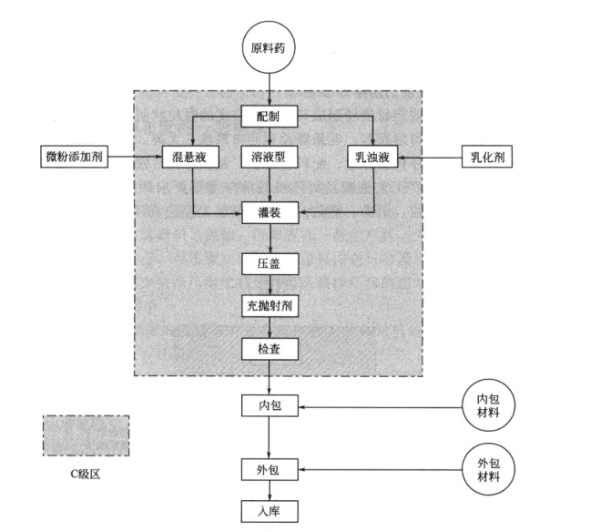氣霧劑的主要生產(chǎn)工序包括稱量、配制、灌裝、壓蓋、充拋射劑、檢查、內(nèi)包裝、外包裝和入庫等,其生產(chǎn)工藝流程及對環(huán)境的潔凈等級要求如圖1所示,其中稱量、配制、灌裝、壓蓋、充拋射劑、檢查等工序應(yīng)在不低于C級的潔凈環(huán)境中進行。