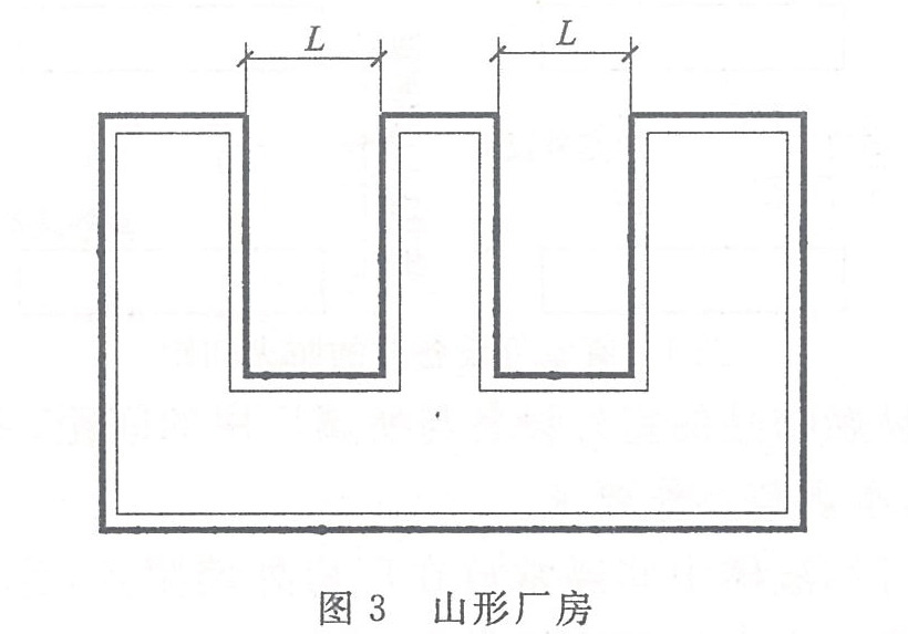 3.4.7 對于圖3所示的“山形”、“凵形”等類似形狀的廠房,建筑的兩翼相當于兩座廠房。本條規定了建筑兩翼之間的防火間距(L),主要為便于滅火救援和控制火勢蔓延。但整個廠房的占地面積不大于本規范第3.3.1條規定的一個防火分區允許最大建筑面積時,該間距L可以減小到6m。