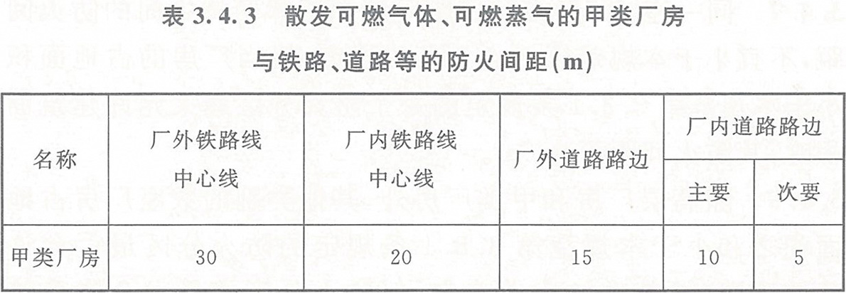 3.4.3 散發可燃氣體、可燃蒸氣的甲類廠房與鐵路、道路等的防火間距不應小于表3.4.3的規定,但甲類廠房所屬廠內鐵路裝卸線當有安全措施時,防火間距不受表3.4.3規定的限制。