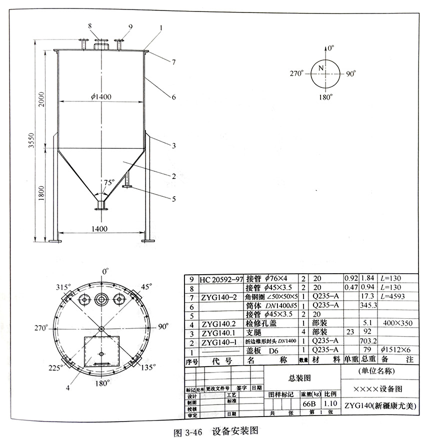 管口方位圖是食品工廠設(shè)計制造設(shè)備時確定各管口方位、管口與支座、地腳螺栓等相對位置用的,也是設(shè)備安裝時確定安裝方位的依據(jù)。內(nèi)容如下: