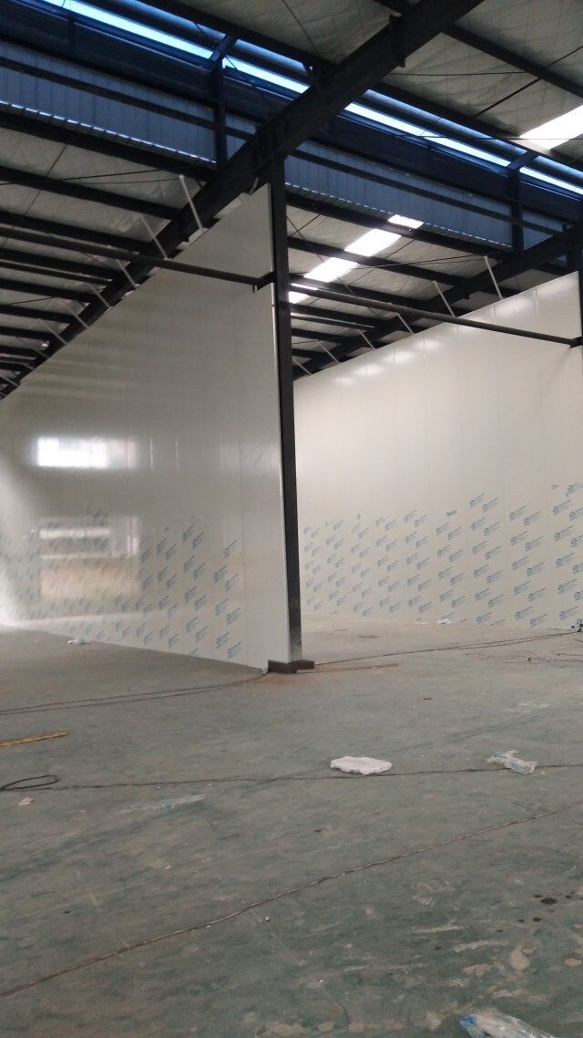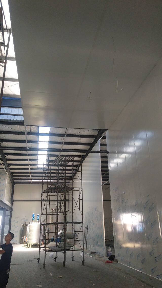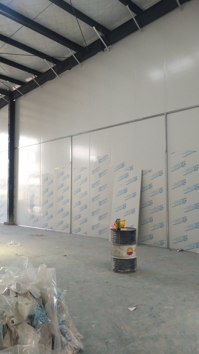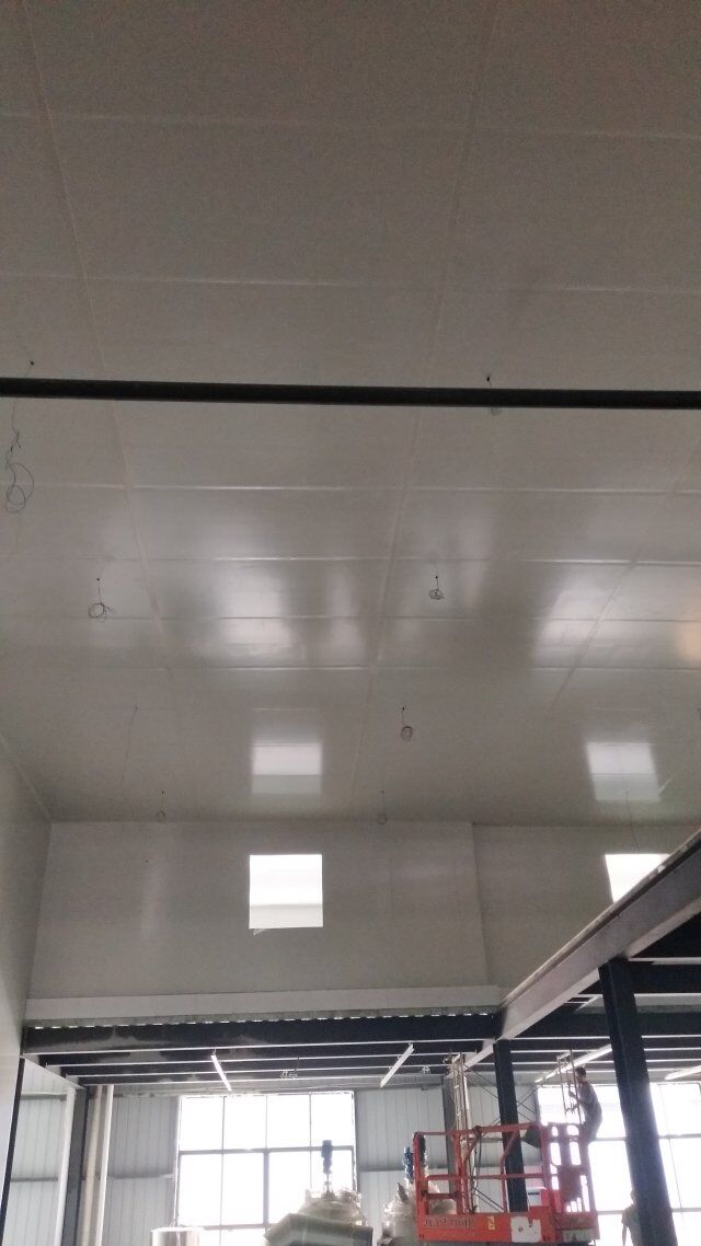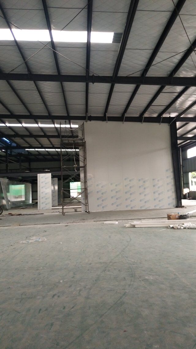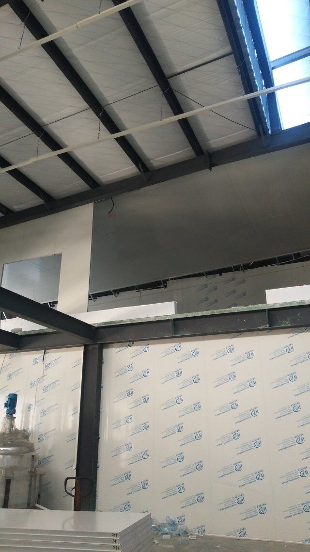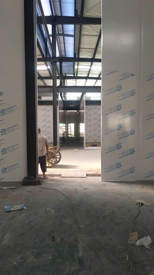 成都天廚生物科技有限公司廠房裝修現(xiàn)場,墻板施工中