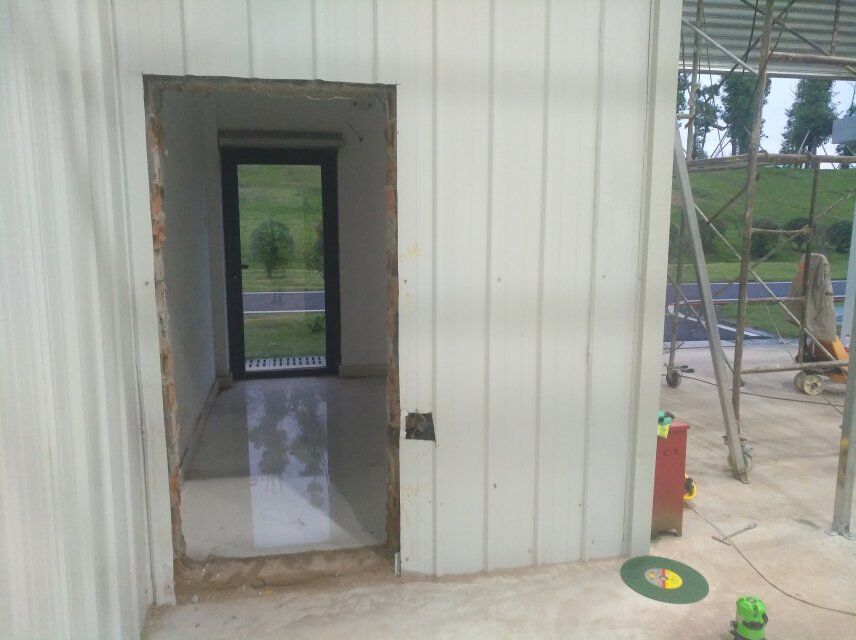 四川聚峰谷農業科技開發有限公司廠房裝修現場,地坪清理,板材開始安裝中