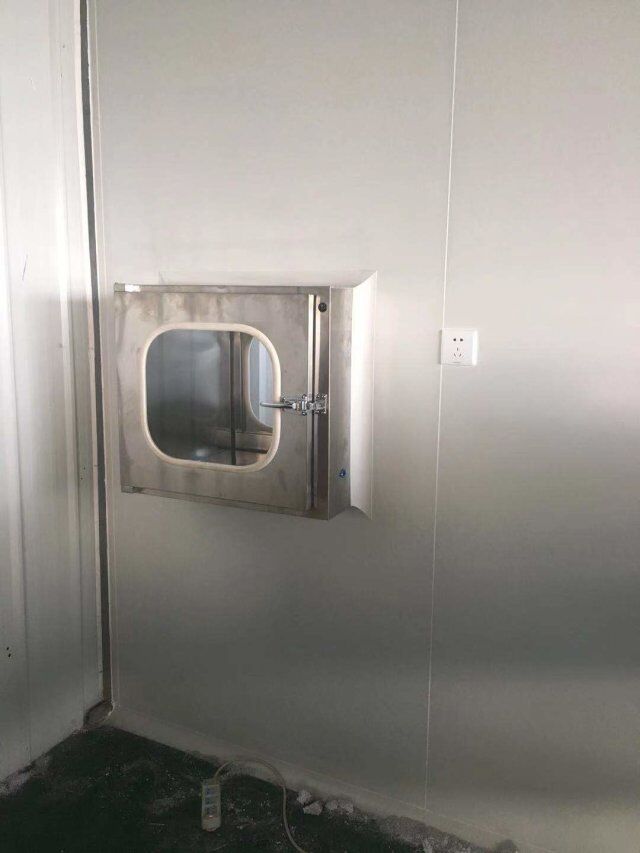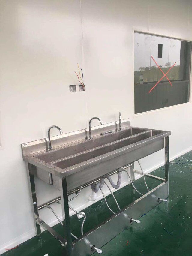 1,水電安裝完成, 2,傳遞窗,不銹鋼洗手池安裝完成, 3,彩鋼收尾完成
