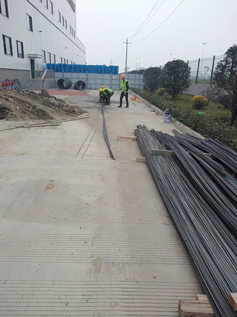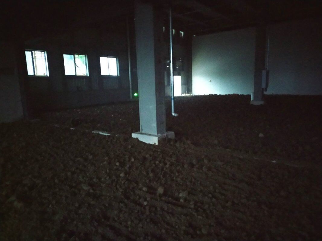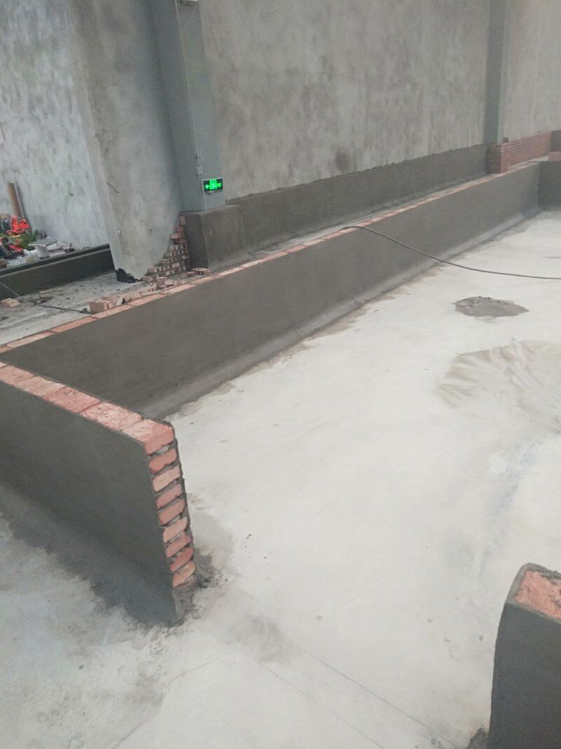車間施工現場,鋼筋預制捆扎完成,擋水墻抹灰施工,排水溝貼磚完。