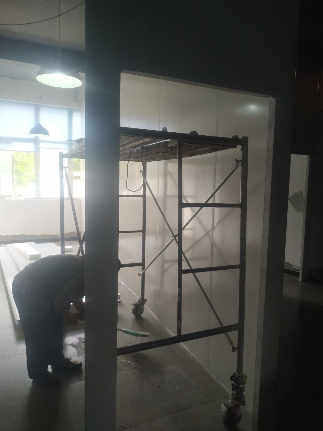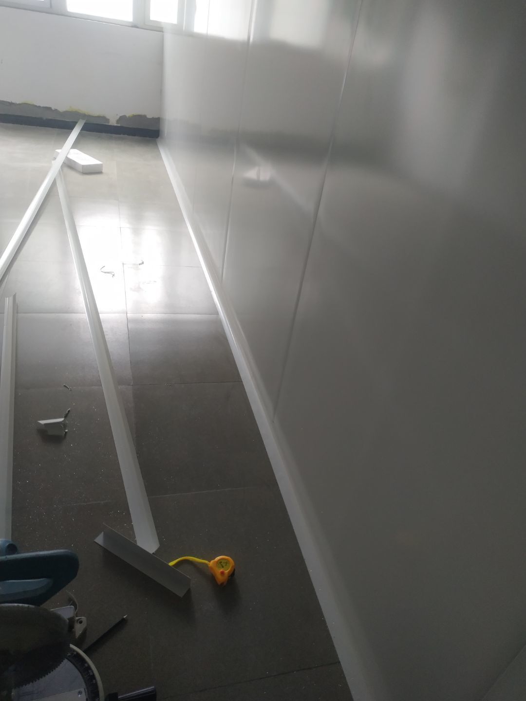 1.增項墻體拆除完成,窗簾盒安裝完成。2.彩鋼立板安裝,門框料預制完成,門框安裝完成50%,撕膜完成,打膠完成25%,塑料底座安裝完成40%,圓弧安裝完成20%。