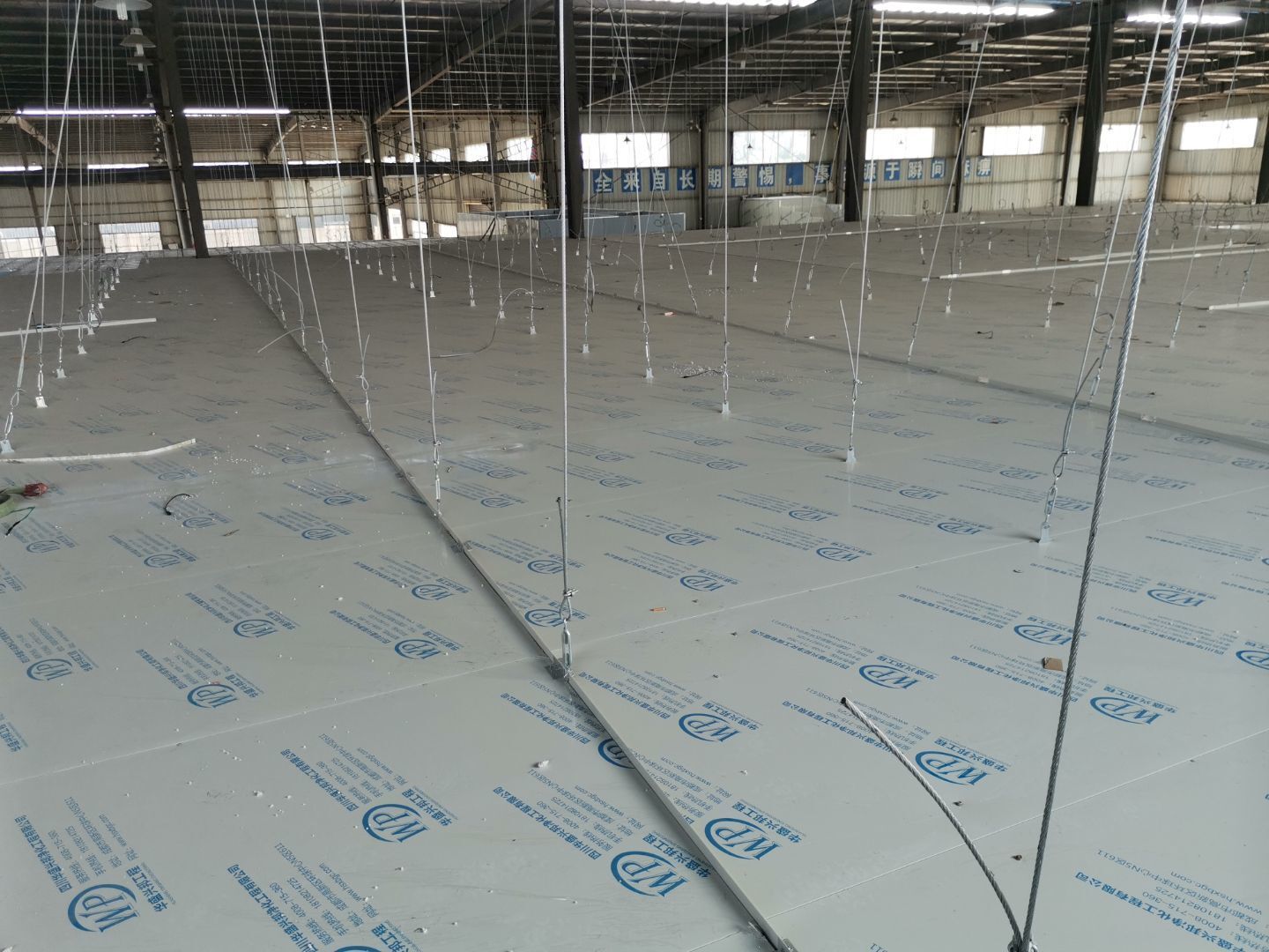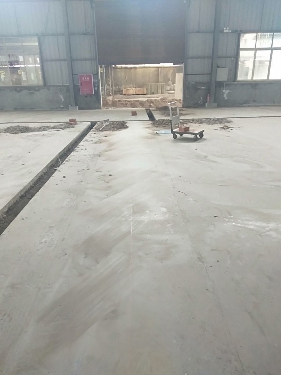 1、 吊筋安裝完成70%,頂板安裝完成70%; 2、彩鋼墻板安裝完成95%,門洞開設(shè)完成90%,自制門框下料完成100%; 3、地坪打磨第二遍完成100%; 4、水電燈具安裝完成70%,插座定位開孔完成70; 5、彩鋼圓弧安裝完成50%; 6、原水溝混凝土面層修補完成75%; 7、紗窗安裝完成100%; 8、場地清理。
