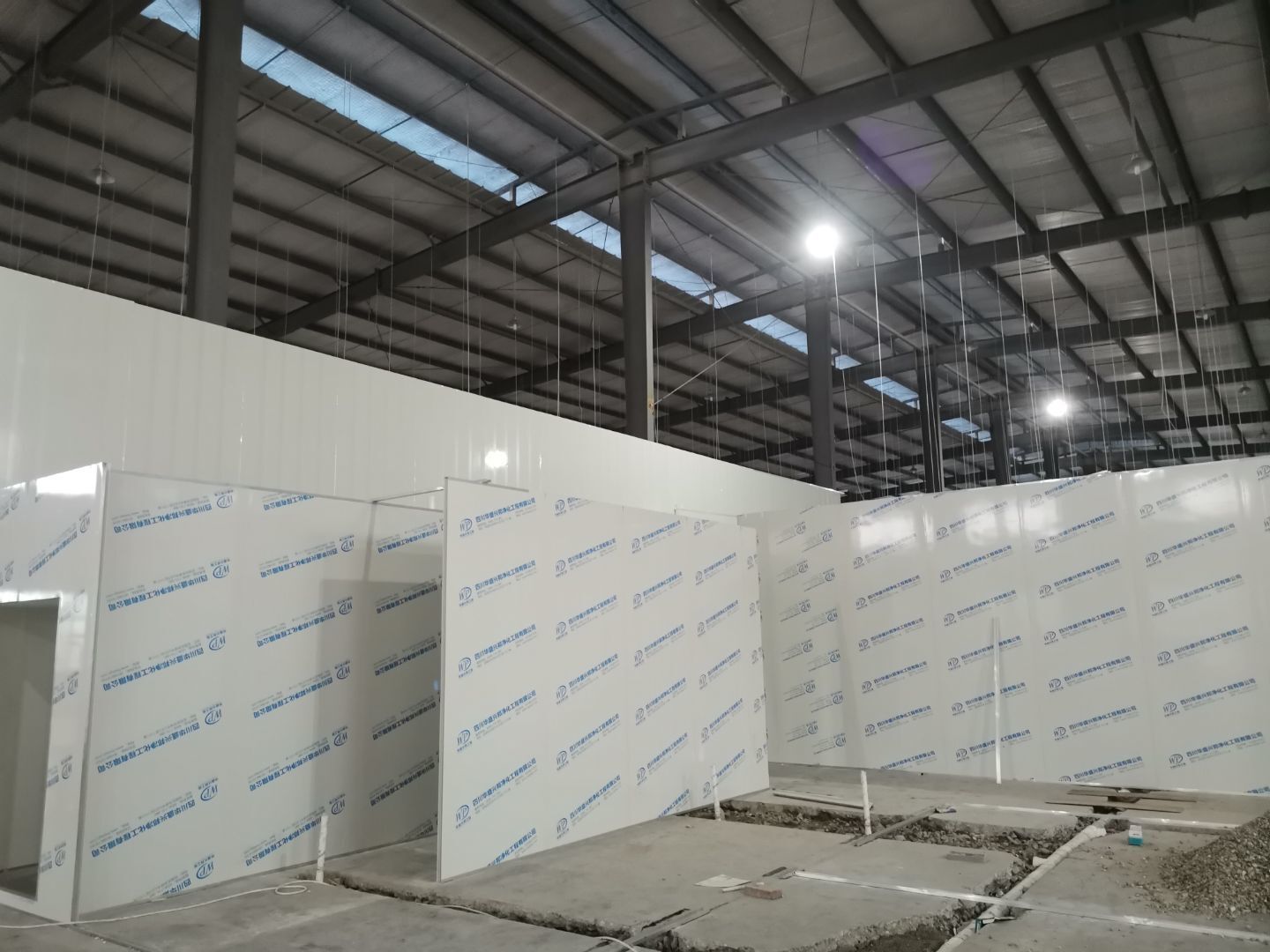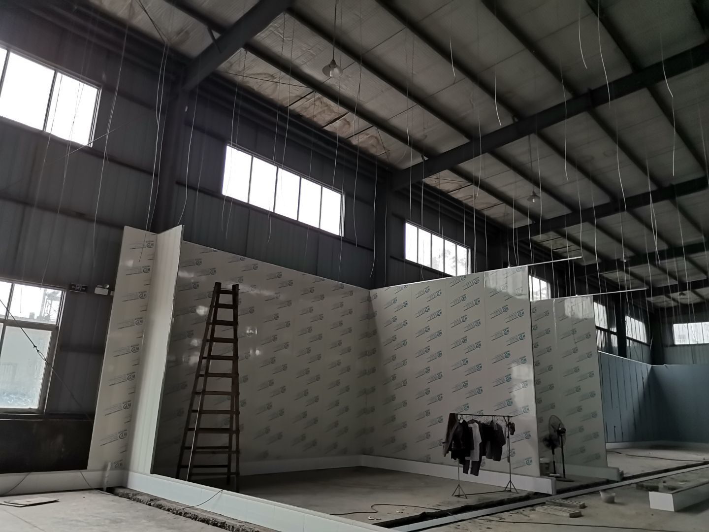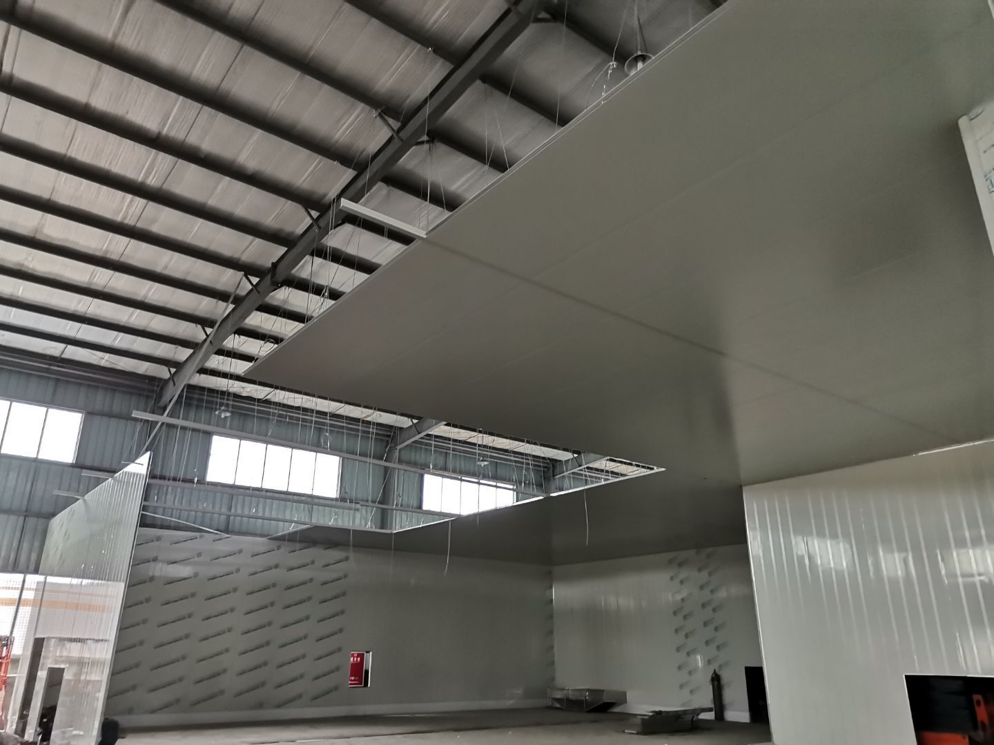 吊筋安裝完成,頂板安裝;彩鋼墻板安裝,門洞開設(shè)完成,水電燈具安裝,插座布線;彩鋼圓弧安裝