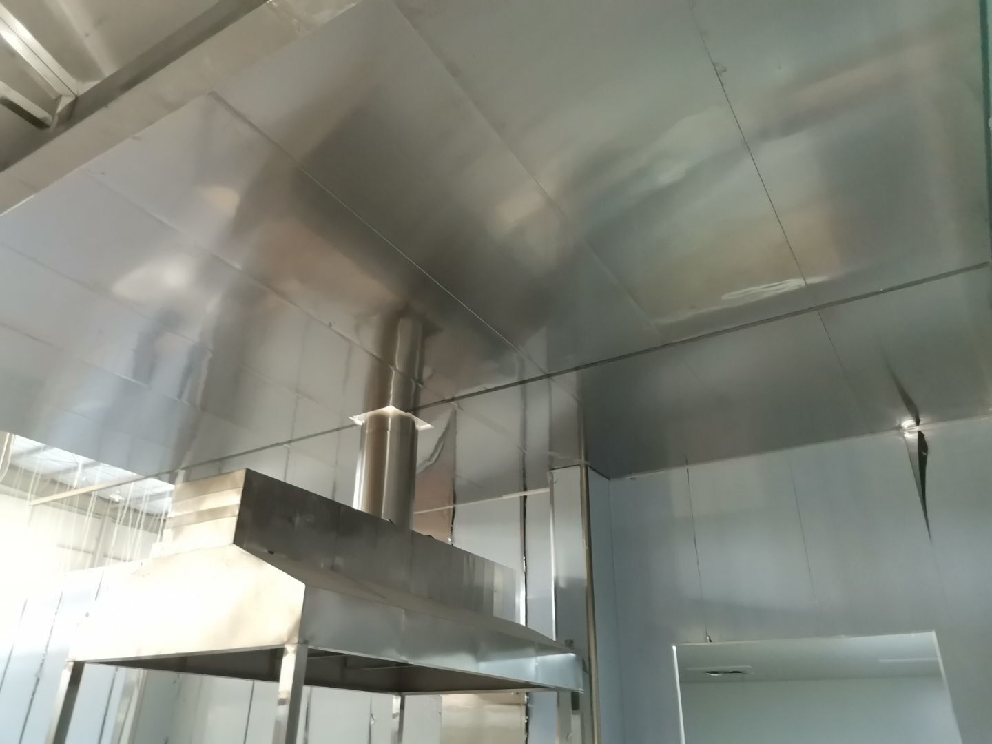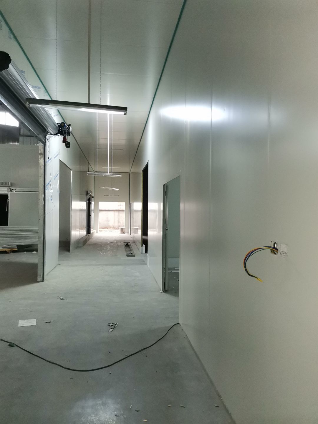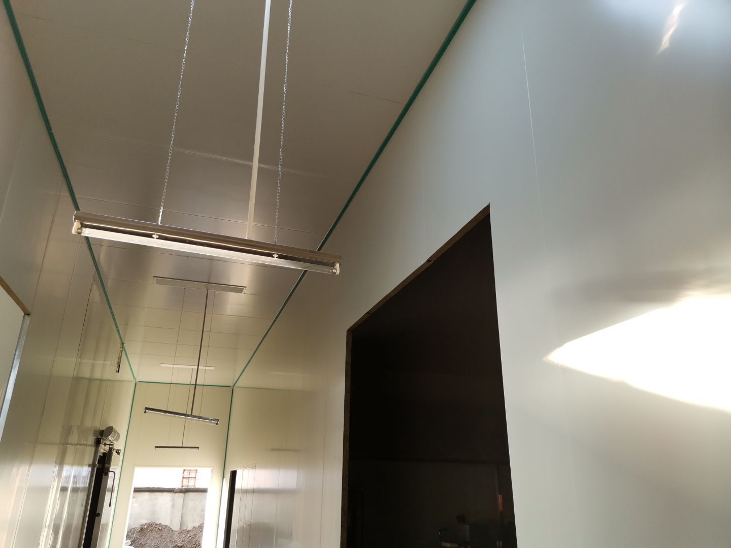 吊筋安裝完成,頂板安裝;彩鋼墻板安裝,門洞開設(shè)完成,水電燈具安裝,插座布線;彩鋼圓弧安裝