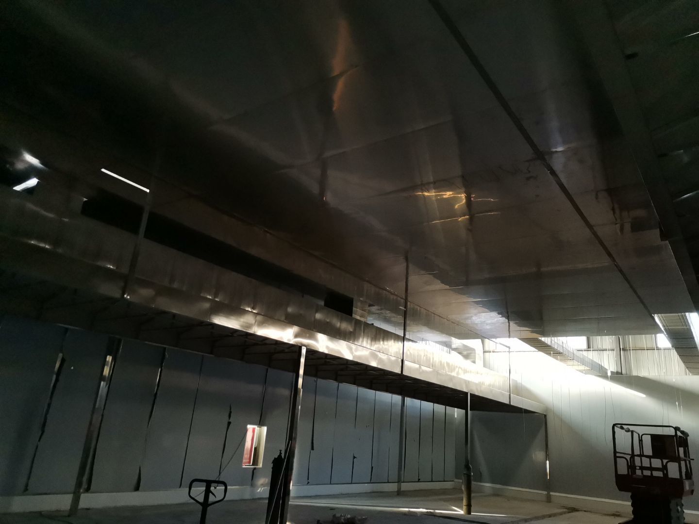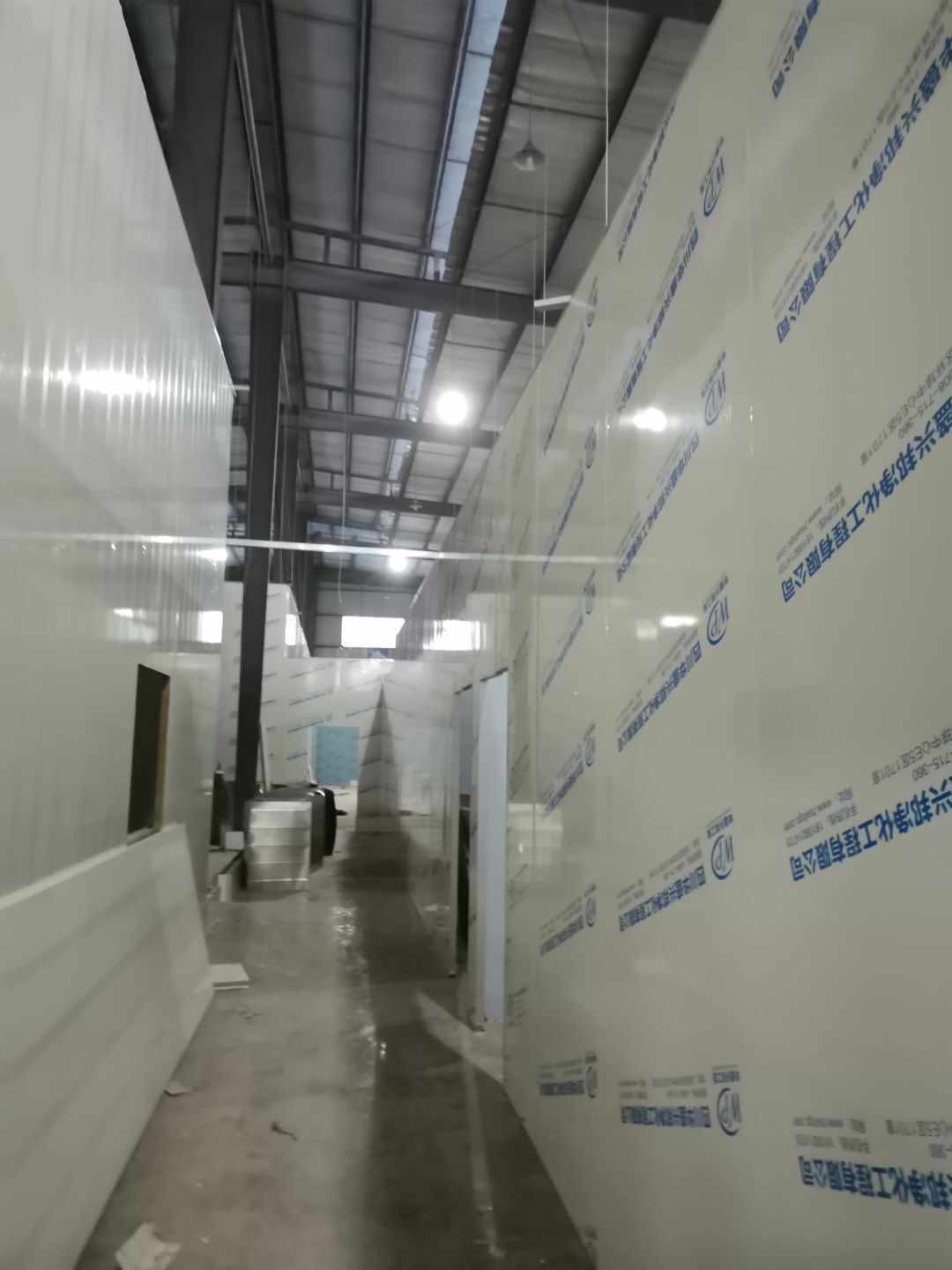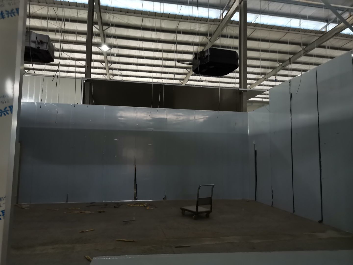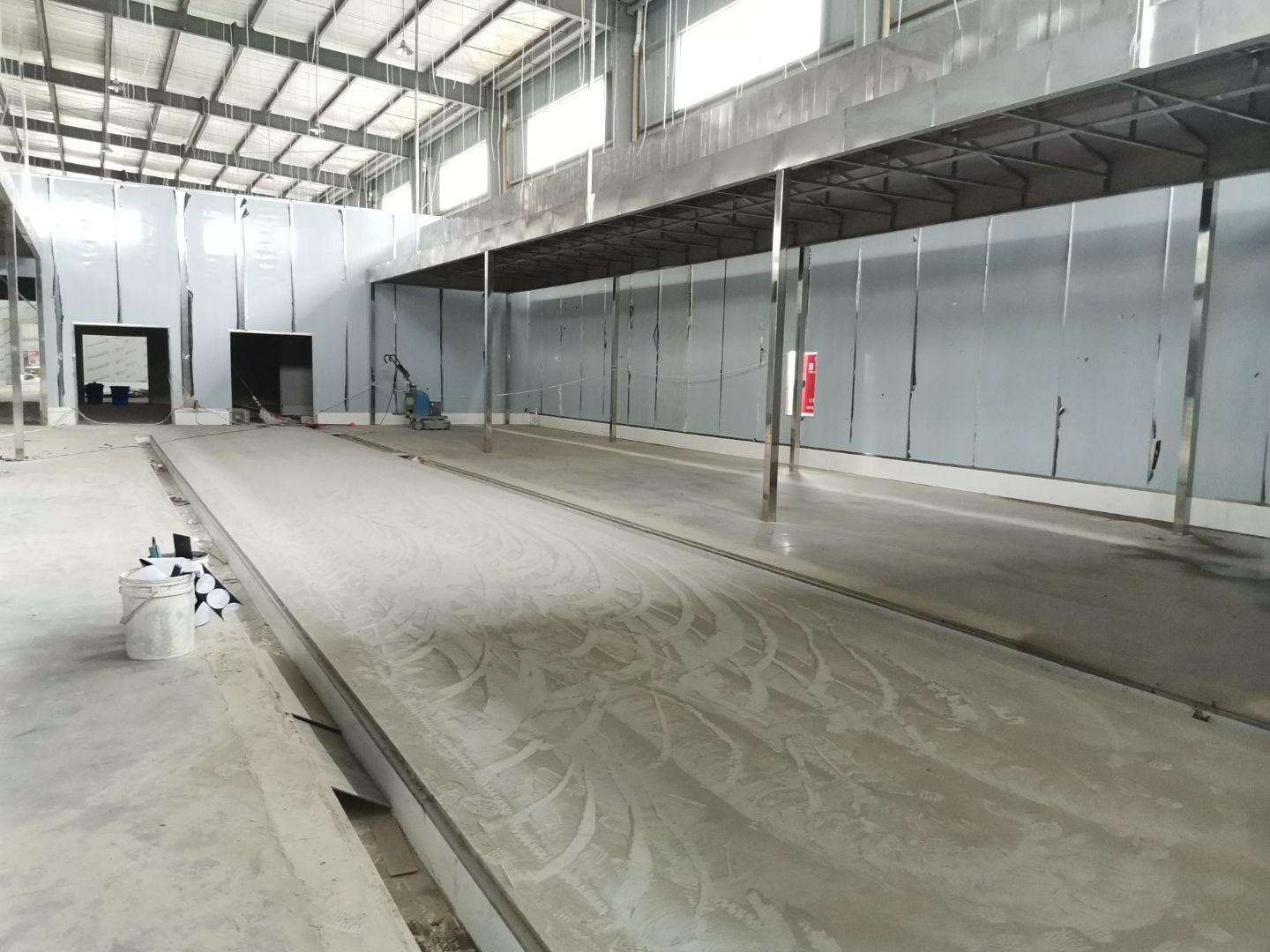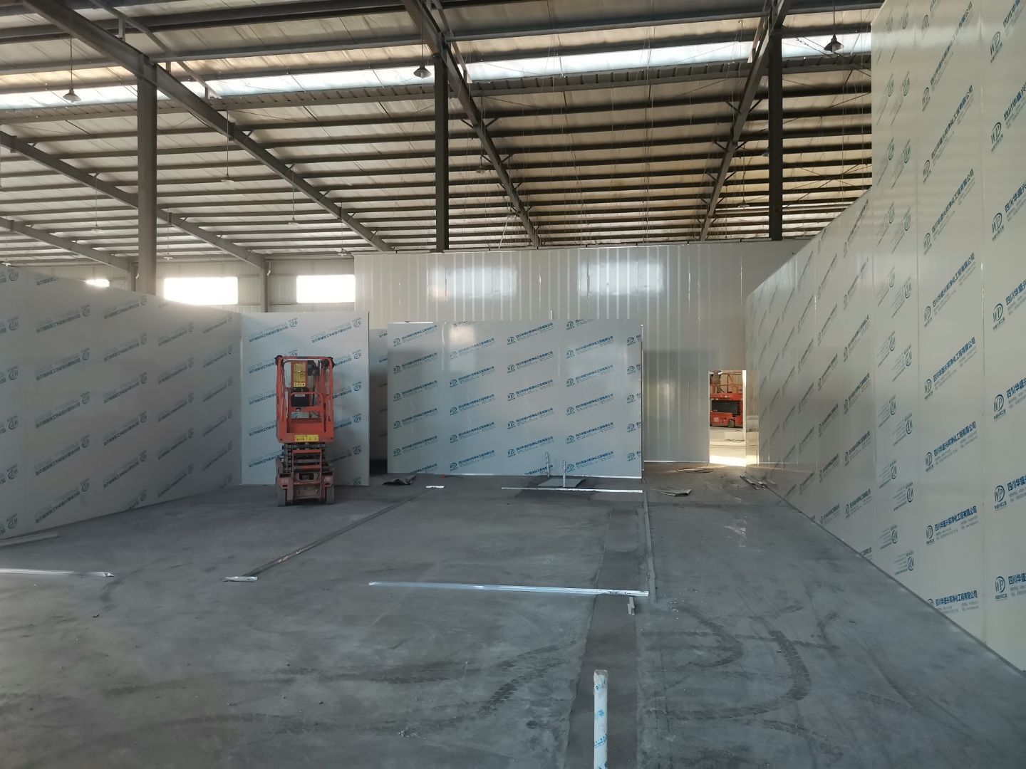 1、 吊筋安裝完成70%,頂板安裝完成70%; 2、彩鋼墻板安裝完成95%,門洞開設(shè)完成90%,自制門框下料完成100%; 3、地坪打磨第三遍完成100%; 4、水電燈具安裝完成90%,插座定位開孔完成100; 5、彩鋼圓弧安裝完成70%; 6、原水溝混凝土面層修補完成100%; 7、墻板撕膜打膠完成45%; 8、冷風(fēng)機主機安裝完成100%,風(fēng)管安裝完成15%; 9、場地清理。