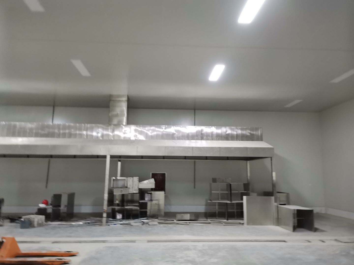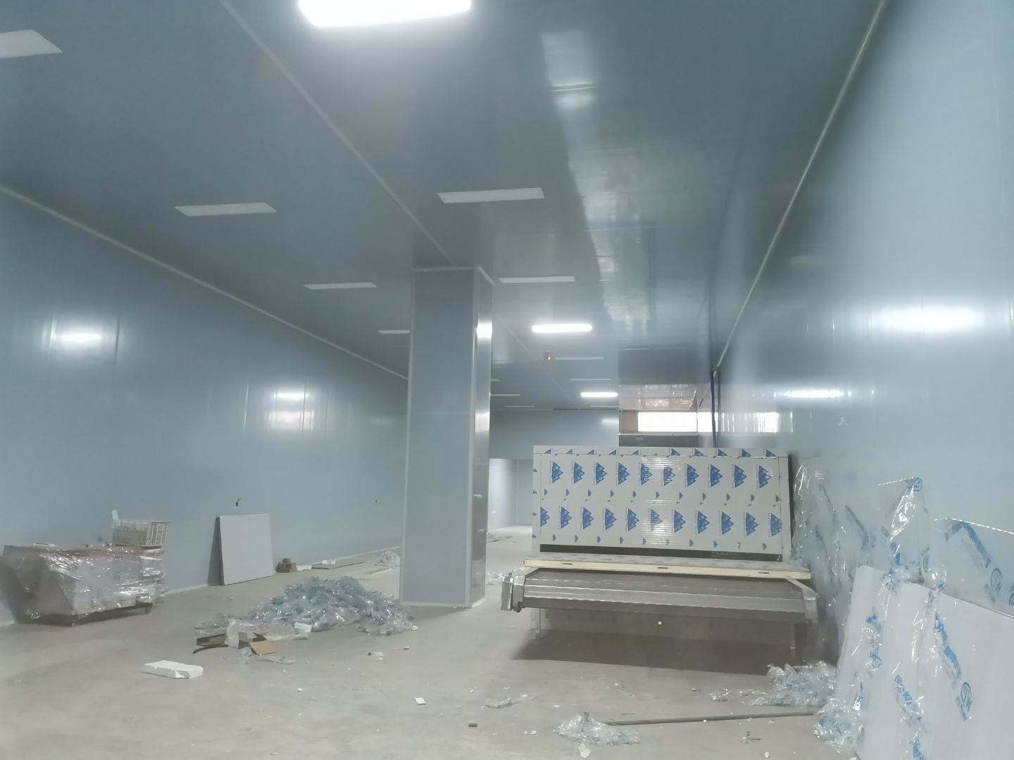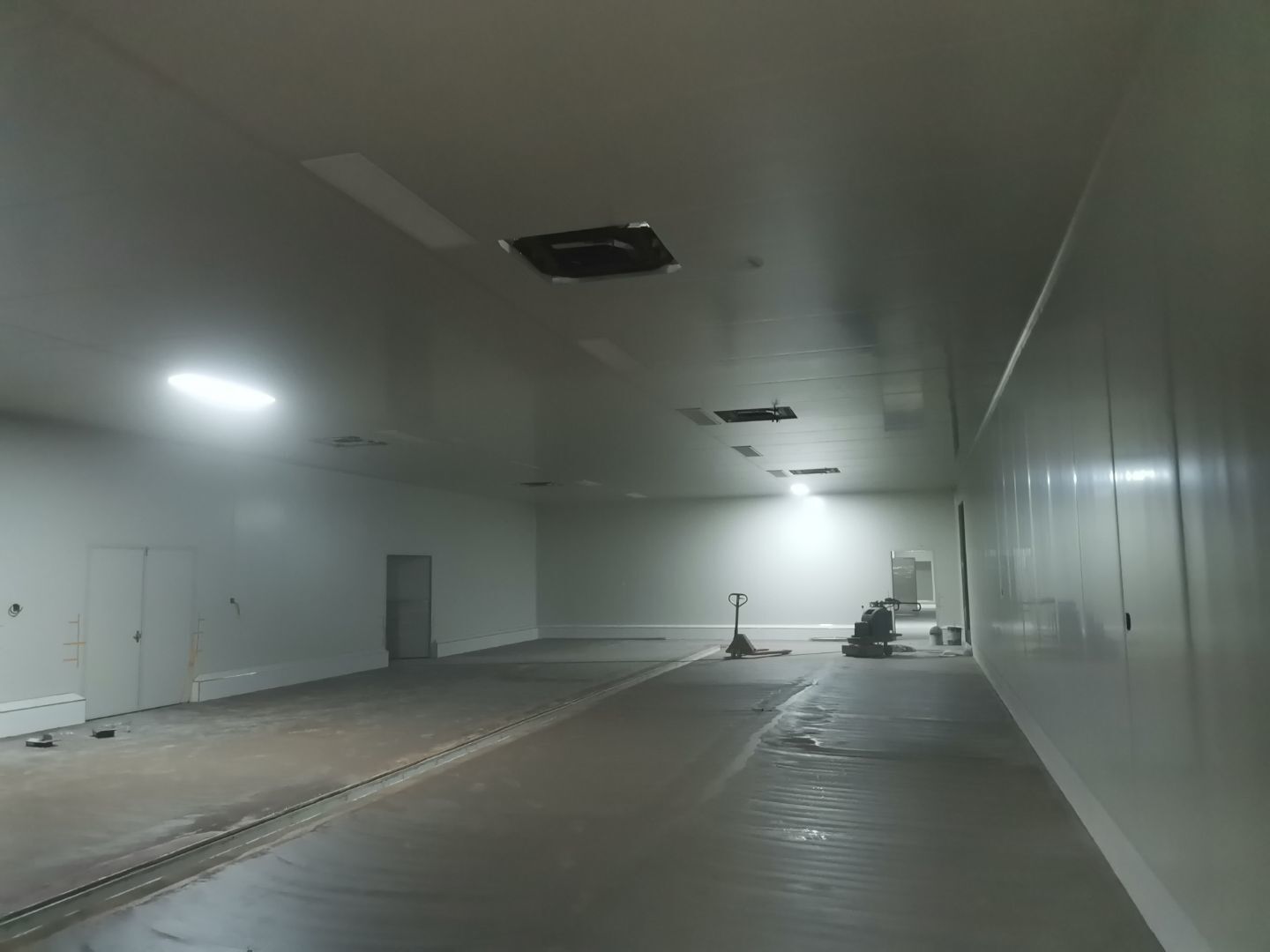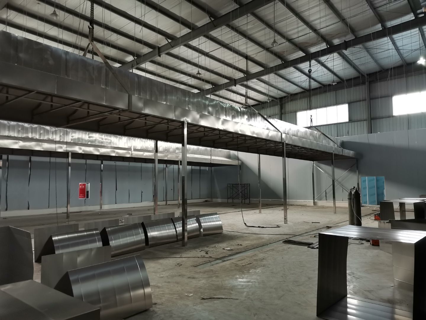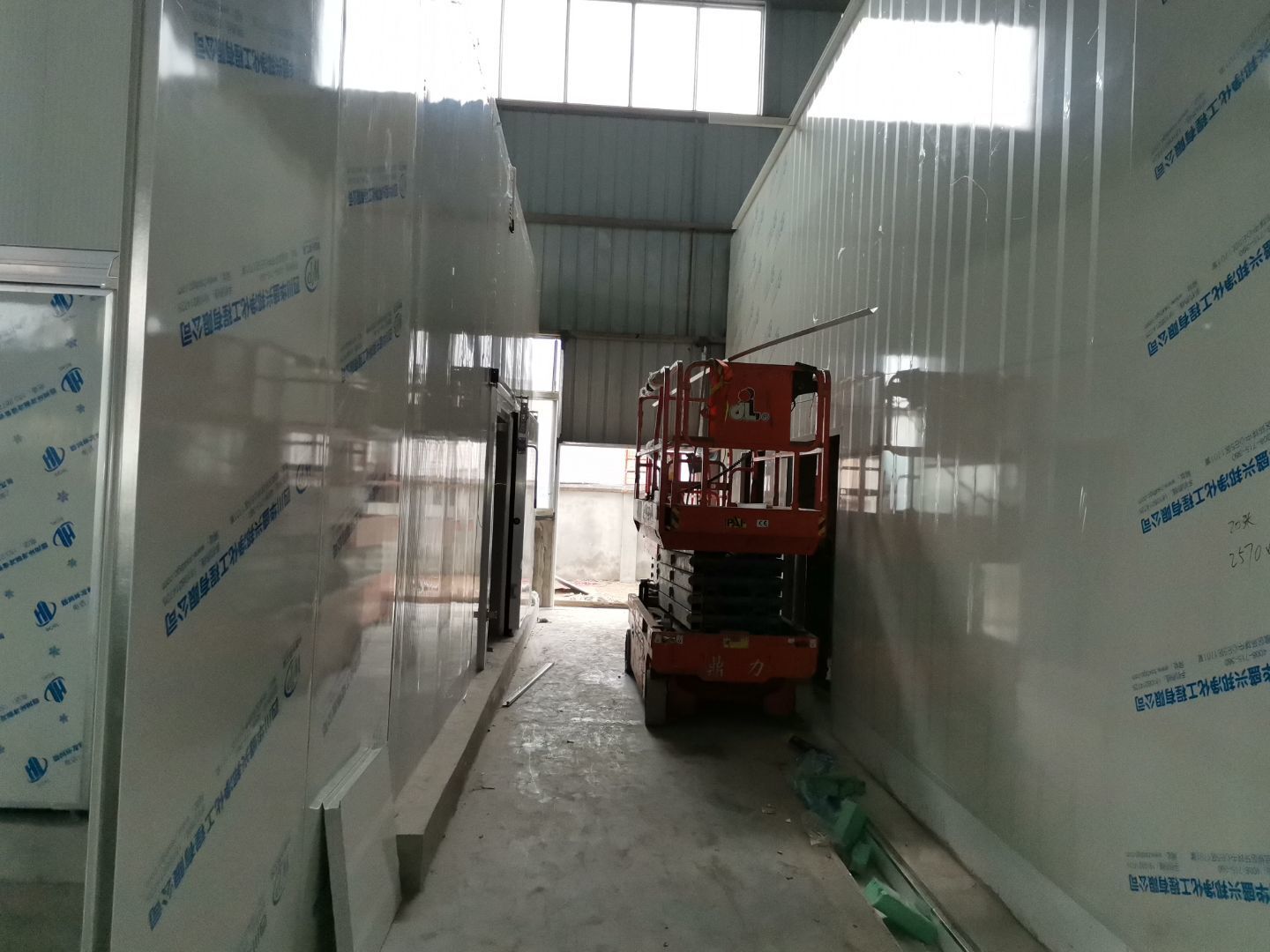 1、 吊筋安裝完成70%,頂板安裝完成70%; 2、彩鋼墻板安裝完成95%,門洞開設(shè)完成90%,自制門框下料完成100%; 3、地坪打磨第三遍完成100%; 4、水電燈具安裝完成90%,插座定位開孔完成100; 5、彩鋼圓弧安裝完成70%; 6、原水溝混凝土面層修補完成100%; 7、墻板撕膜打膠完成45%; 8、冷風(fēng)機主機安裝完成100%,風(fēng)管安裝完成15%; 9、場地清理。