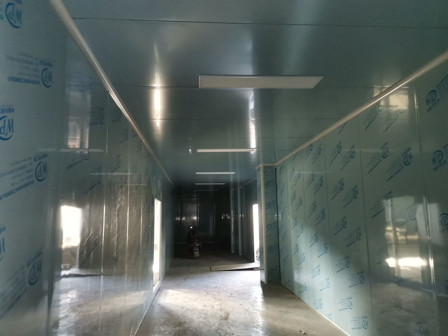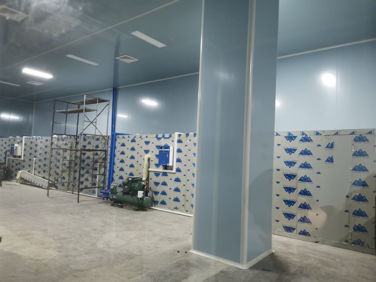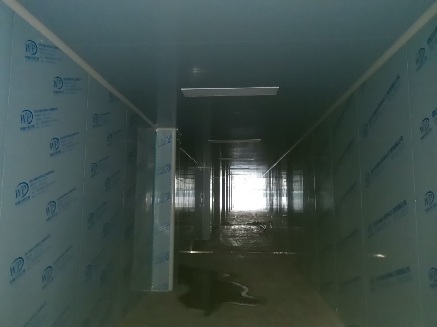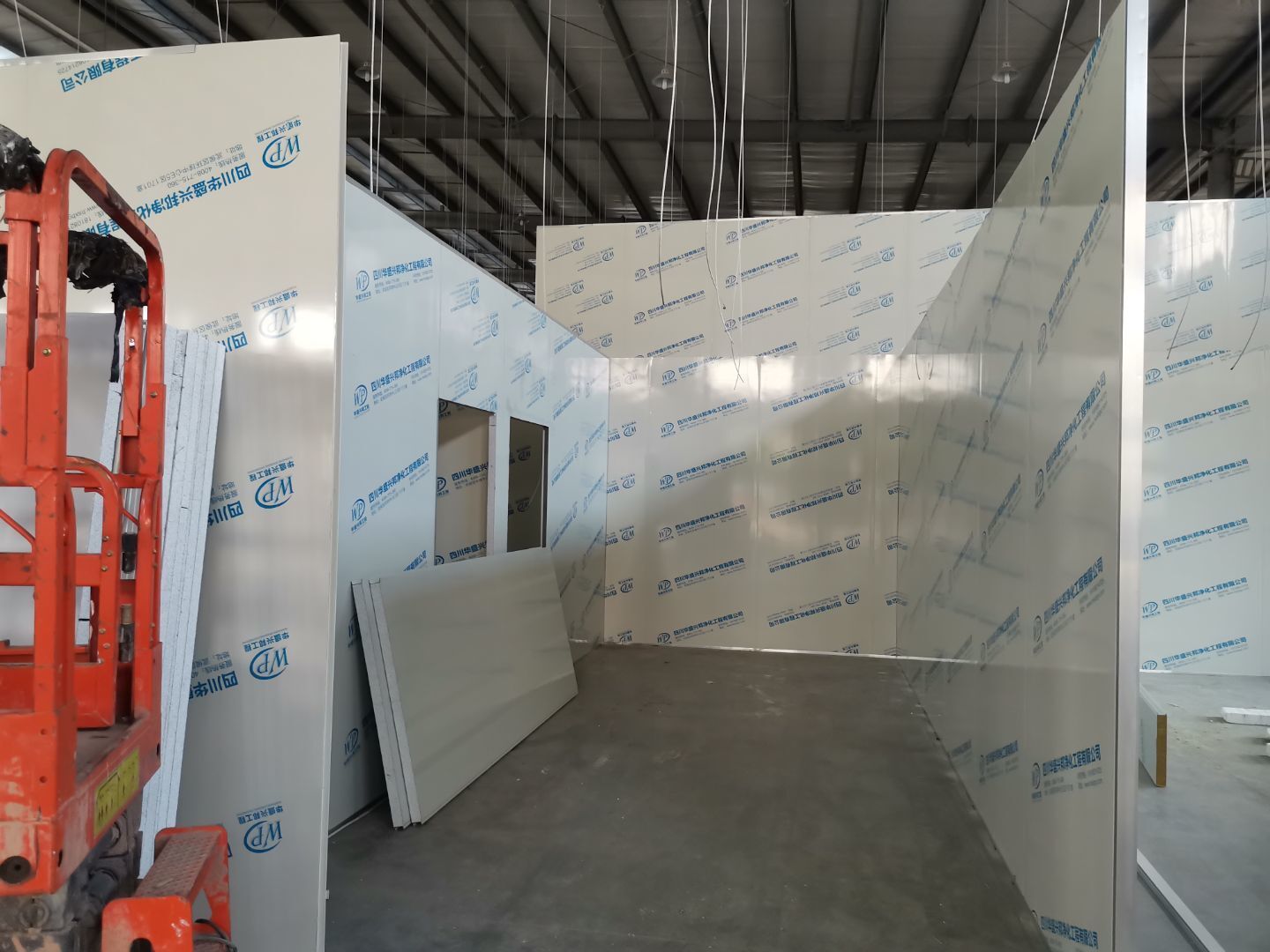 1、 吊筋安裝完成70%,頂板安裝完成70%; 2、彩鋼墻板安裝完成95%,門洞開設(shè)完成90%,自制門框下料完成100%; 3、地坪打磨第三遍完成100%; 4、水電燈具安裝完成90%,插座定位開孔完成100; 5、彩鋼圓弧安裝完成70%; 6、原水溝混凝土面層修補完成100%; 7、墻板撕膜打膠完成45%; 8、冷風(fēng)機主機安裝完成100%,風(fēng)管安裝完成15%; 9、場地清理。