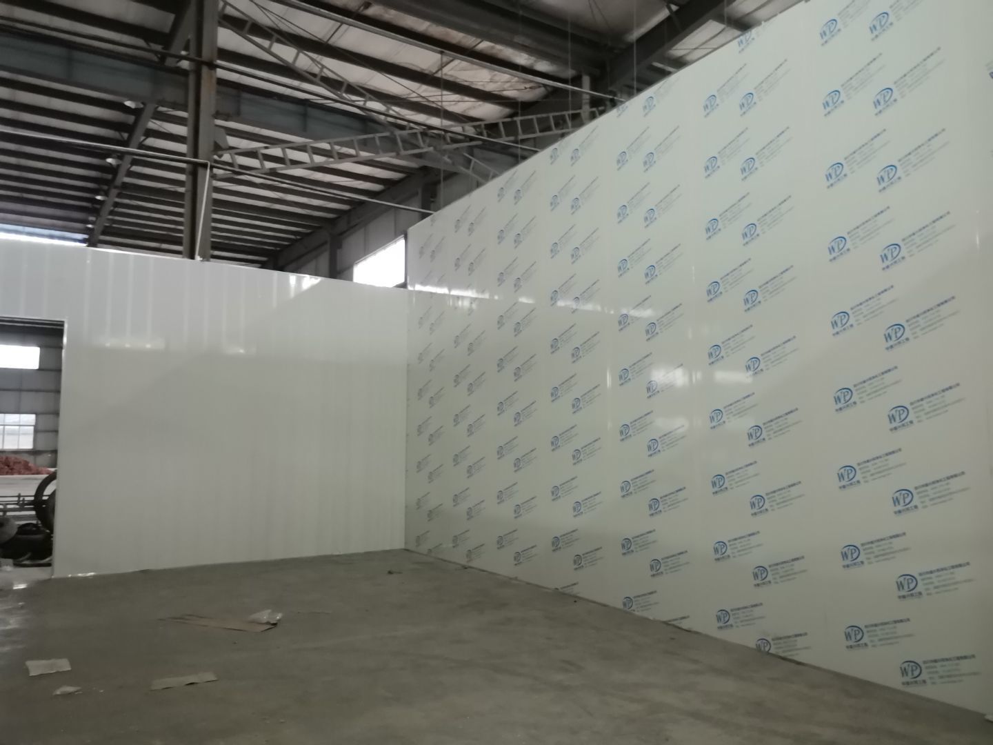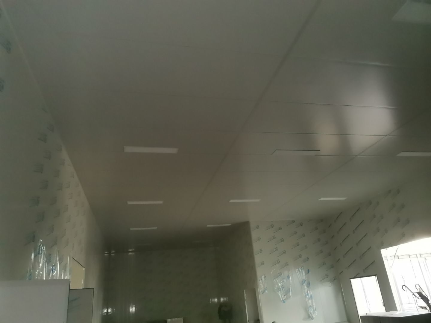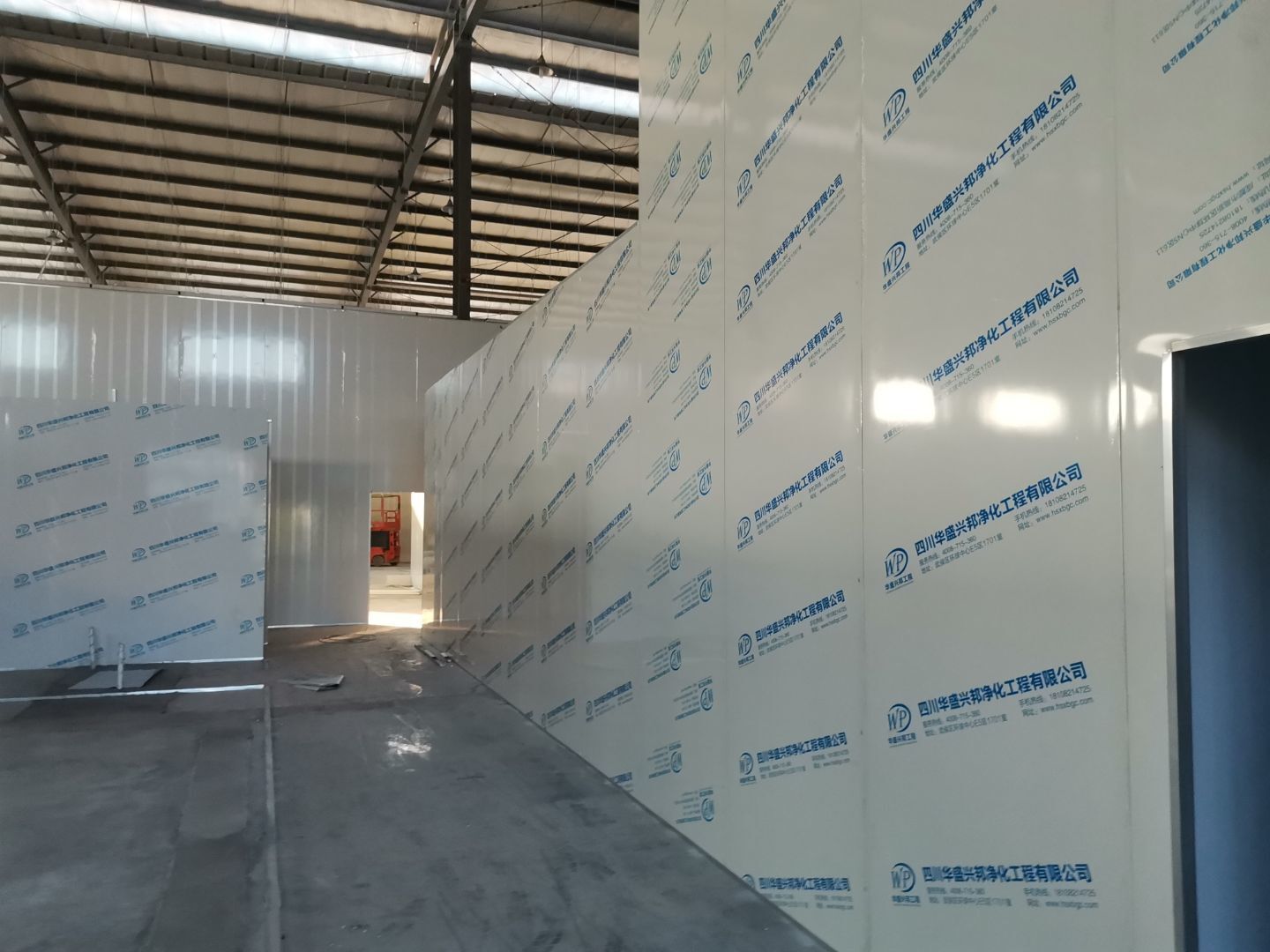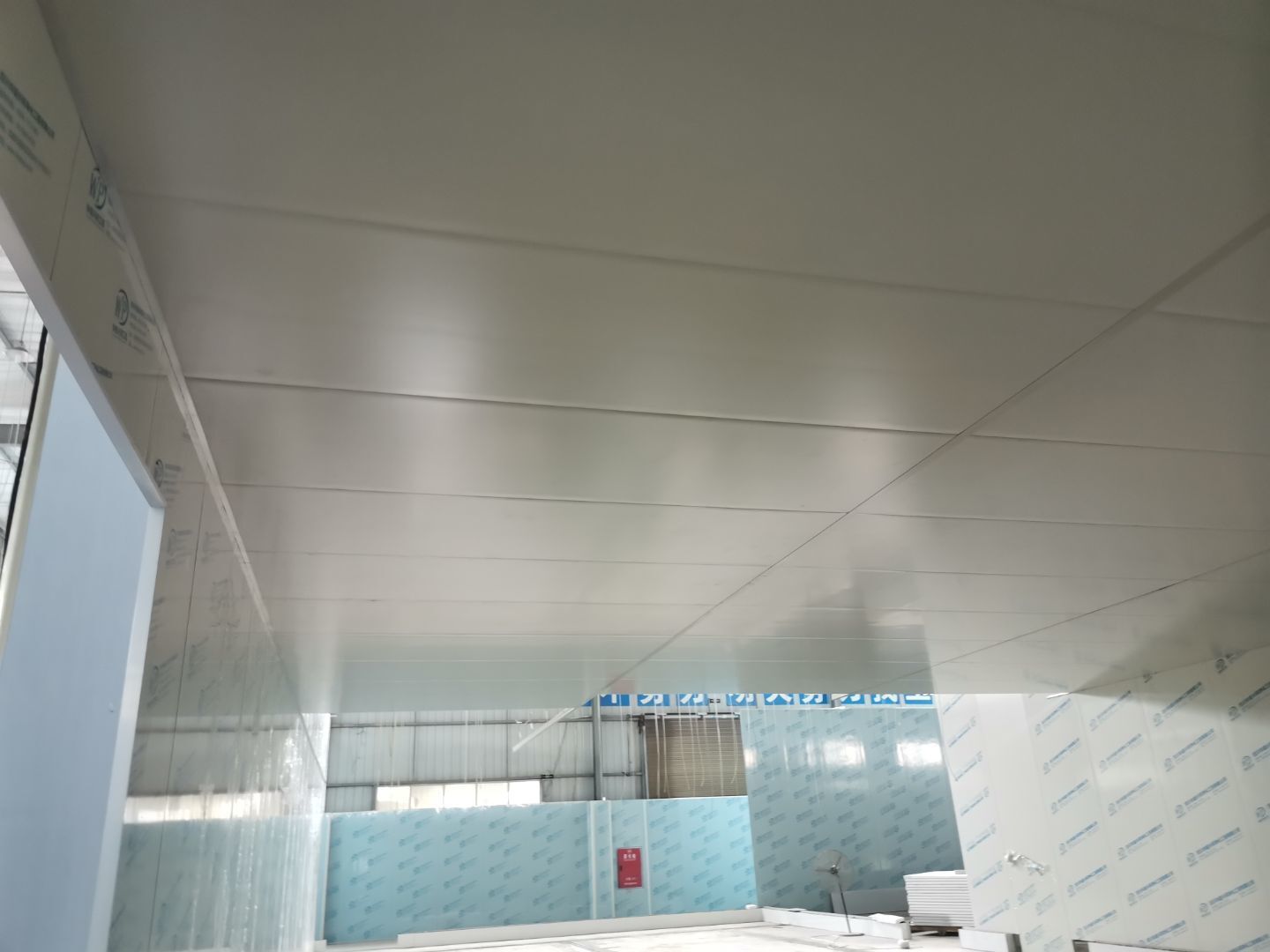 吊筋安裝完成,頂板安裝完成;彩鋼墻板安裝完成,門洞開設(shè)完成,自制門框安裝;墻板撕膜打膠完成;場地清理。