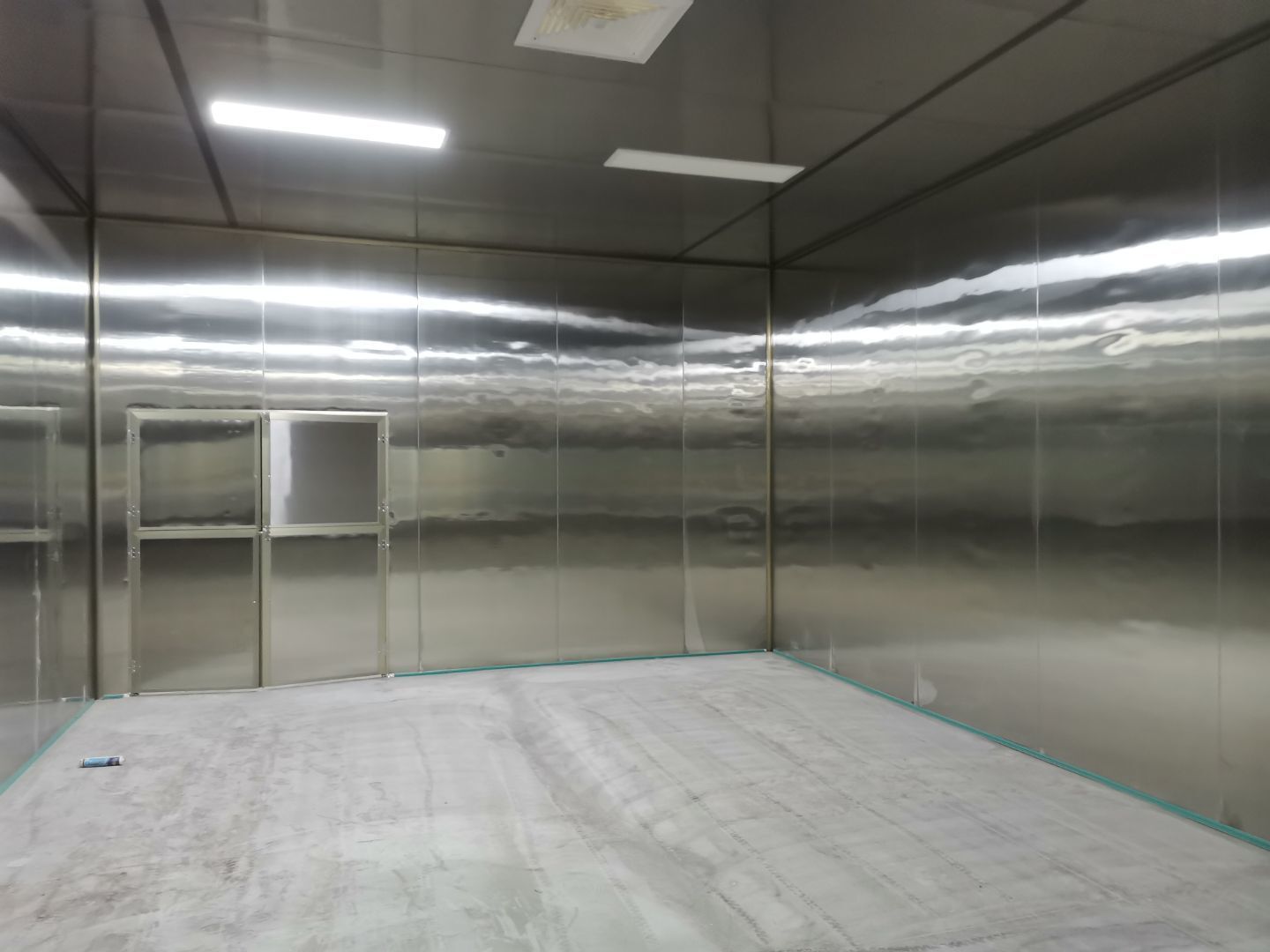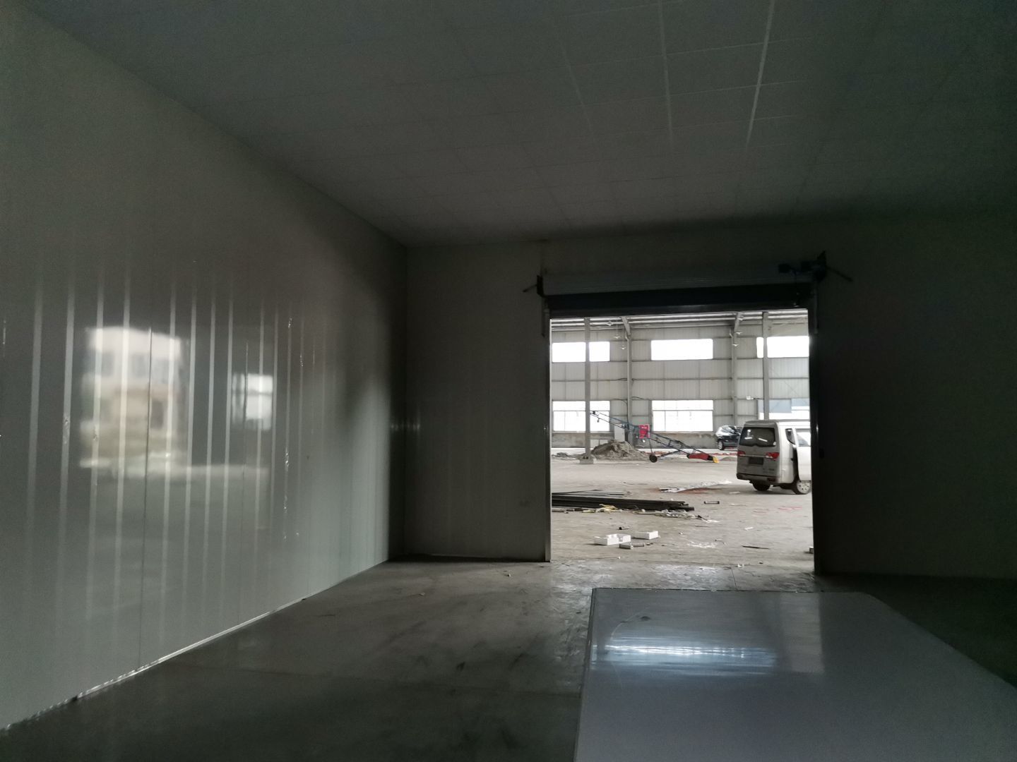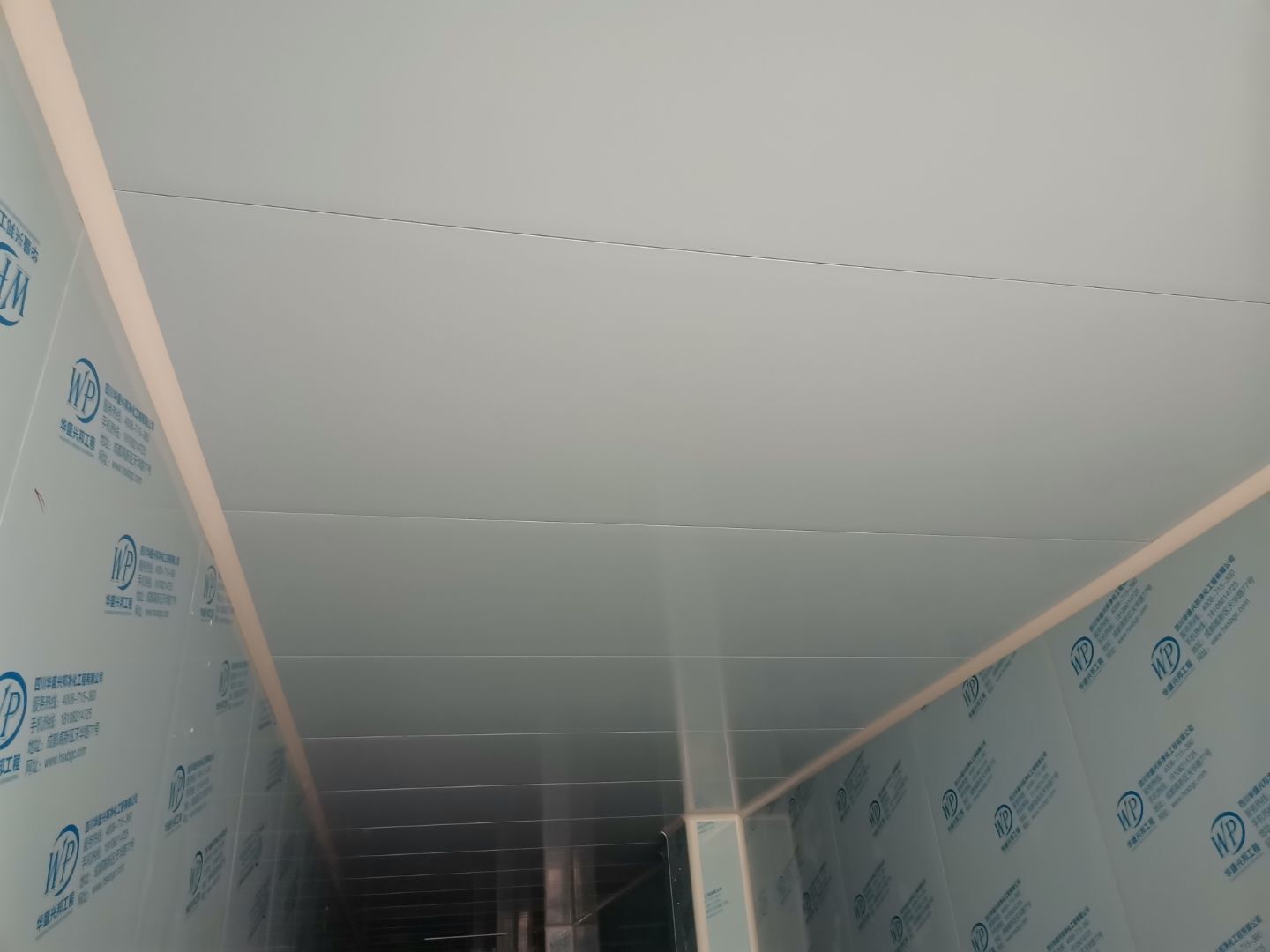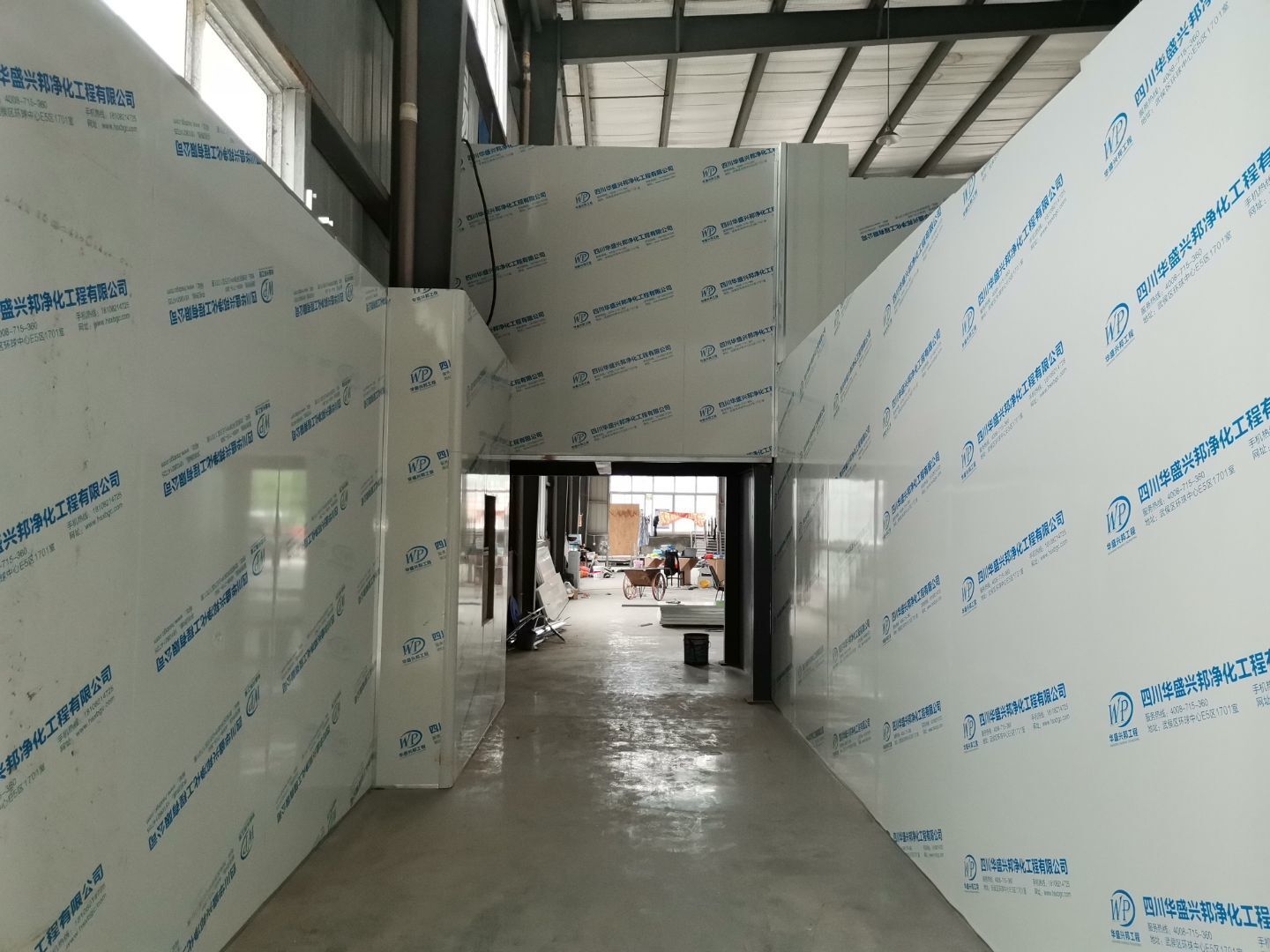 吊筋安裝完成,頂板安裝完成;彩鋼墻板安裝完成,門洞開設(shè)完成,自制門框安裝;墻板撕膜打膠完成;場地清理。