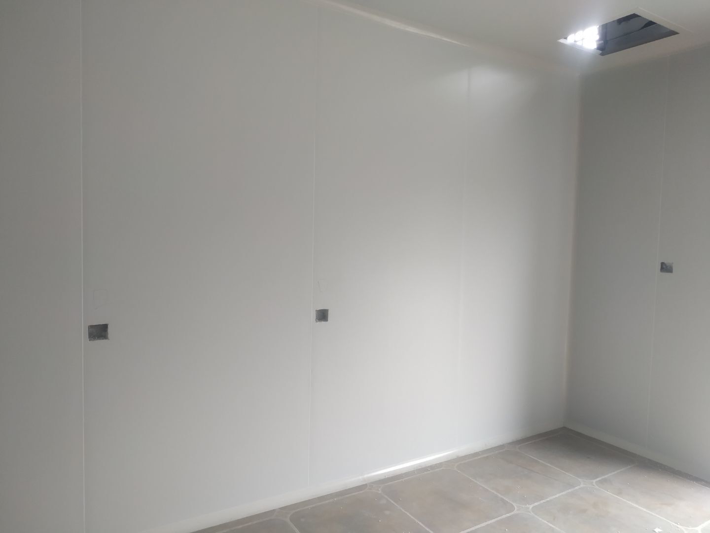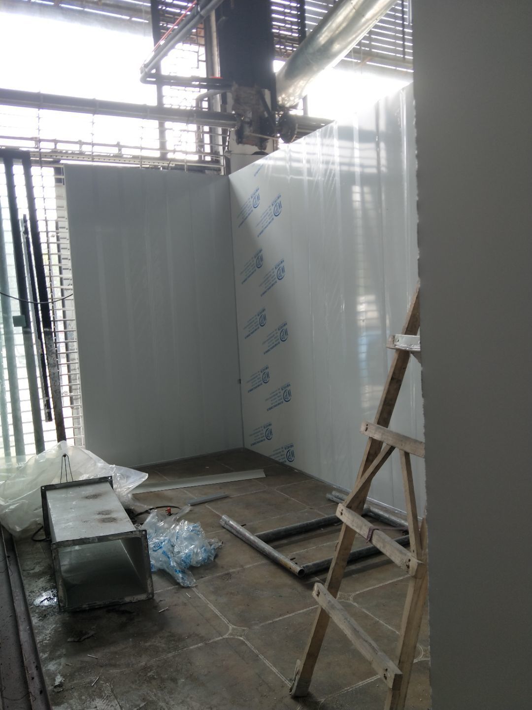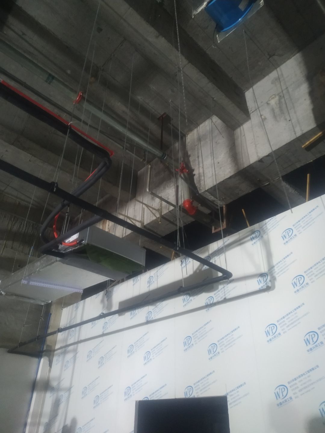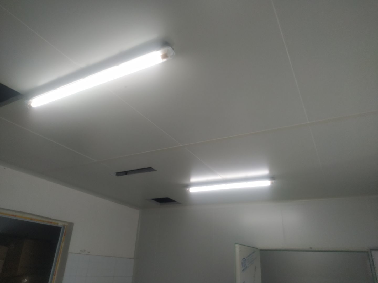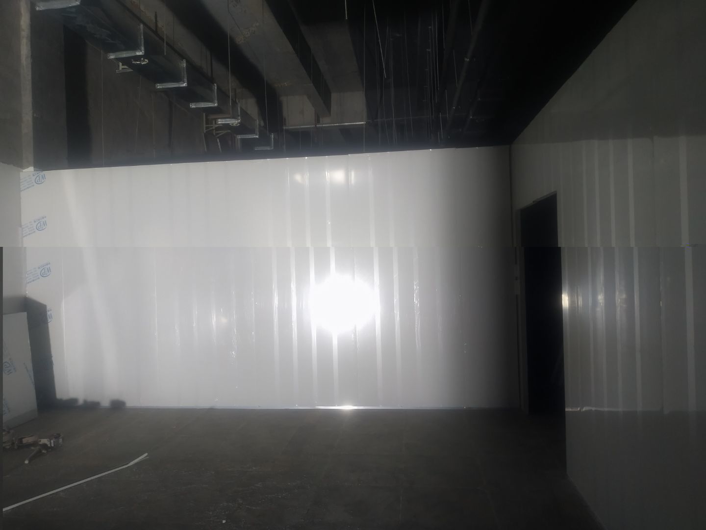 門安裝完成,門鎖安裝完成,換氣扇、進風口、空調風口開洞完成,照明電試電完成。