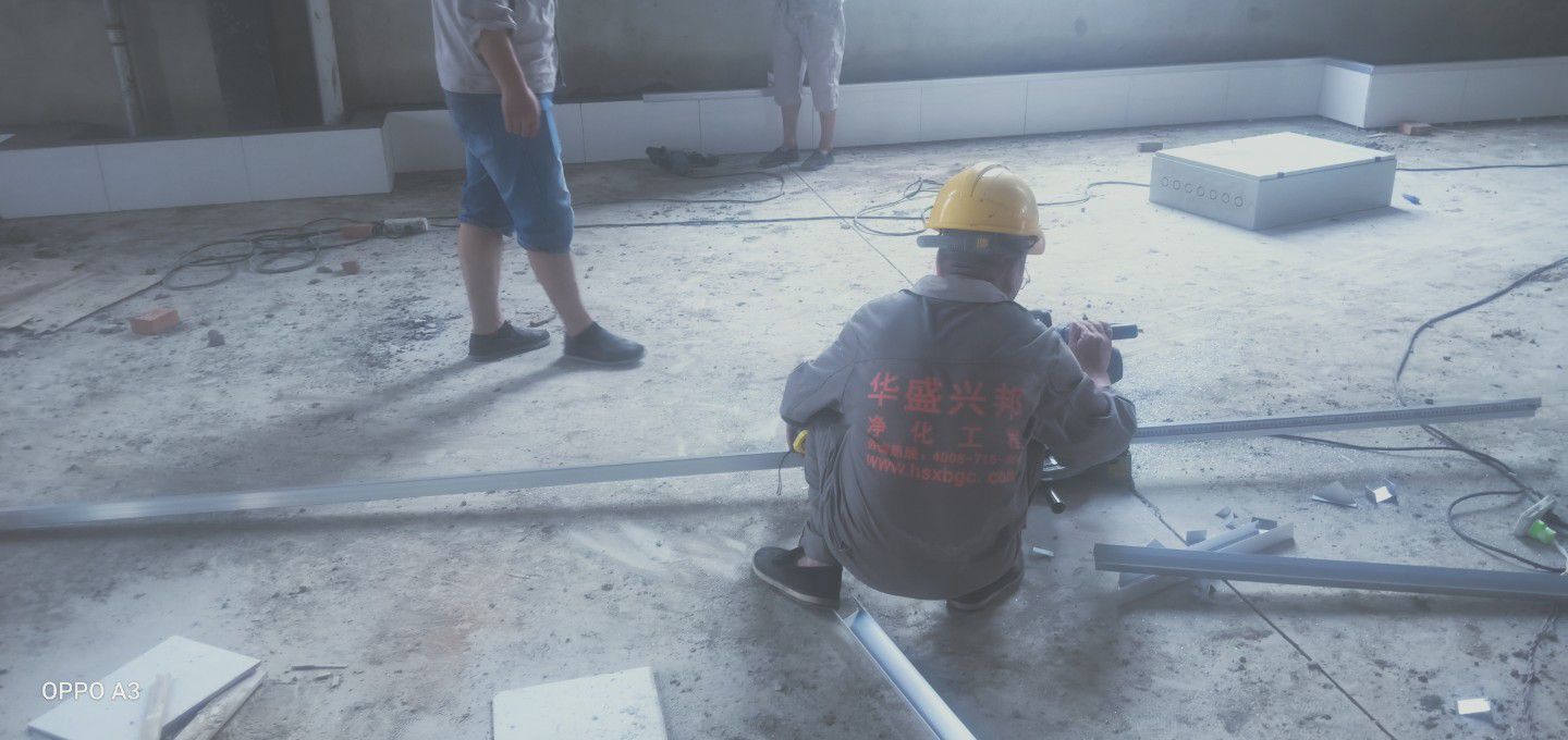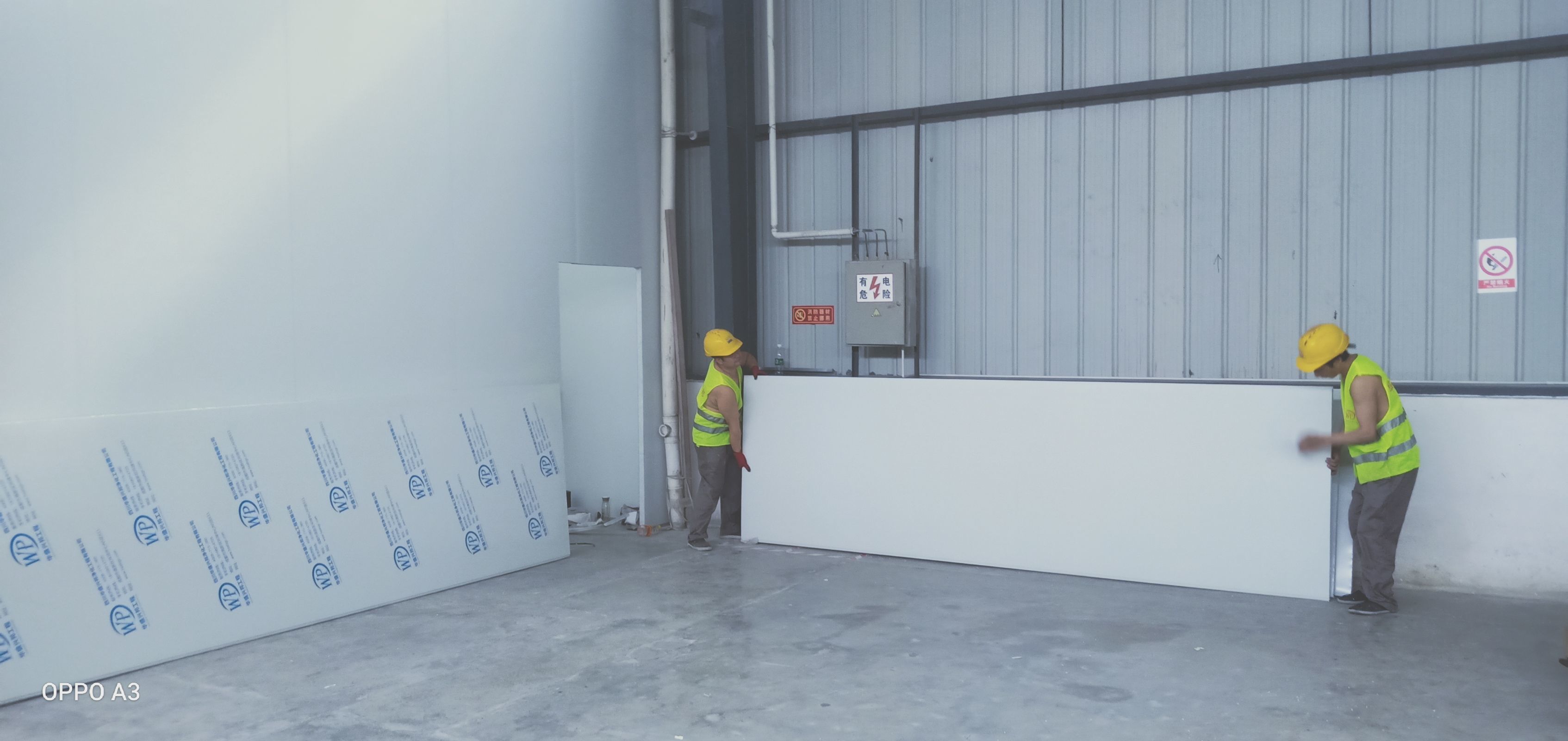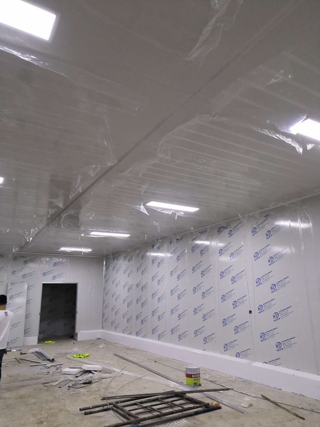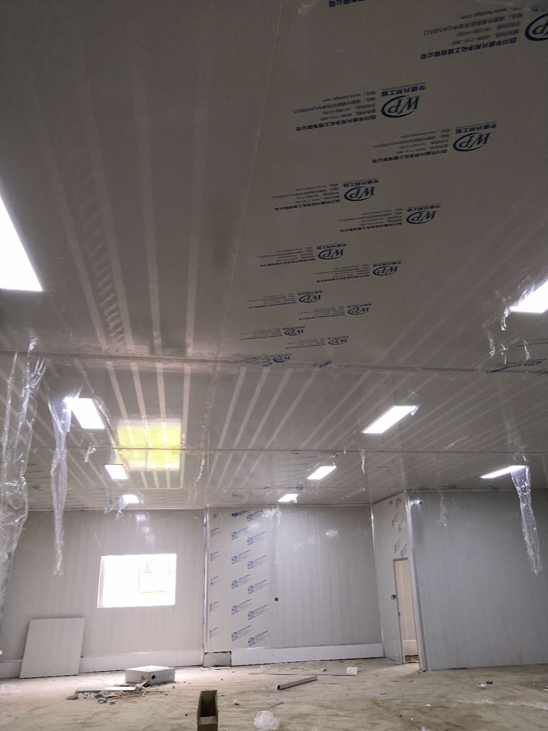 彩鋼板、凈化板施工現(xiàn)場(chǎng)。