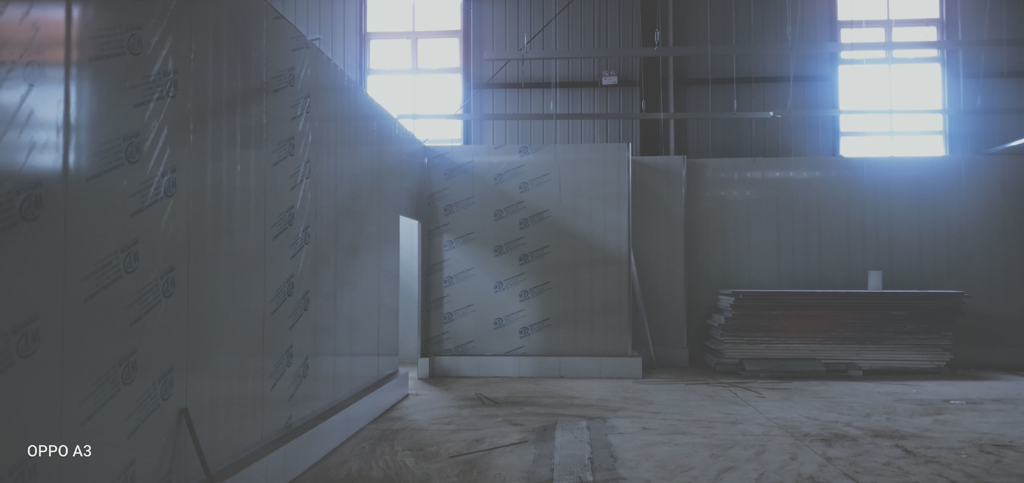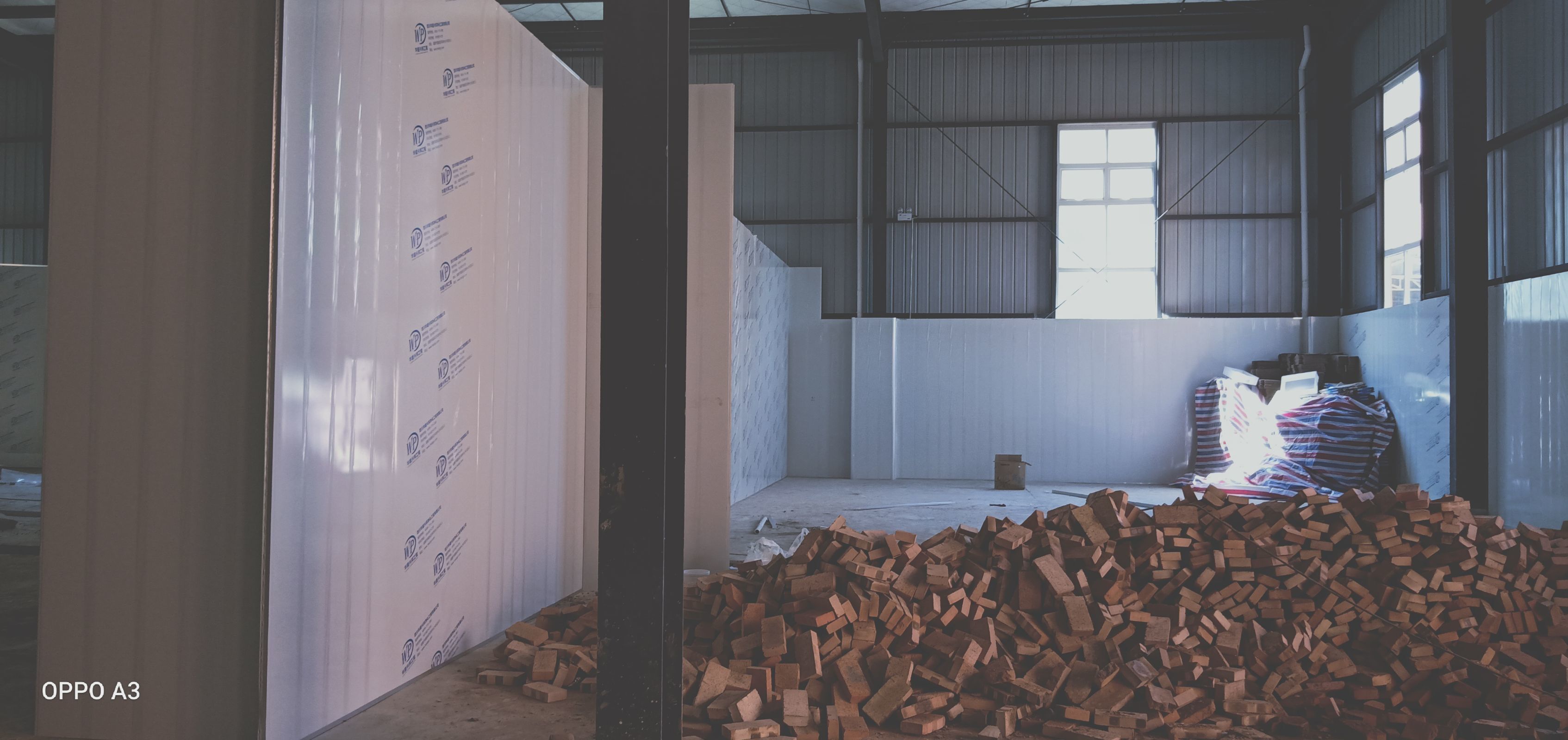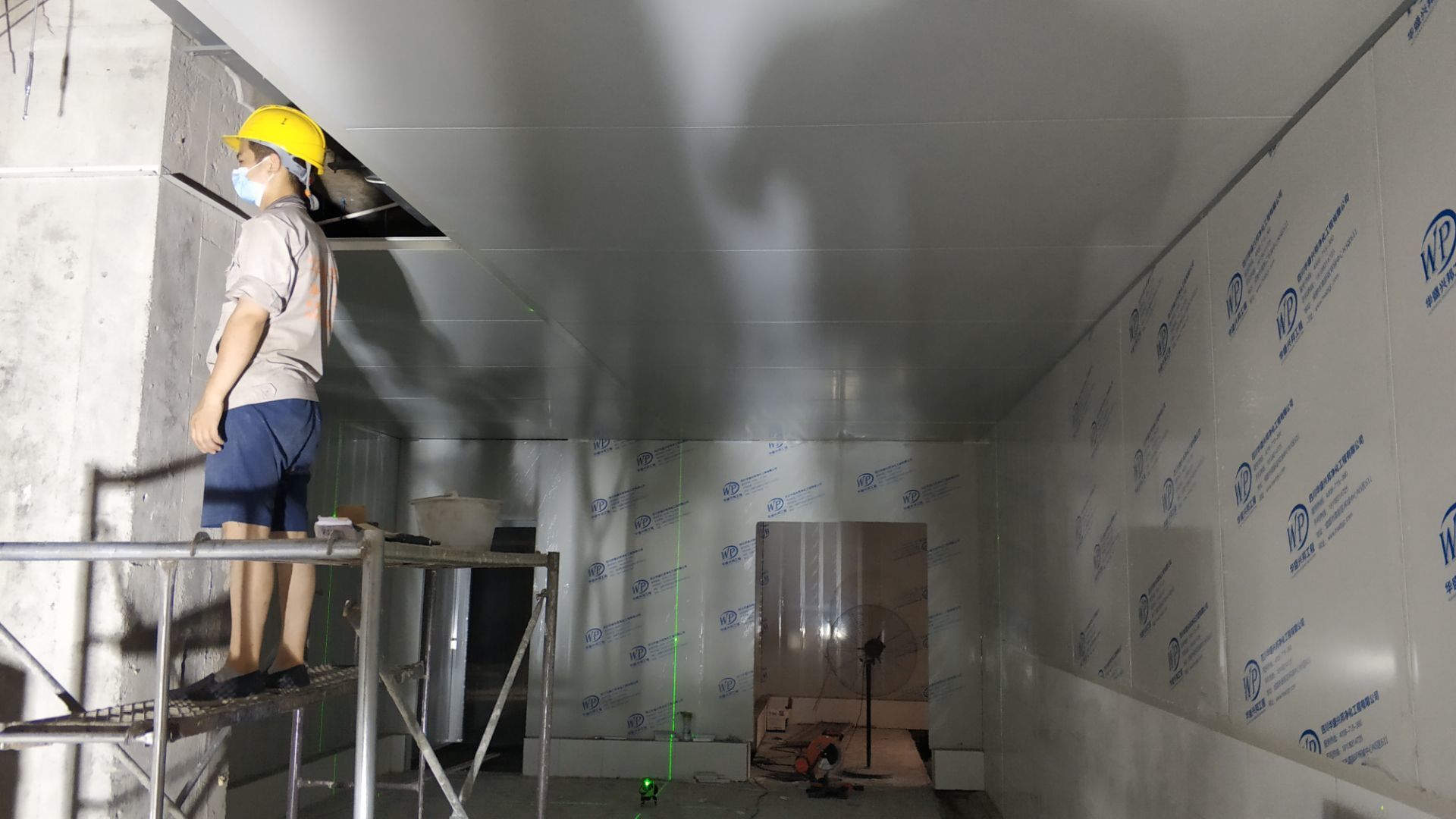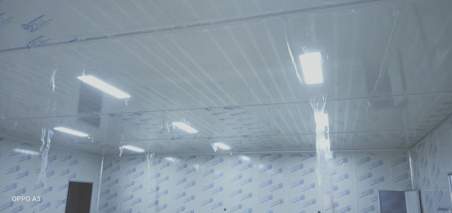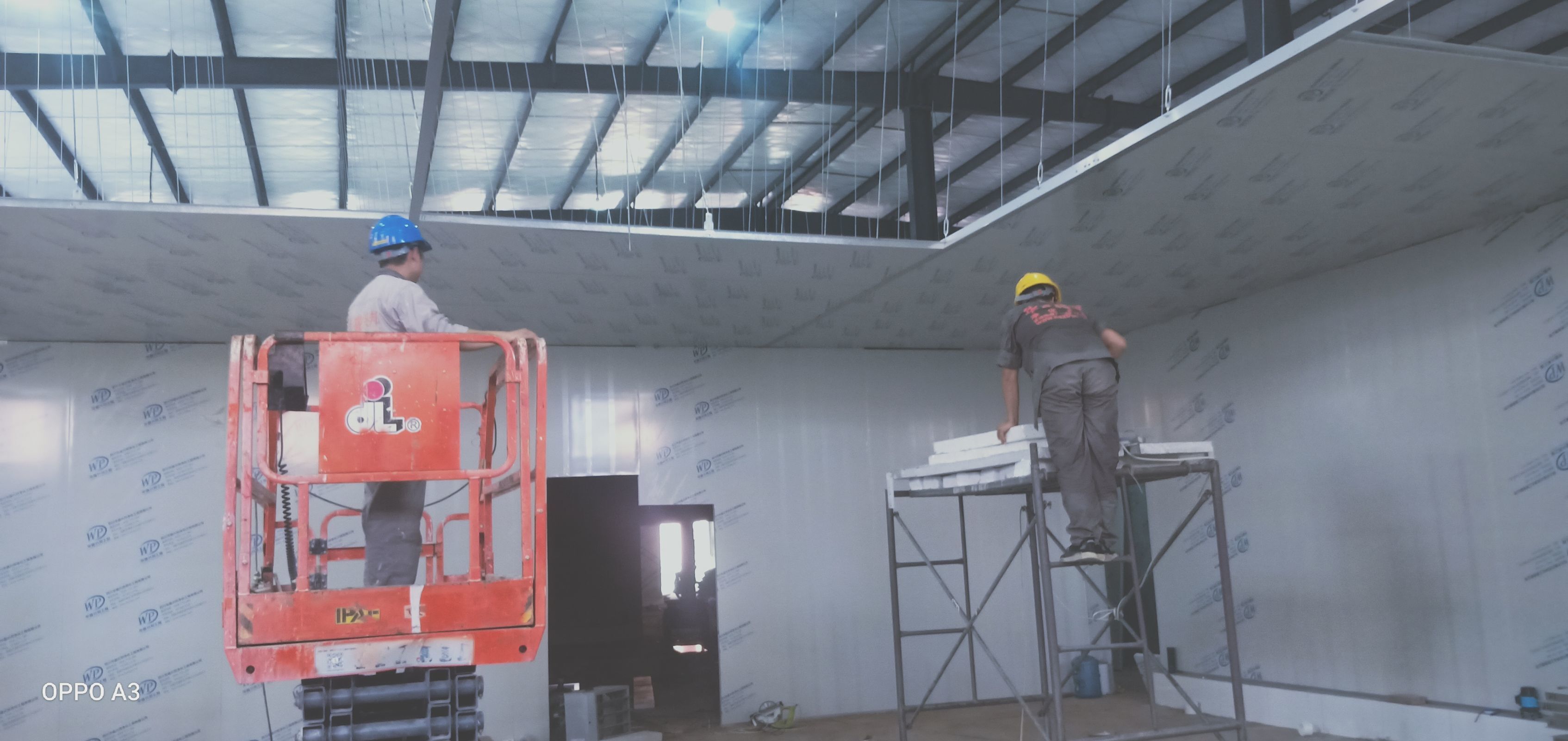 彩鋼板、凈化板施工現(xiàn)場(chǎng)。
