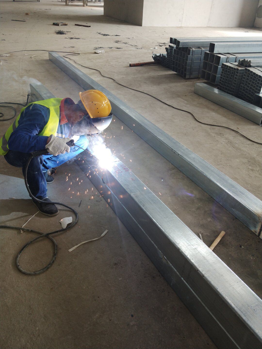 1、二次吊掛鋼構立柱放線定位; 2、鋼立柱下料焊接完成,柱腳板安裝完成; 3、臨電布設完成。