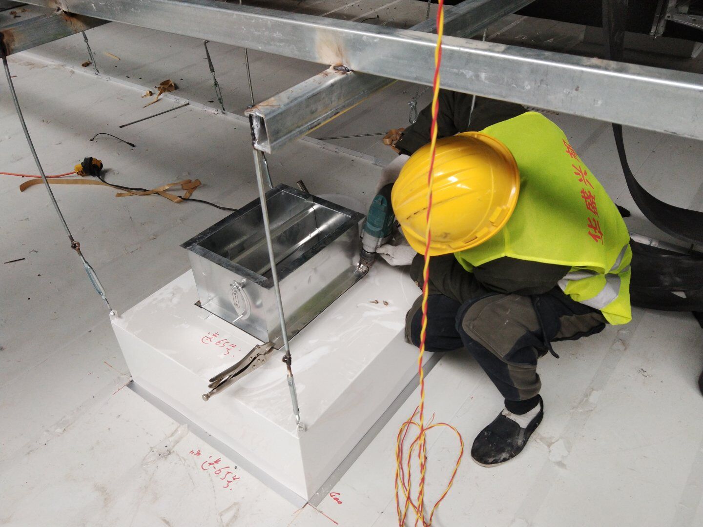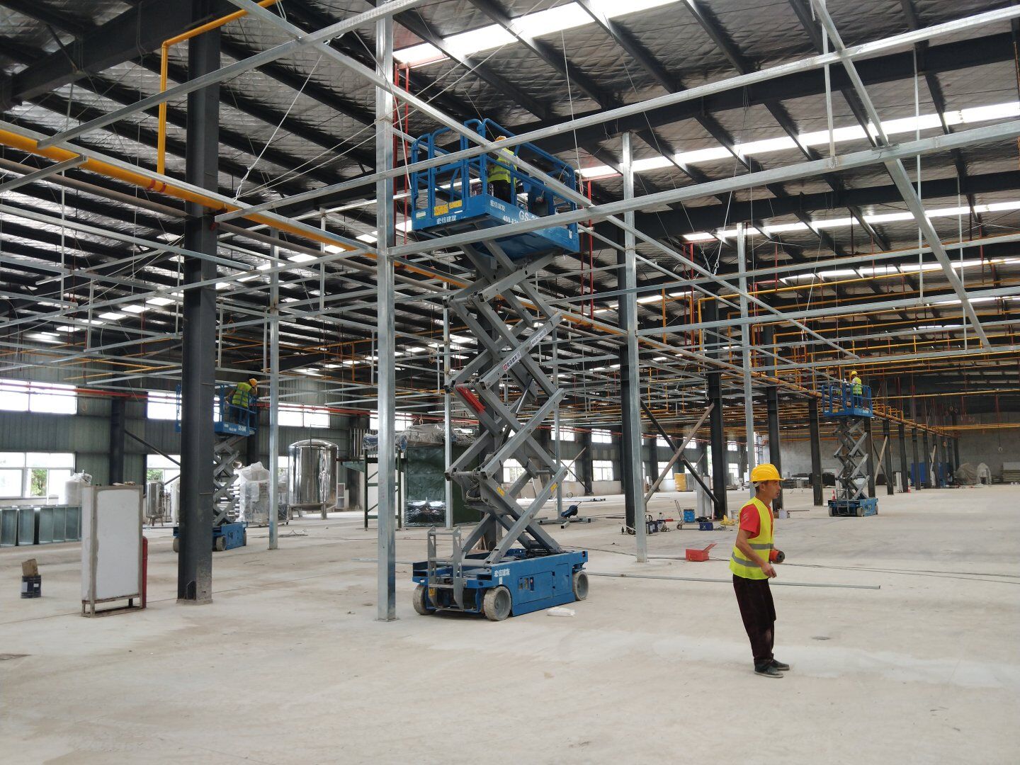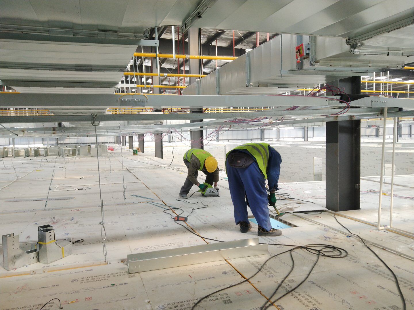 二次吊掛鋼構網架施工;車間定基準線及彩鋼板隔墻放線;凈化風管施工