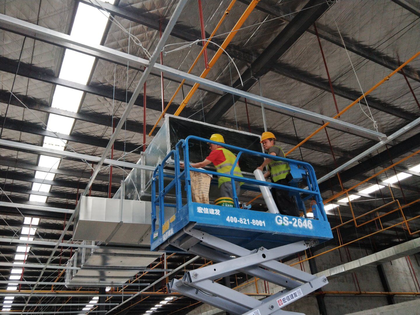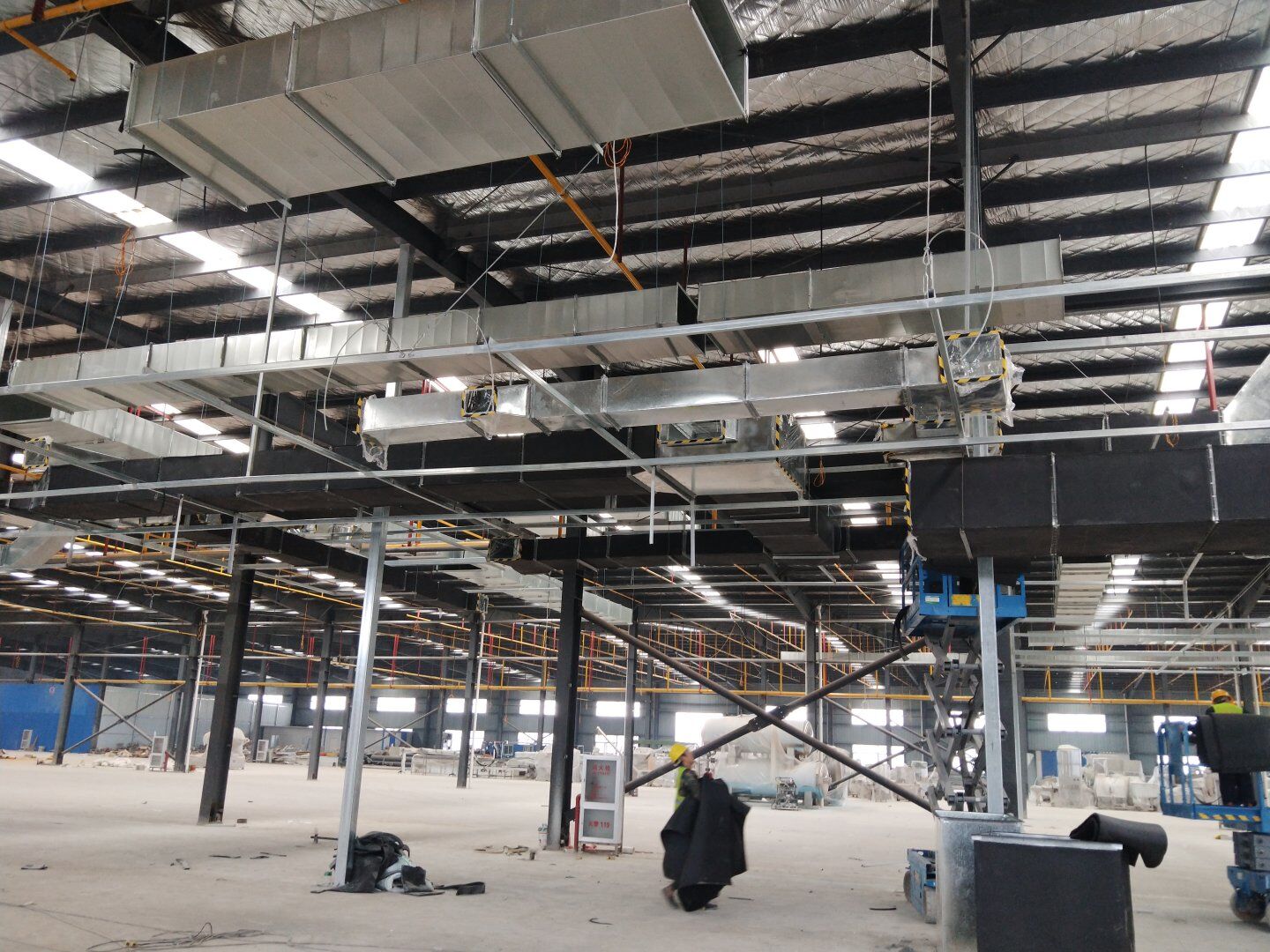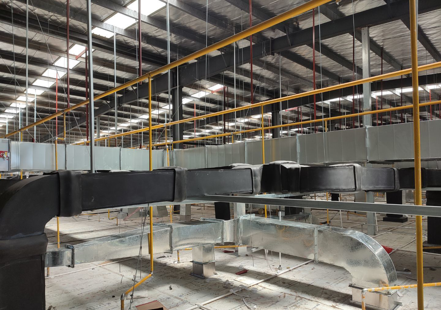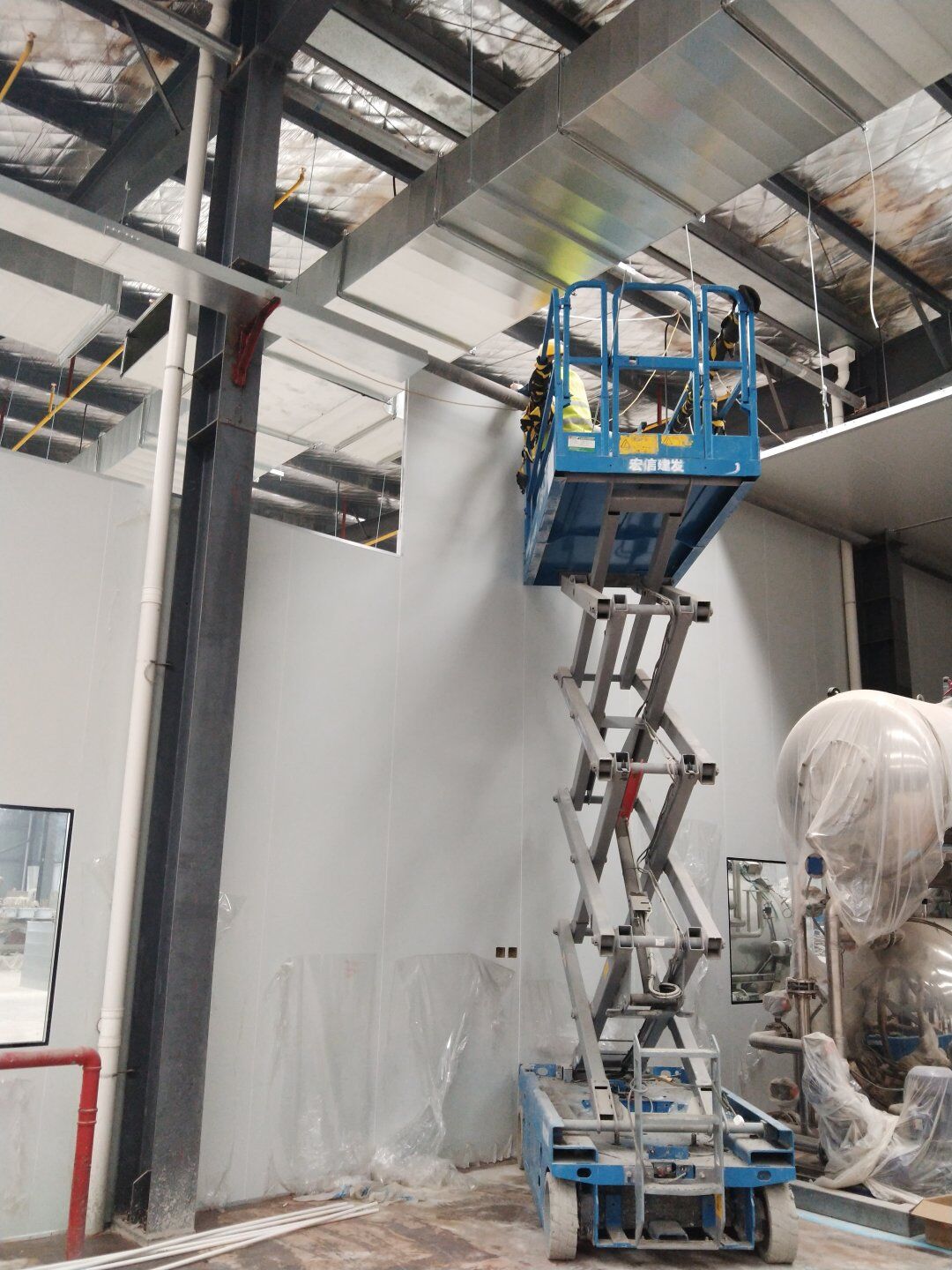 1,風管干管清洗,保溫及吊裝完成80%; 2,主風管保溫施工