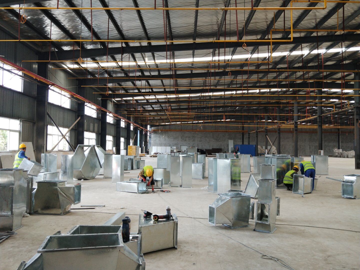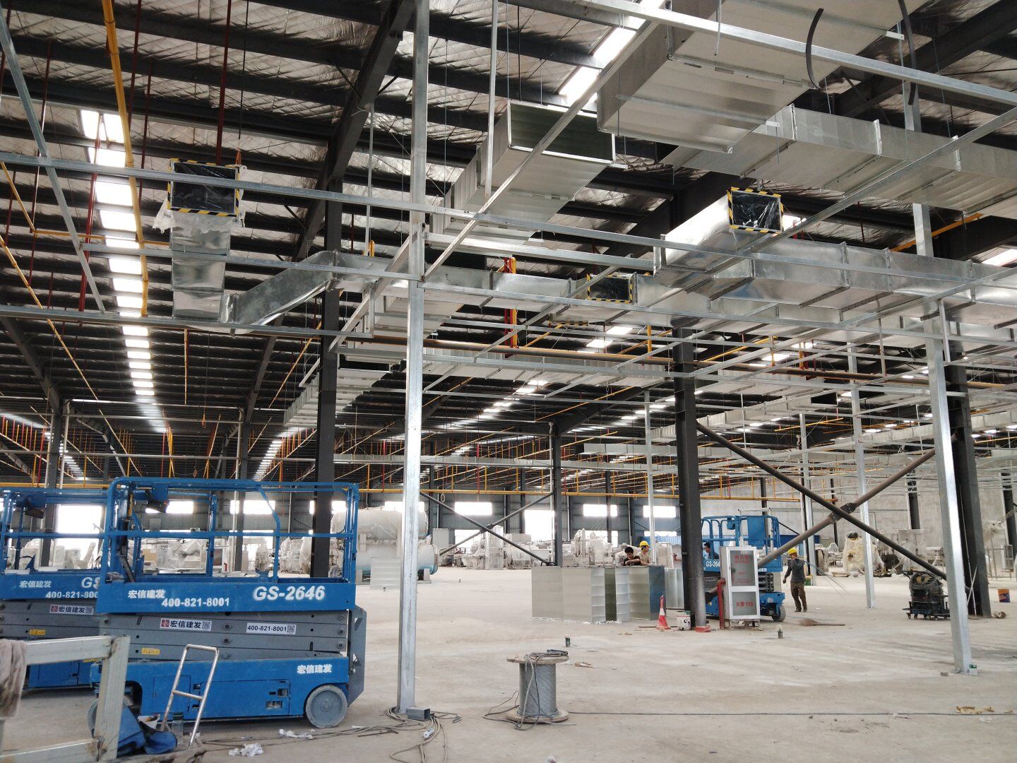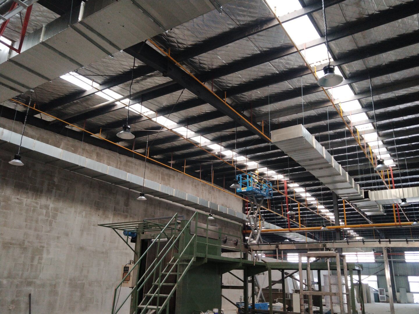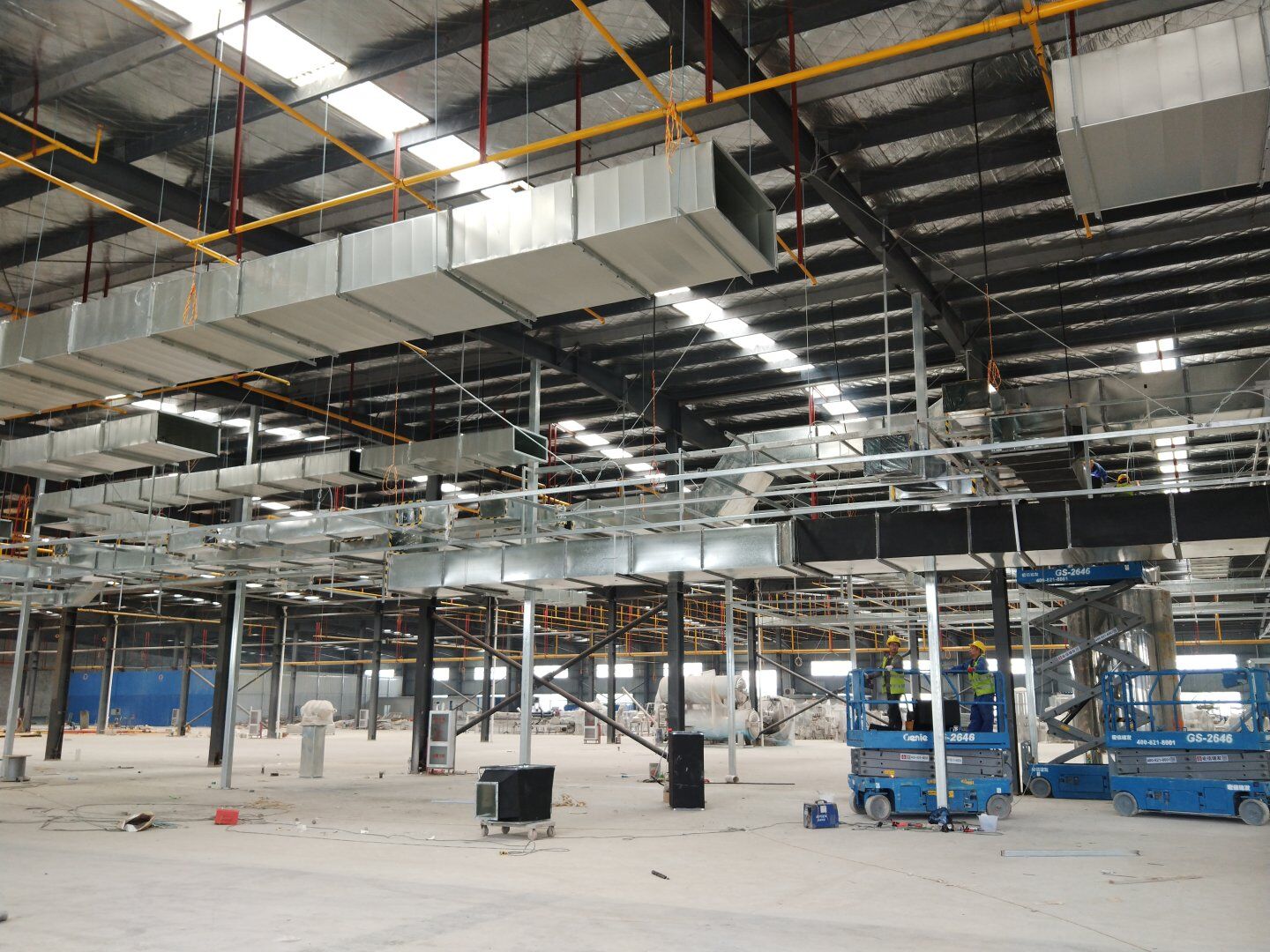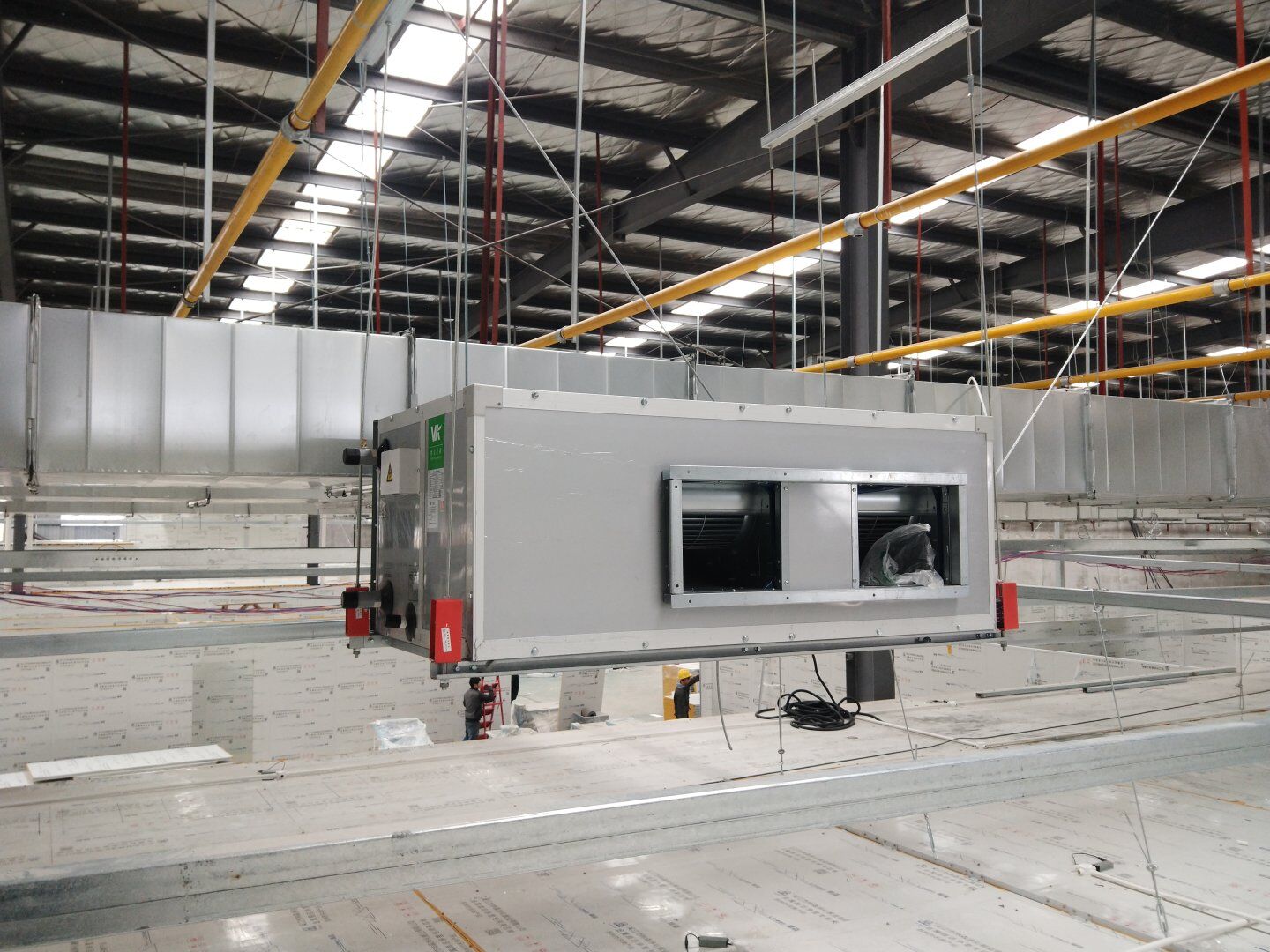 1,風管干管清洗,保溫及吊裝完成80%; 2,主風管保溫施工