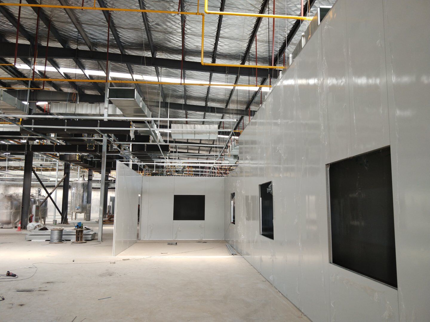 液體車間施工: 1,前期預留通道墻板安裝完成50%,并預留可拆卸設備門 飲片車間: 2,所有墻板完成,頂板完成95%