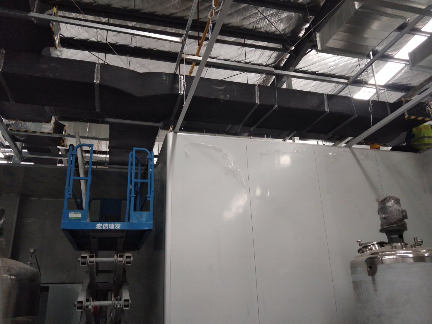 1,應甲方變更拆除參觀走廊一部分墻頂板及部分隔墻(讓增加的設備進入); 2,風管支管保溫完成70%; 3,圓弧完成65%,撕膜打膠完成20%; 4,潔凈燈盤安裝完成25%。