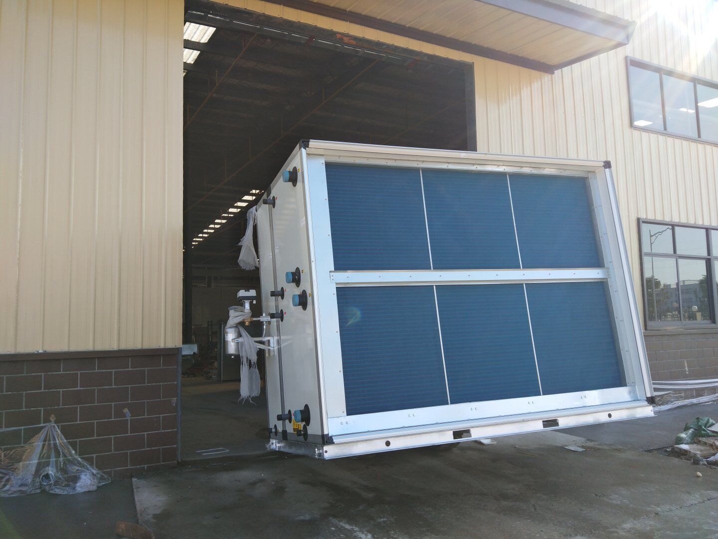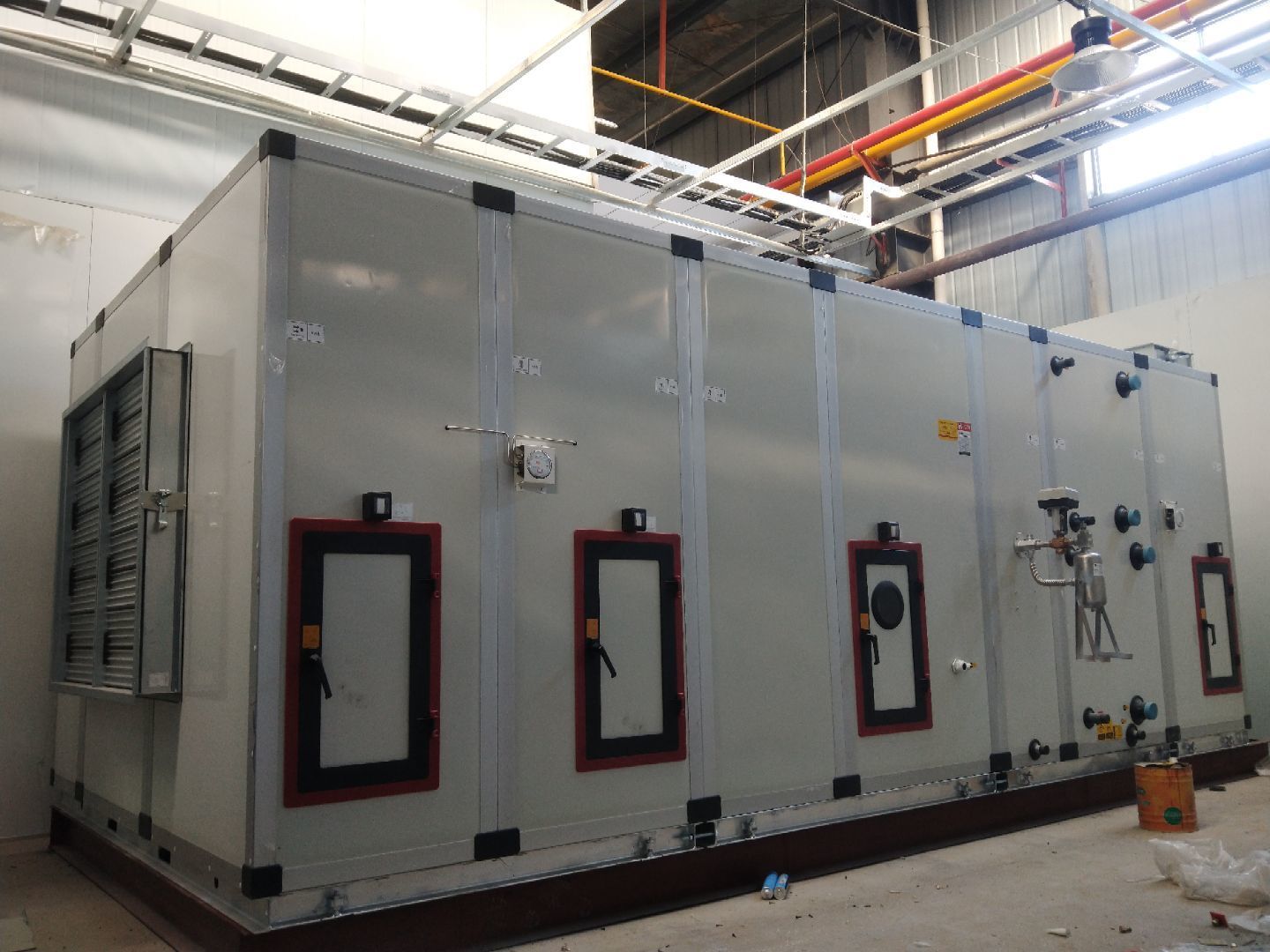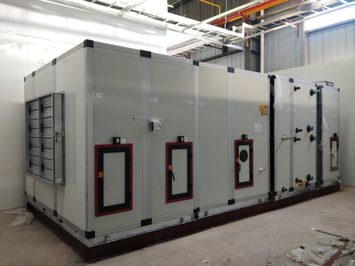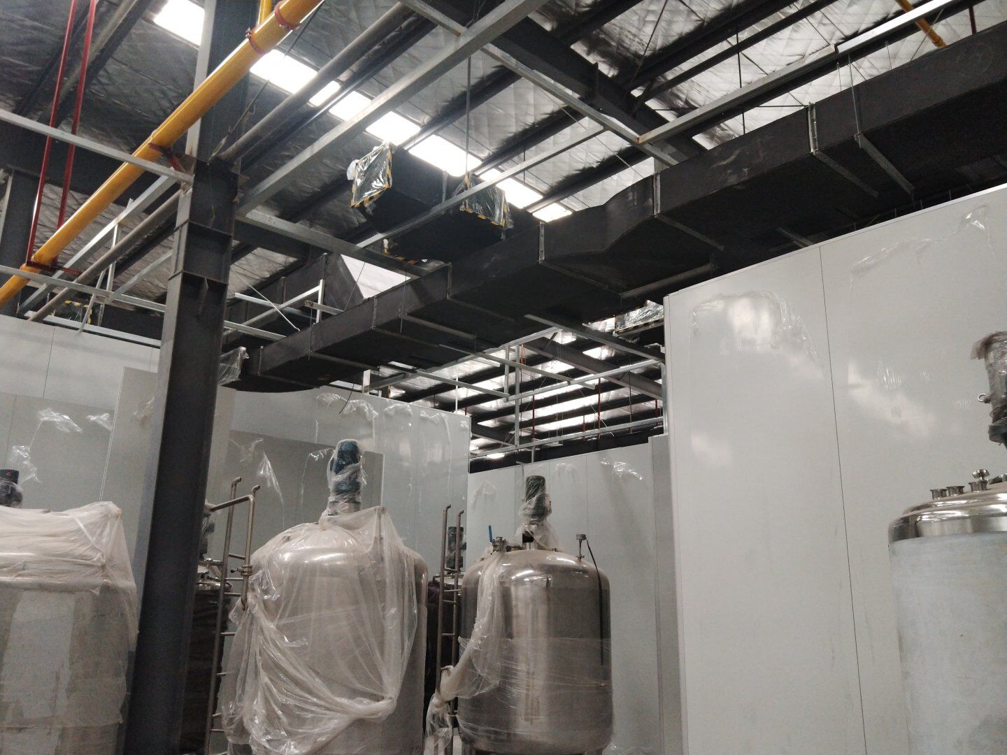 液體車間: 1、剩余風管拼裝完成80%;2、彩鋼板打膠完成95%;3、空調自控放線完成95%。