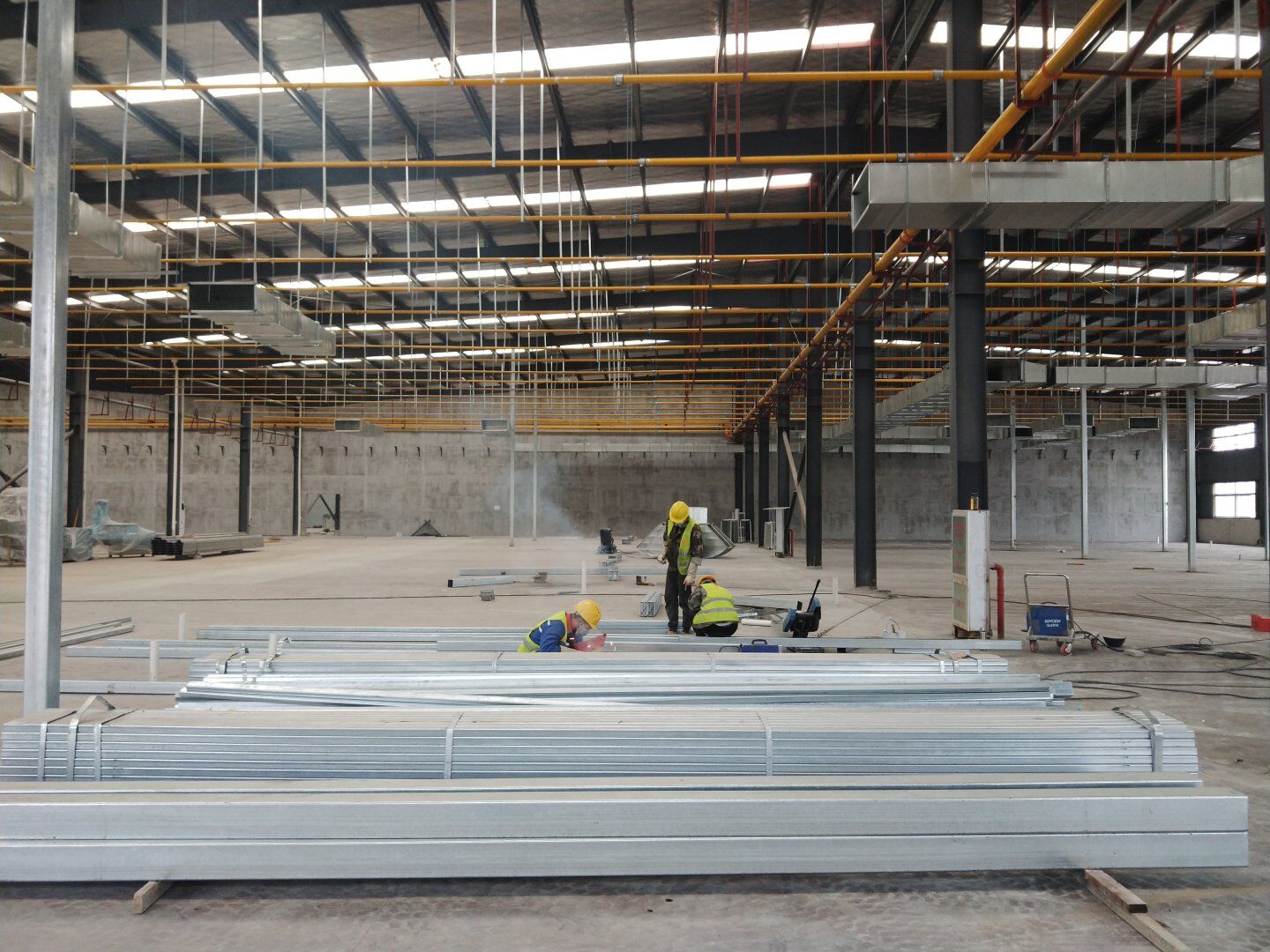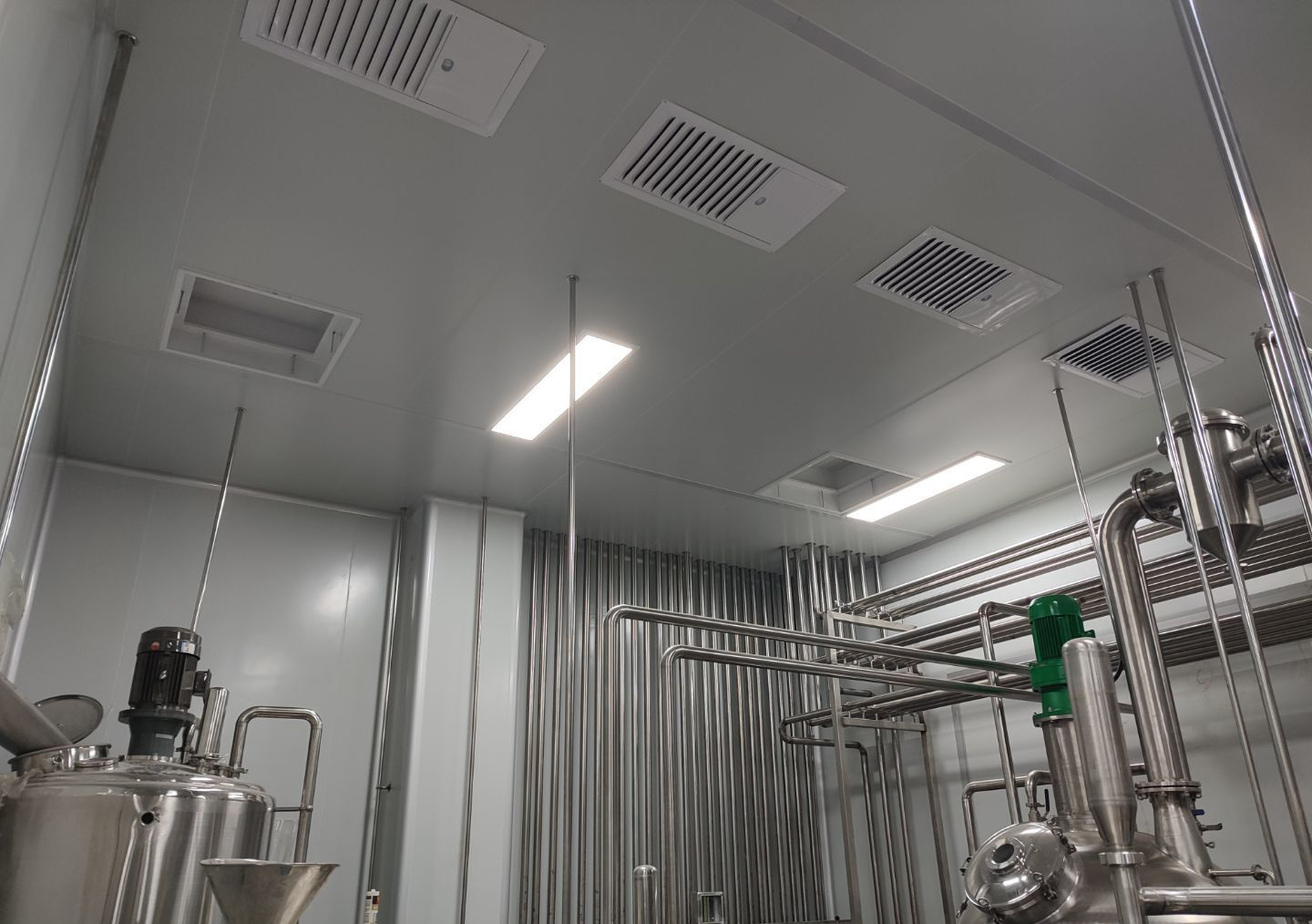 1,工礦燈安裝及配管穿線完成30% 飲片車間 1,彩鋼板頂板完成40% 2,5米高房間吸頂燈安裝完成。