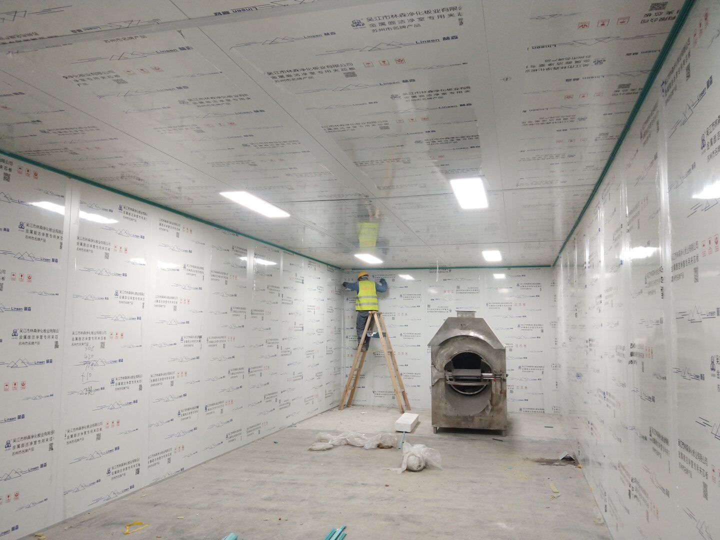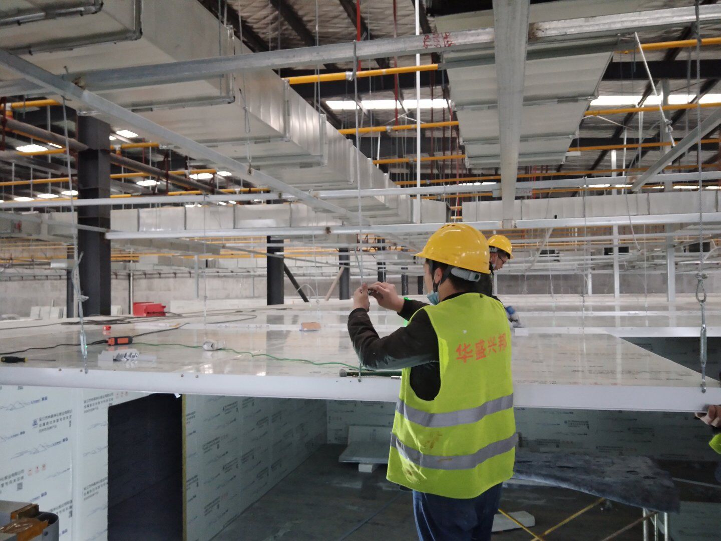 1,工礦燈安裝完成25% 飲片車間: 1,頂板完成35%,高房間撕膜打膠貼圓弧完成。