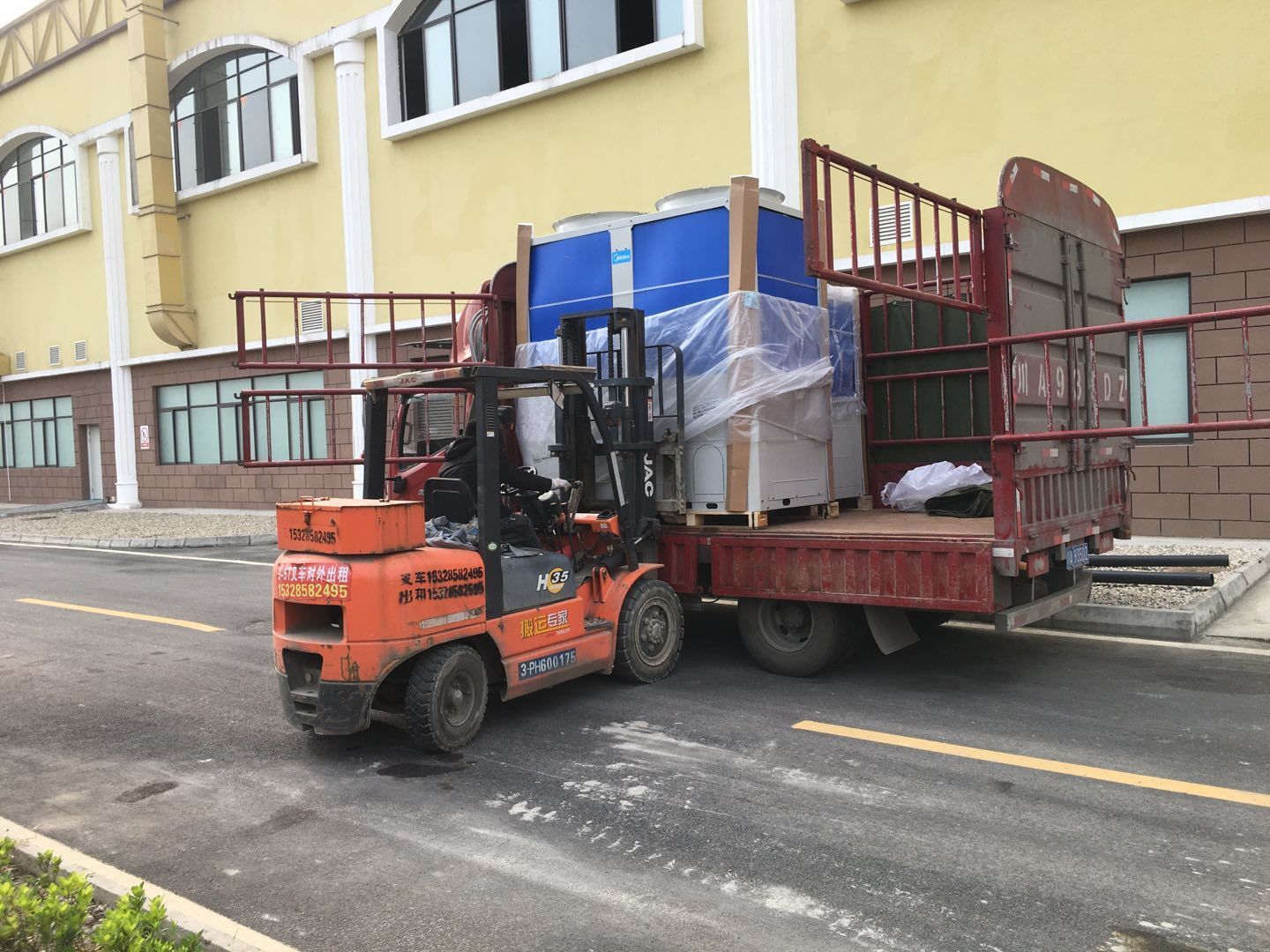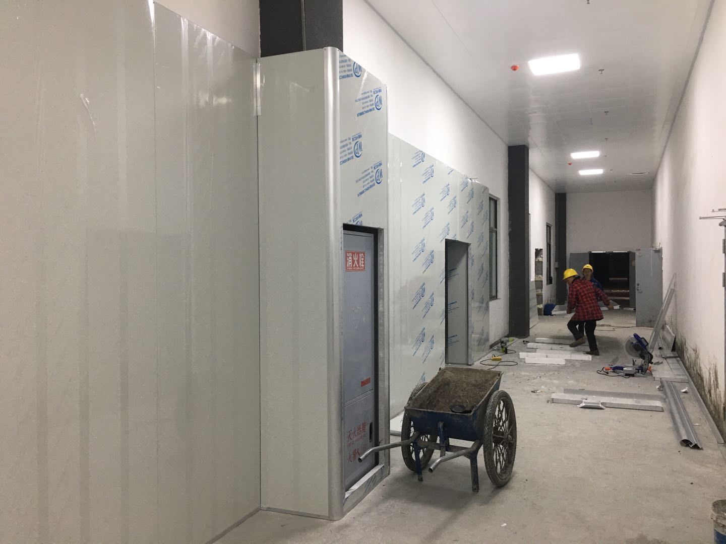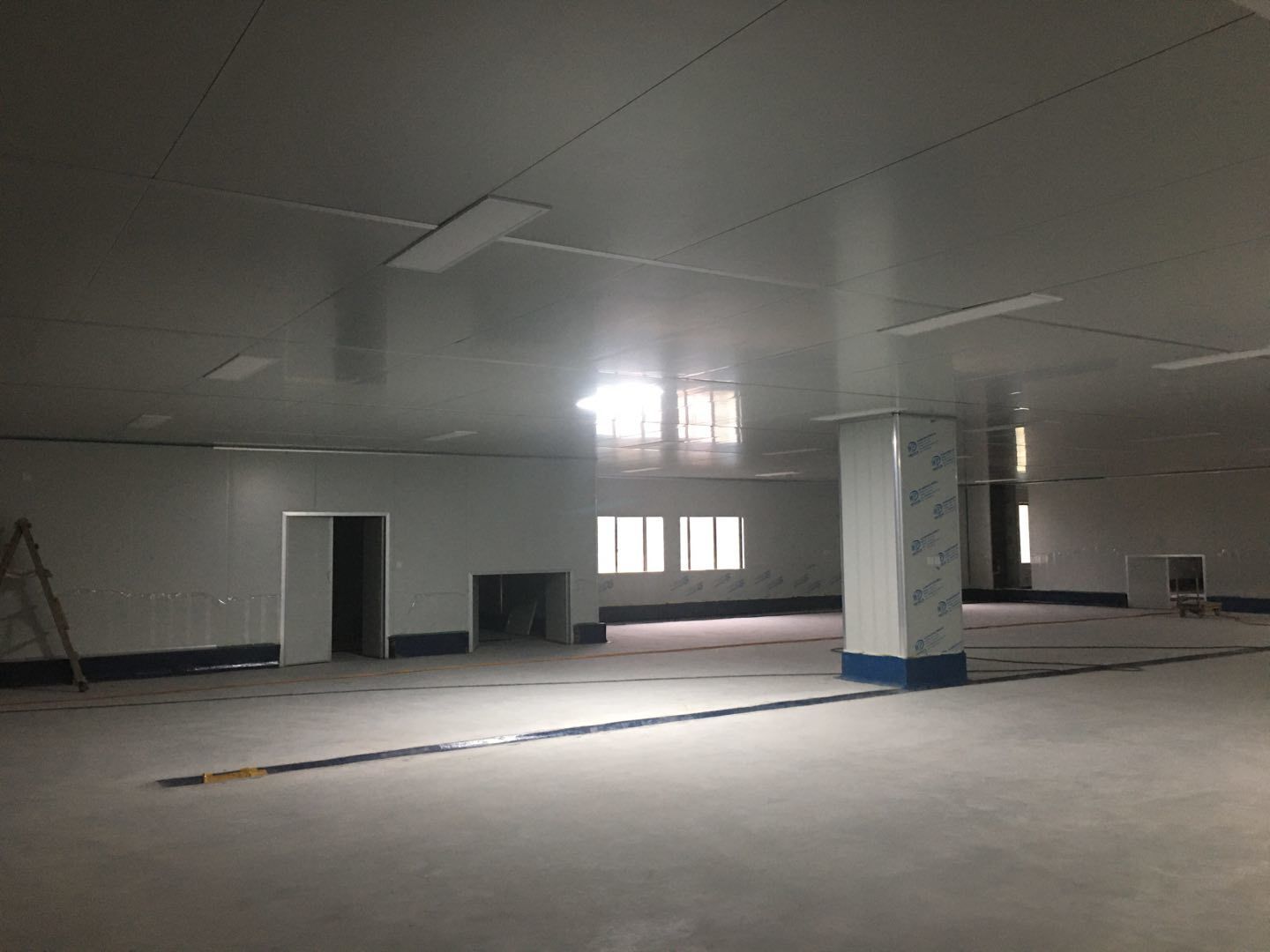 1:彩板吊頂全部門框扣料完成,門板構件同步制作中。收尾工作分區域暫進行配合地坪施工。2:空調班組~風管合縫完成,完成材料轉運至二樓,主機設備到場卸裝。3:水電班組-控制線配線完成80%,樓頂配管20%左右。