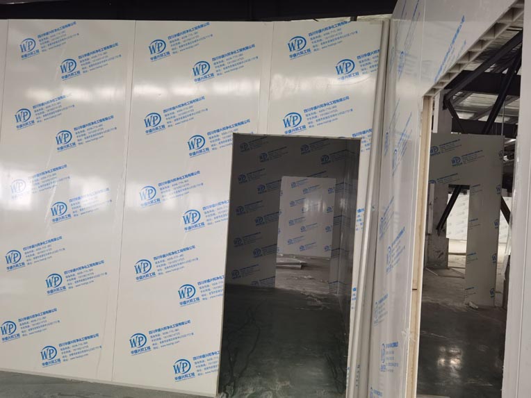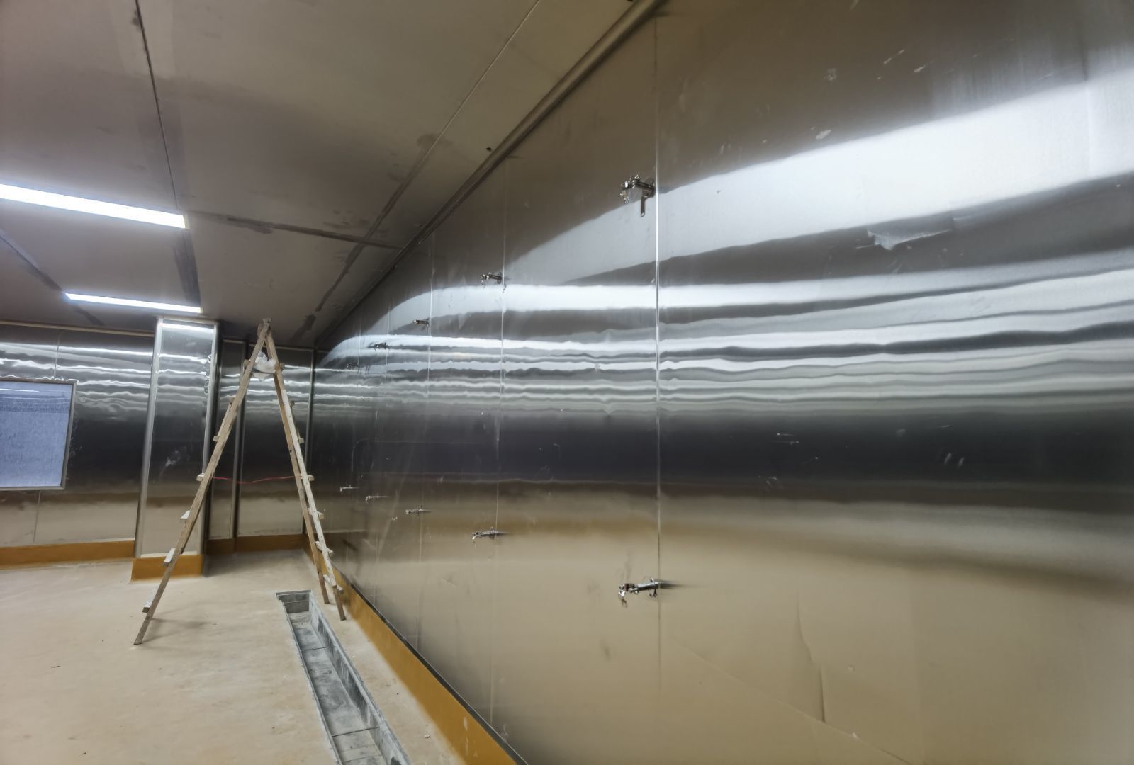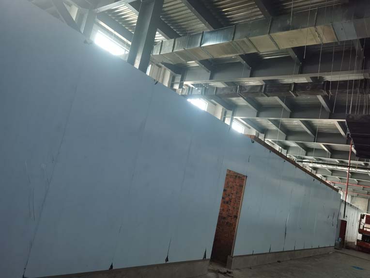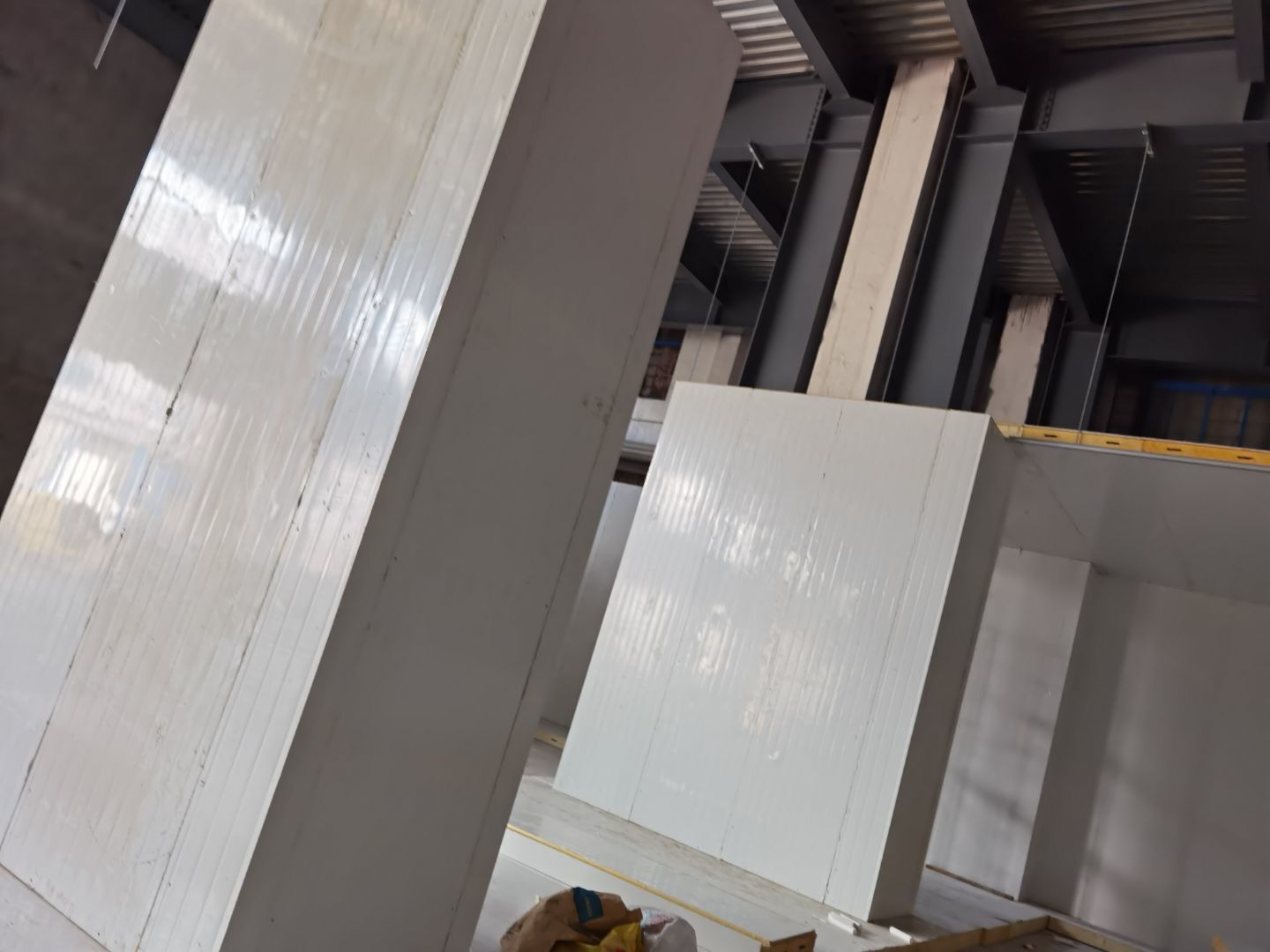 今日施工內(nèi)容 1,彩板拍圓弧 打膠 2, 二層鋁扣板安裝 3,二層風(fēng)管軟接 4,一層地坪施工 5,凍庫冷媒管安裝 6,二層墻板安裝 7,一層消防煙感安裝 8,蒸汽管道施工 9,門體安裝 今日材料進(jìn)場 彩板 消防主水管 工藝設(shè)備