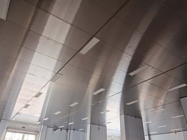 今日施工內(nèi)容 1,一二層彩板墻頂板安裝 2, 彩板打膠 拍圓弧 3,一層地坪施工 4,二層空調(diào)回風(fēng)箱安裝 5,二層空調(diào)吊柜 盤管放線 6,電梯施工 7,樓梯貼磚 8,鋁扣板絲桿吊裝