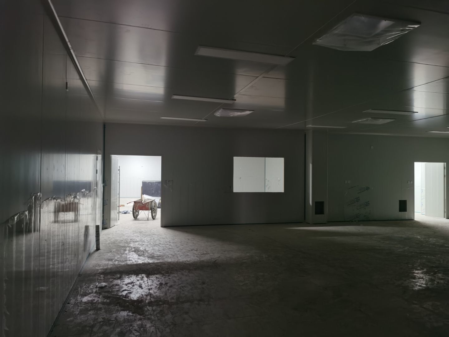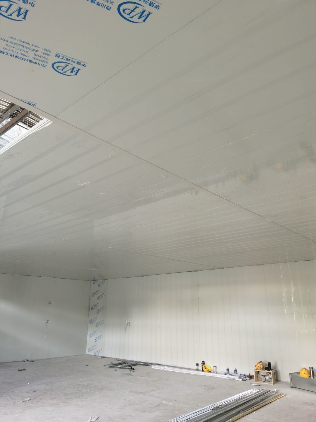 1,彩鋼墻板立板除預留設備外完成100% 2,彩鋼板吊頂除預留外,完成95% 3,三防板吊頂完成100% 4,水電安裝完成60% 5,彩鋼板收尾工作完成30%