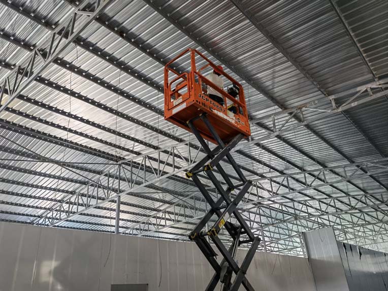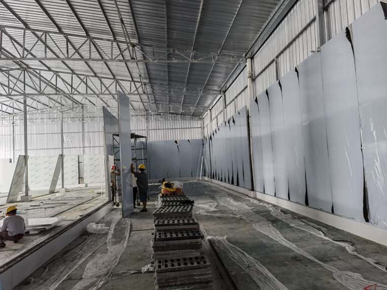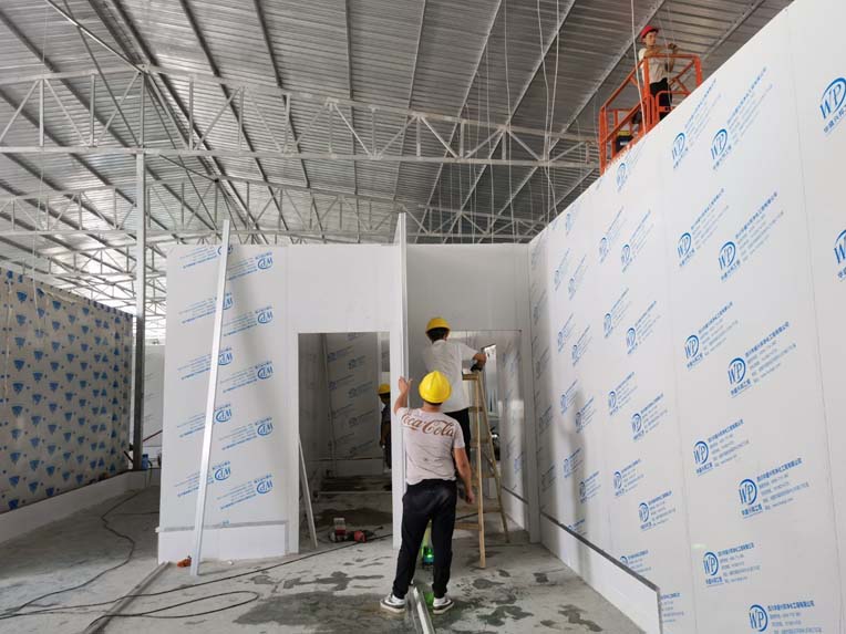 1.彩鋼墻板安裝完成。 2.彩鋼頂板開始施工
