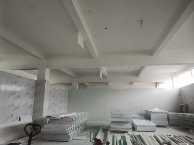 1.頂板安裝完成100%; 2.三防板吊頂完成100%; 3.水電安裝完成90%,燈具安裝完成95%; 4.新增動力電完成90%; 5.衛生間隔墻完成100%; 6.腳踏池完成100%; 7.風淋室制作完成90%; 8.地坪膩子層完成80%; 9.場地清理。