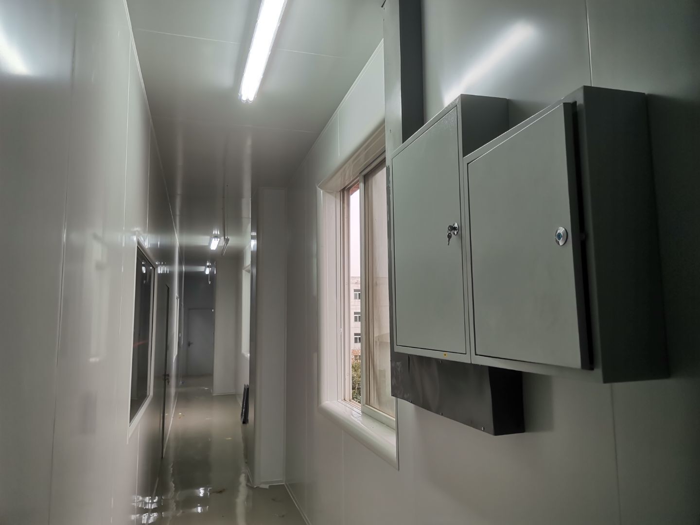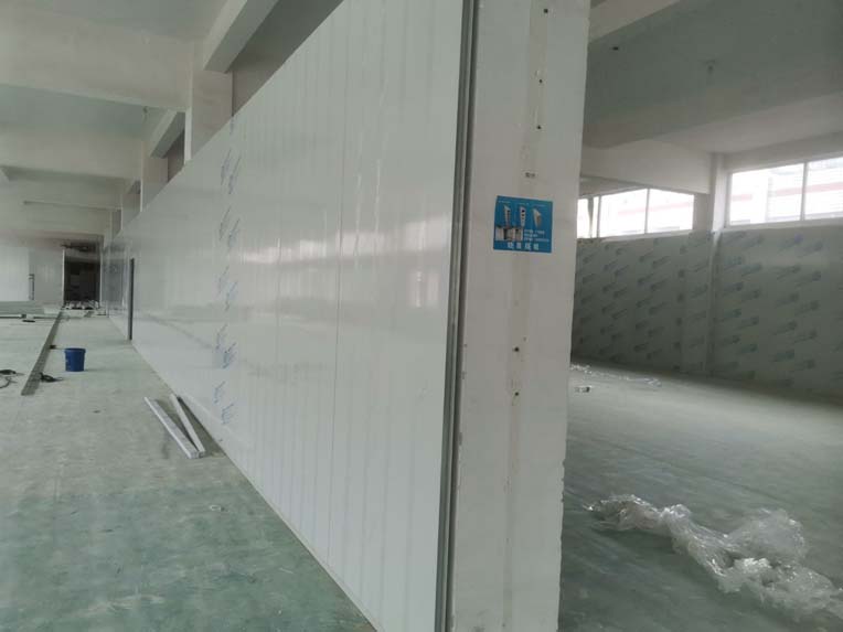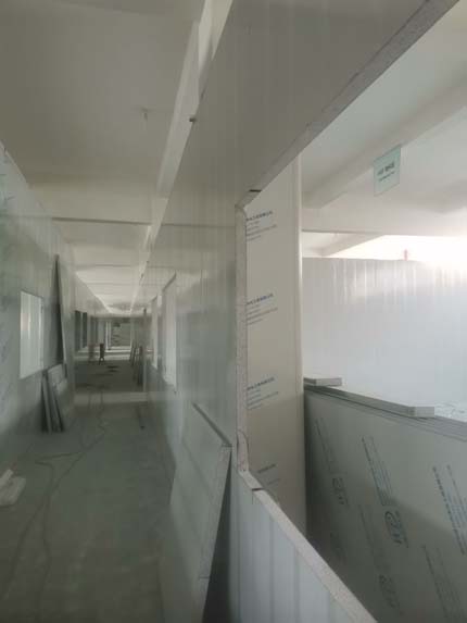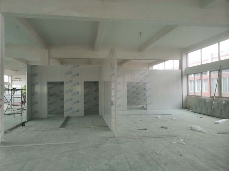 1.墻板安裝完成95%(因預留設備通道,待進場后實施; 2.地槽安裝完成95%; 3.頂板安裝完成80%; 4.彩鋼自制門安裝完成30%; 5.窗洞開設完成100%; 6.三防板吊頂完成20%; 7.水電安裝完成5%