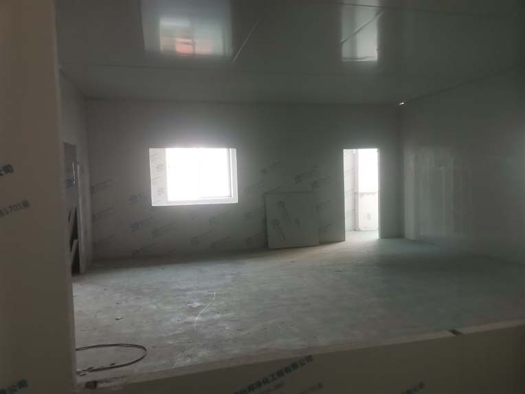 1.頂板安裝完成100%; 2.三防板吊頂完成100%; 3.水電安裝完成100%,燈具安裝完成100%; 4.新增動力電完成100%; 5.衛生間隔墻完成100%; 6.腳踏池完成100%; 7.風淋室制作完成100%; 8.地坪膩子層完成100%; 9.板縫及地面縫隙處理完成70%; 10.場地清理。