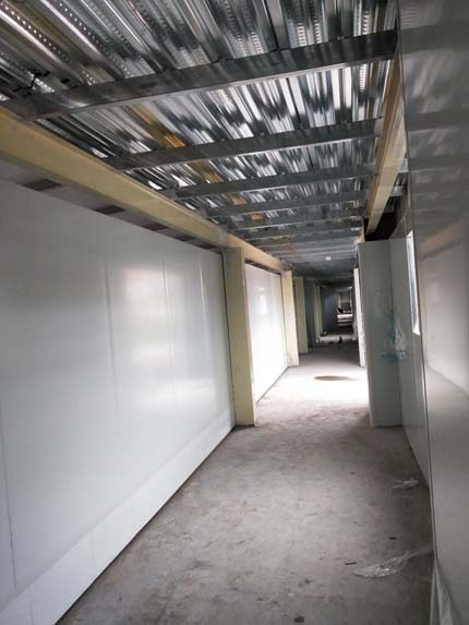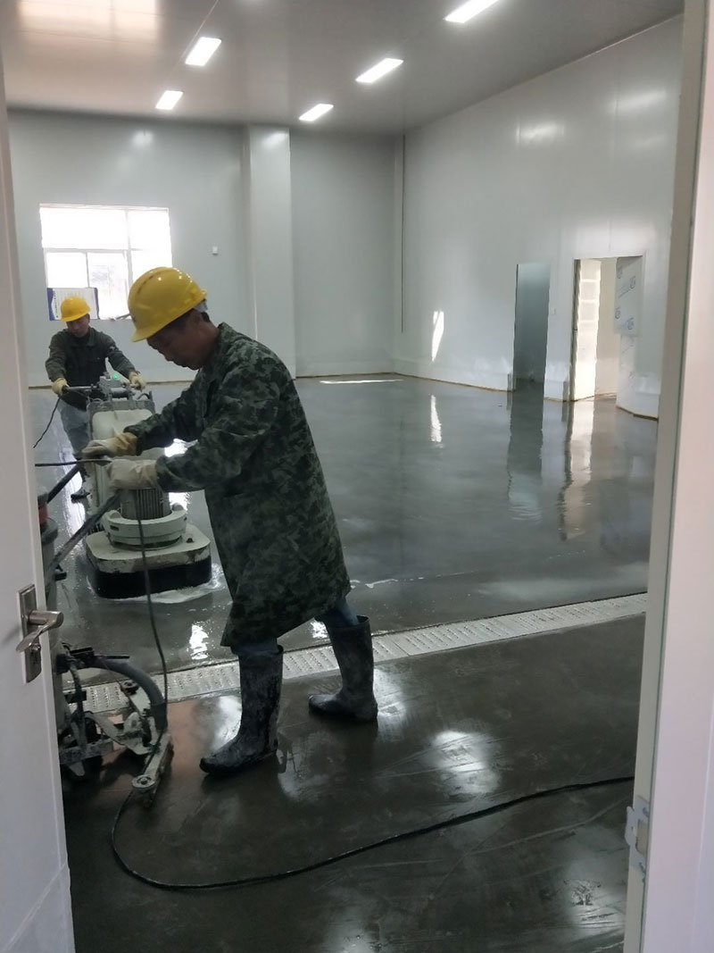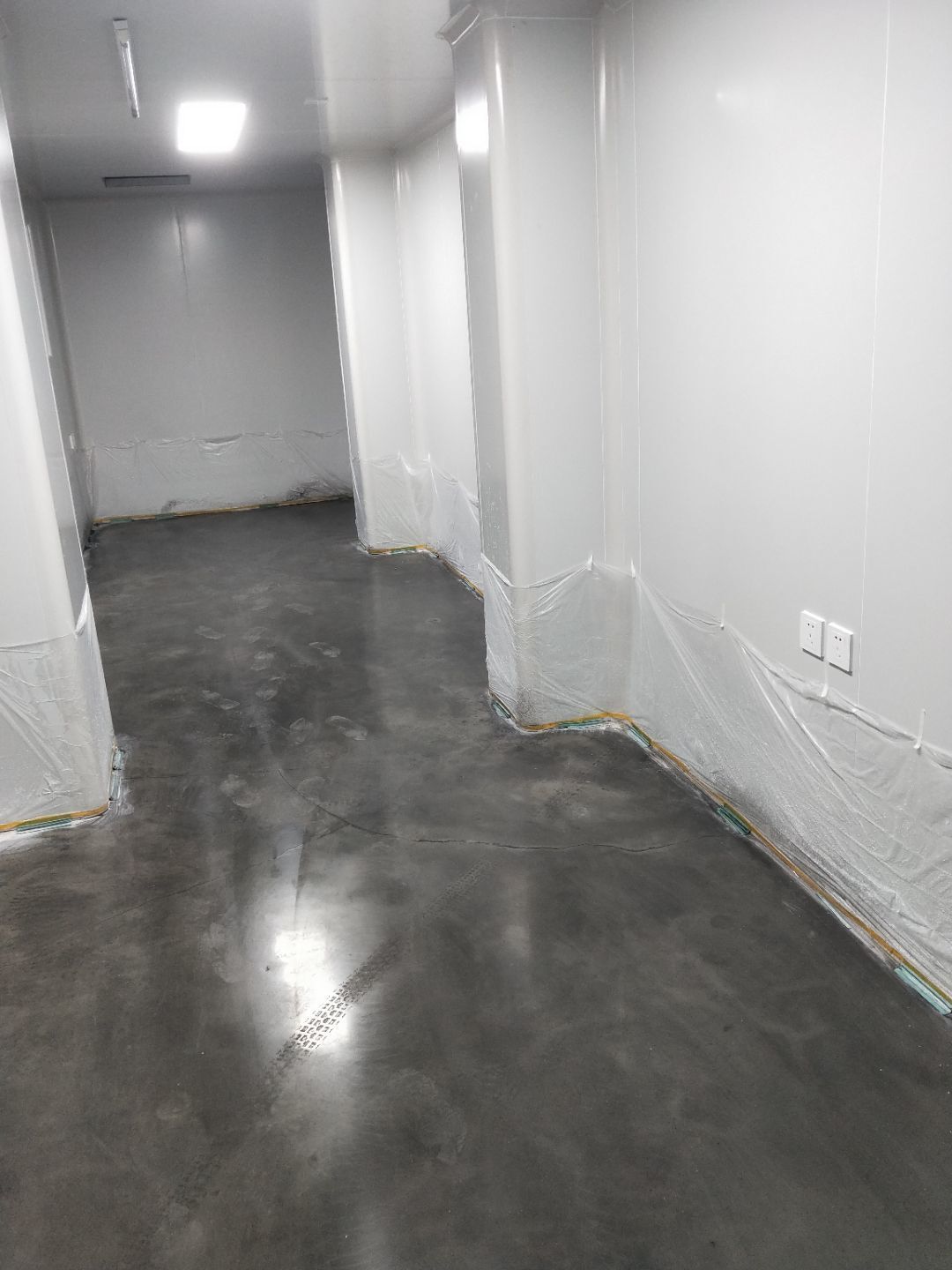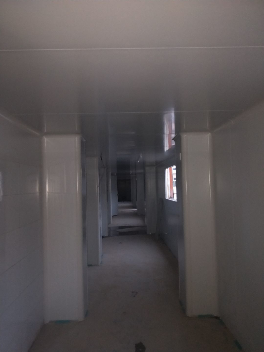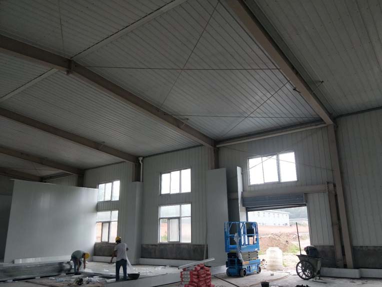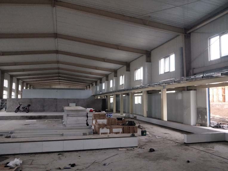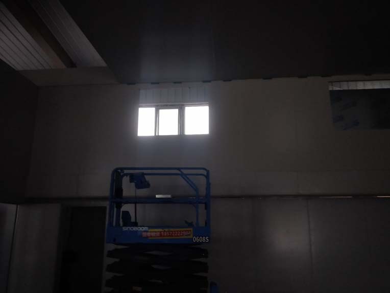 1:彩鋼墻板完成98% 2:彩鋼頂板完成100% 3:撕膜打膠完成90% 4:自制門窗完成95% 5:水電完成70% 6:圓弧完成80% 7:金剛砂完成100% 8:三防板吊頂完成100% 9:地面固化完成30%