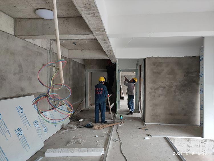 ?1,二樓更衣區彩鋼板隔墻完成; 2,2,3,4樓腳踏池修邊完成; 3,1樓固化完成30%