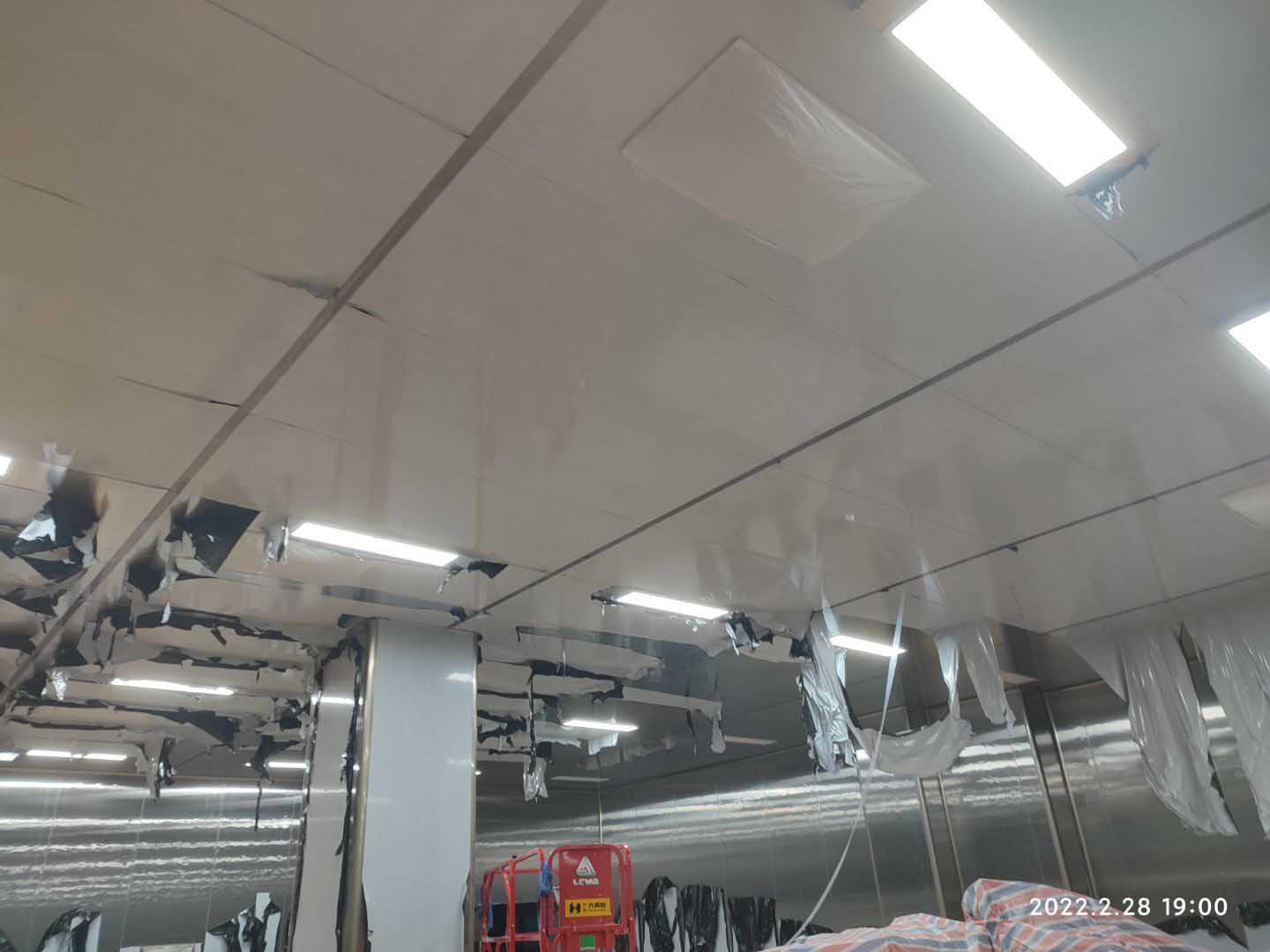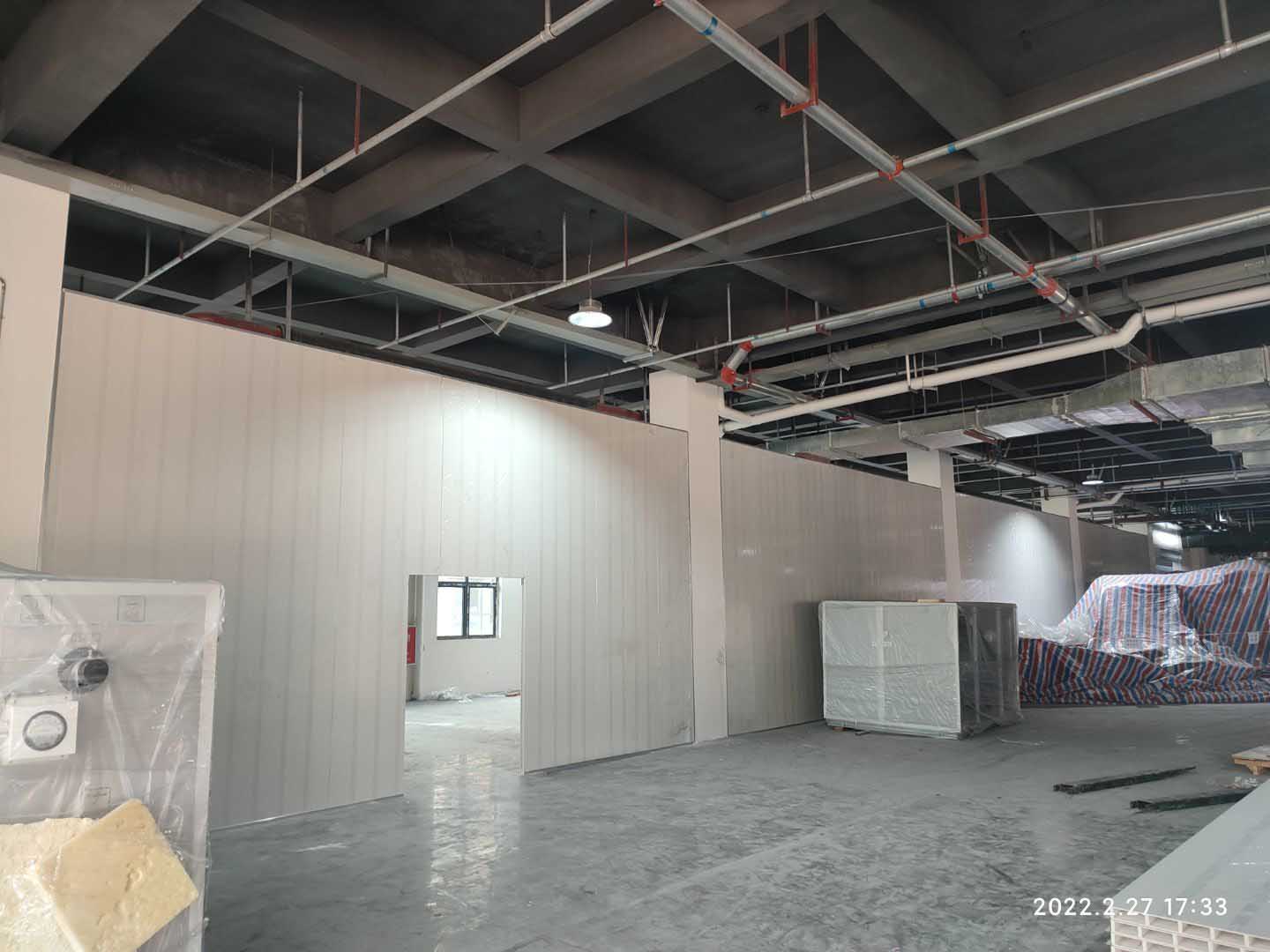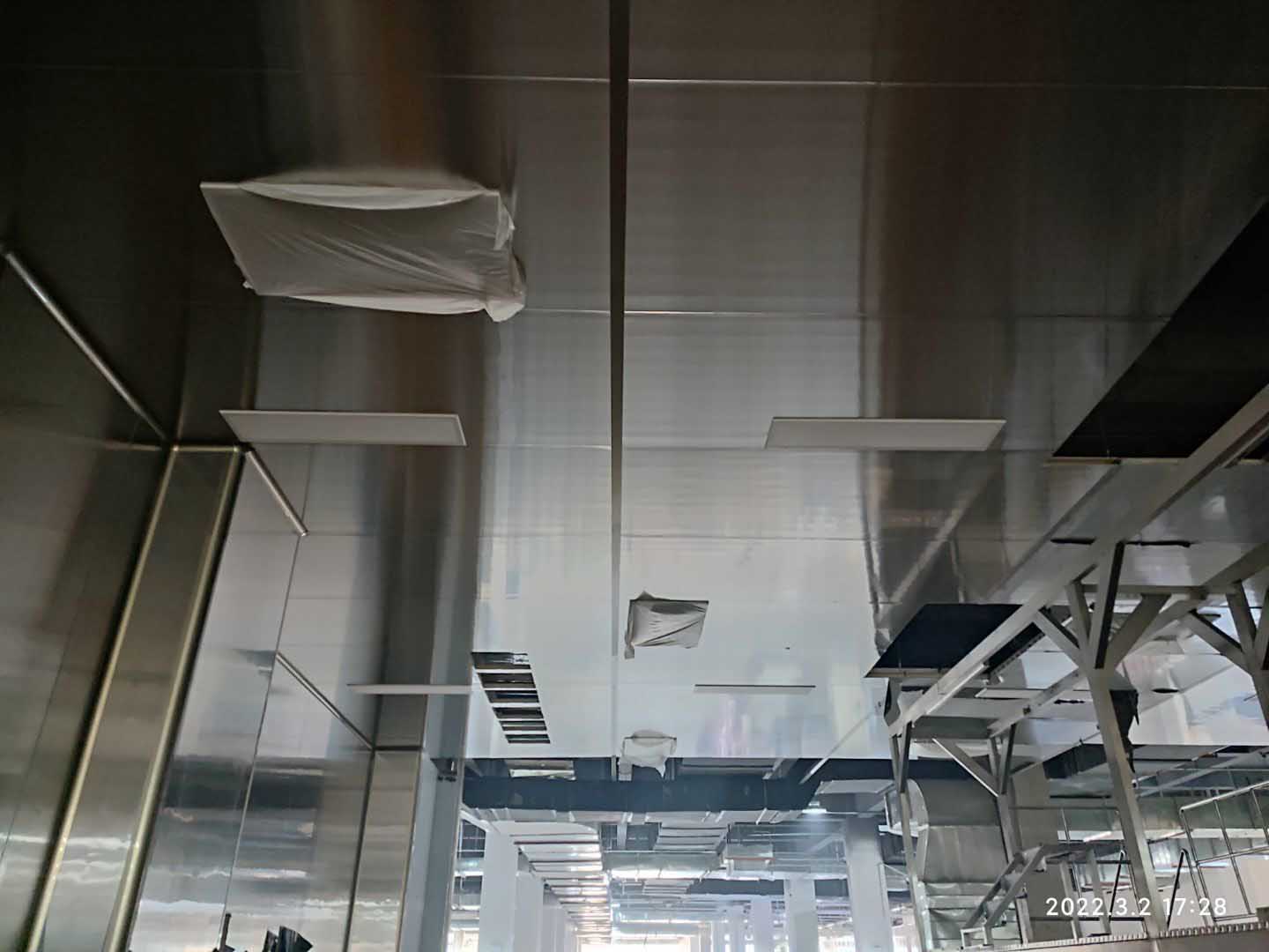 1,彩鋼板吊頂完成85% 2,組空配管完成30% 3,照明插座布線完成65%,燈具安裝完成40% 4,高效和回風末端風管尺寸量取完成。