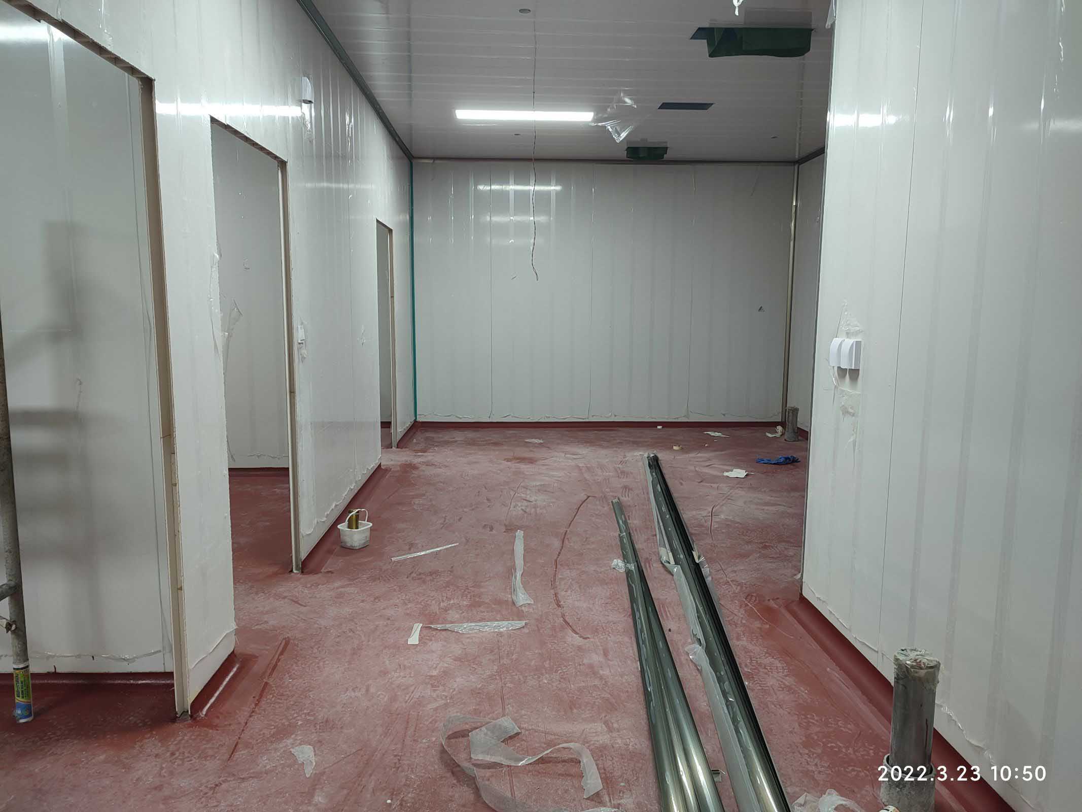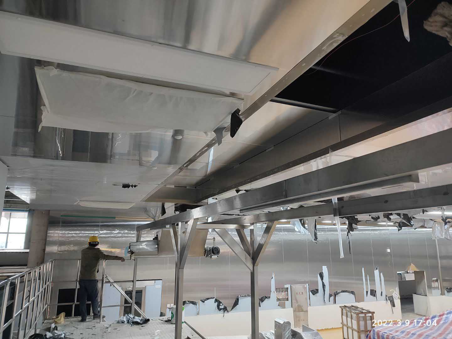 1,彩鋼板工程整體完成90%; 2,照明完成92%,插座完成90%; 3,空調末端風管安裝完成90%,高效濾芯及擴散孔板完成80%,1,2號機組空吹完成。