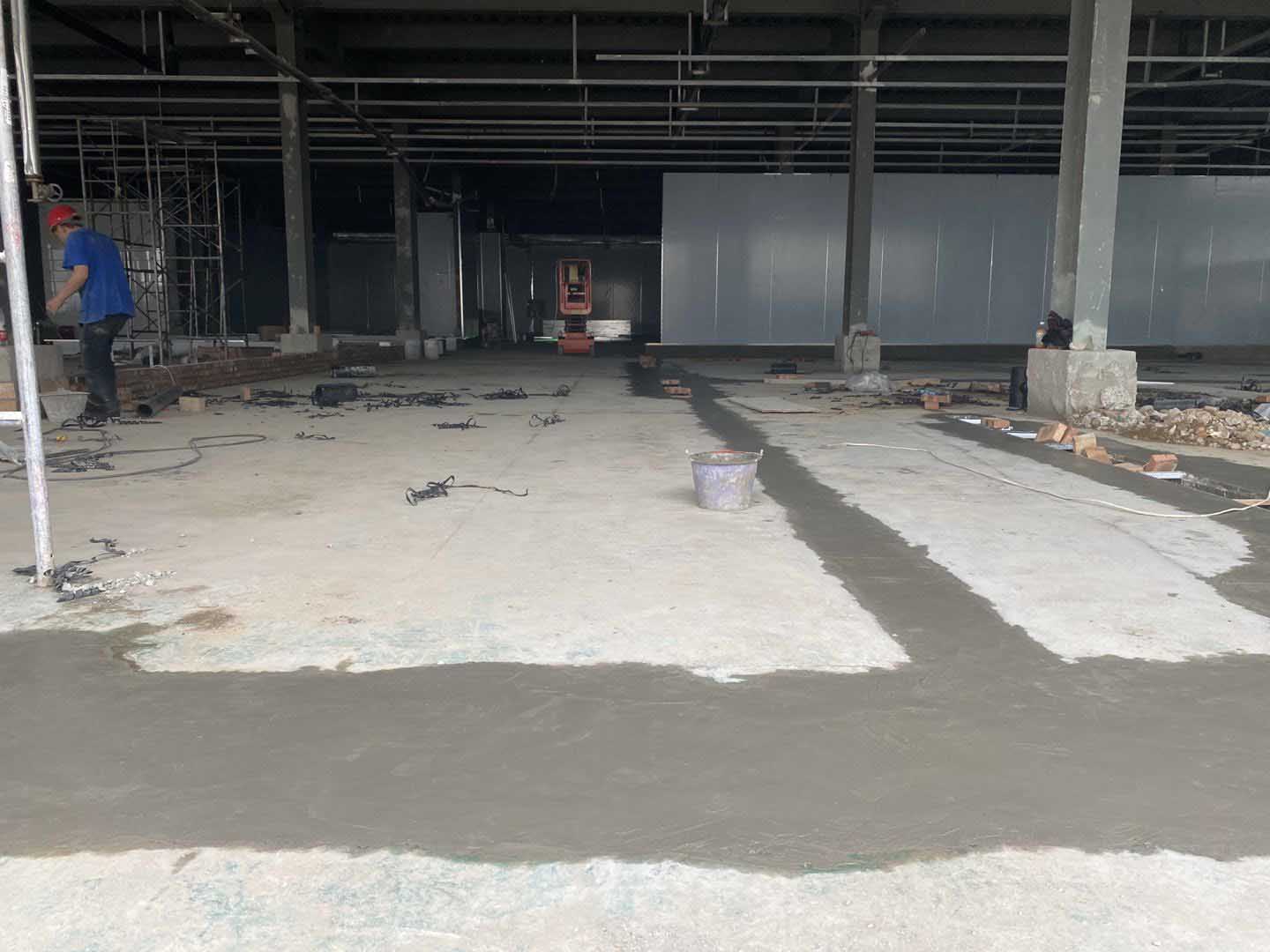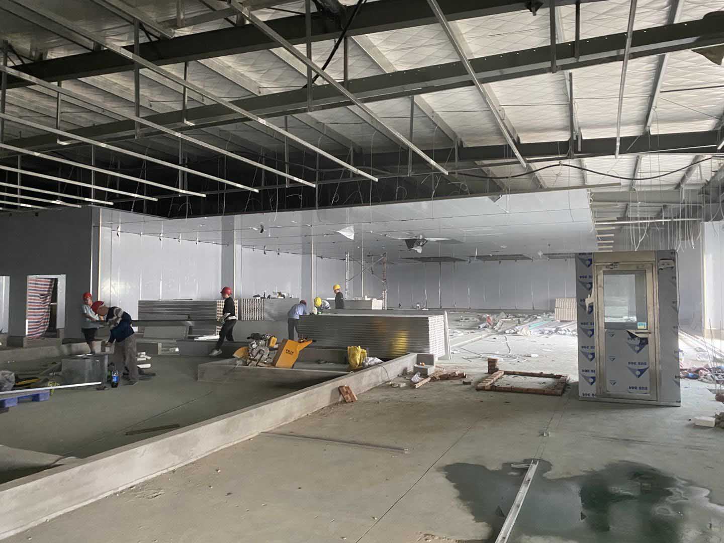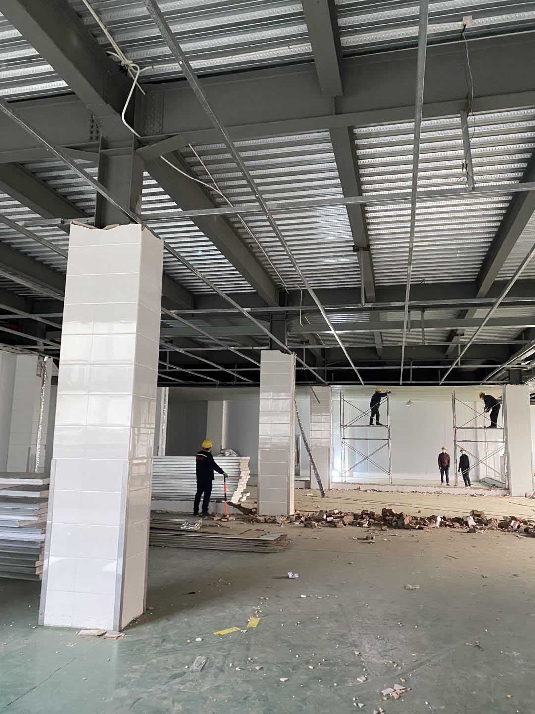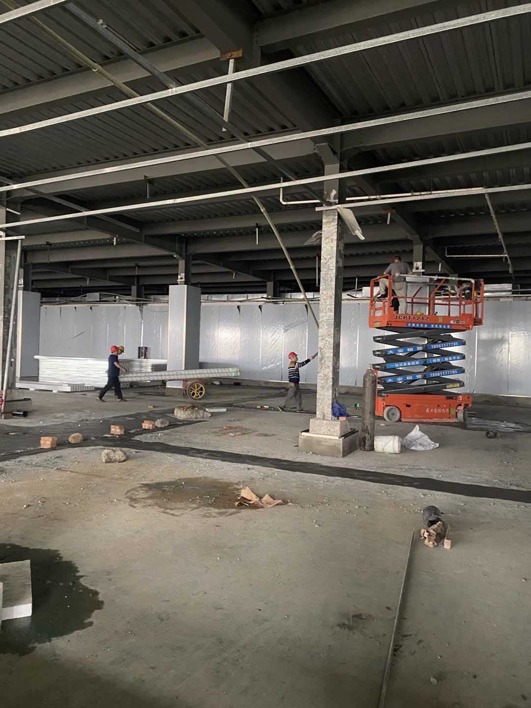 1、三車間環氧地坪超耐磨面層施工完成、二車間增加環氧地坪工程量打磨和底涂施工; 2、增項彩鋼隔墻板施工、門安裝; 3、風機電源接駁、排氣扇波紋管更換安裝; 4、土建擋水墻、門洞貼磚勾縫